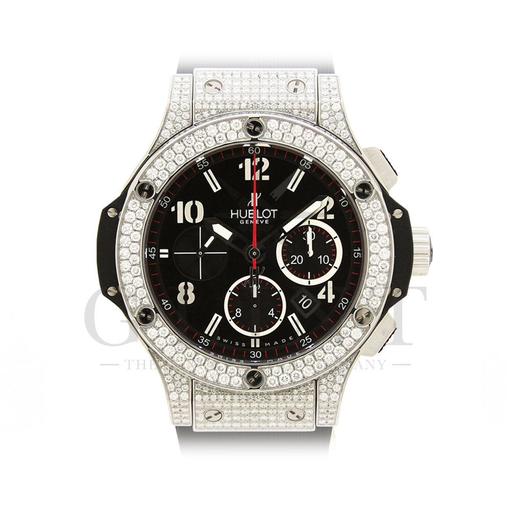 こちらはウブロ ビッグバン スティール パヴェです。ステンレススティール製の素材にベゼルとラグへダイヤモンドがパヴェセッティングされたラグジュアリー仕様の豪華なモデルとなります。デイト表示とクロノグラフを備えるなど機能性も優れており、ケースバックからはムーブメントの動きも見る事が出来、時計の魅力も存分に楽しめる逸品です。シックで落ち着いた雰囲気ながらも、豪華に敷き詰められたウブロ純正ダイヤモンドが周囲の視線を独占してくれることは間違いありません。