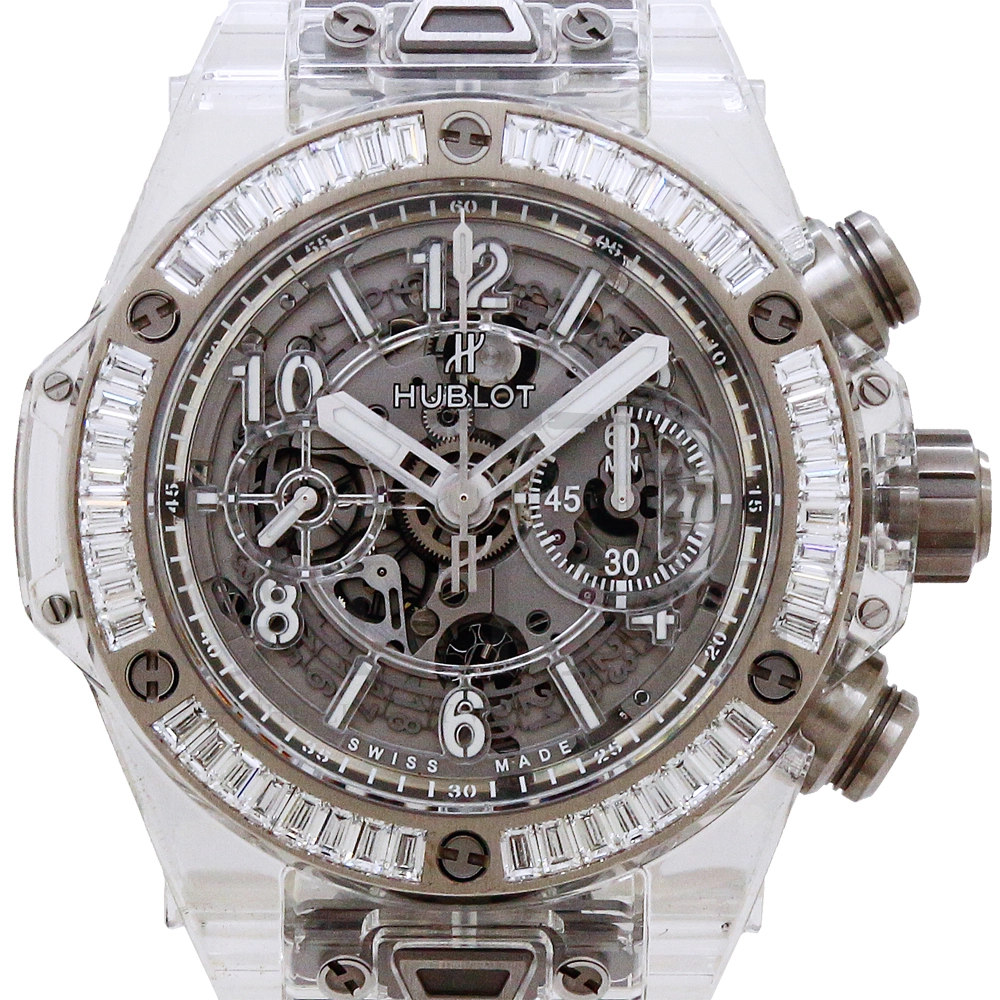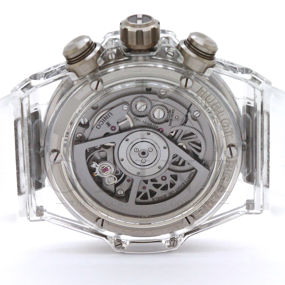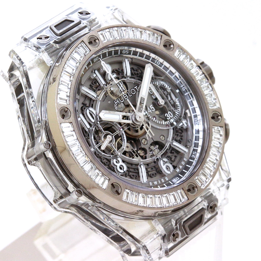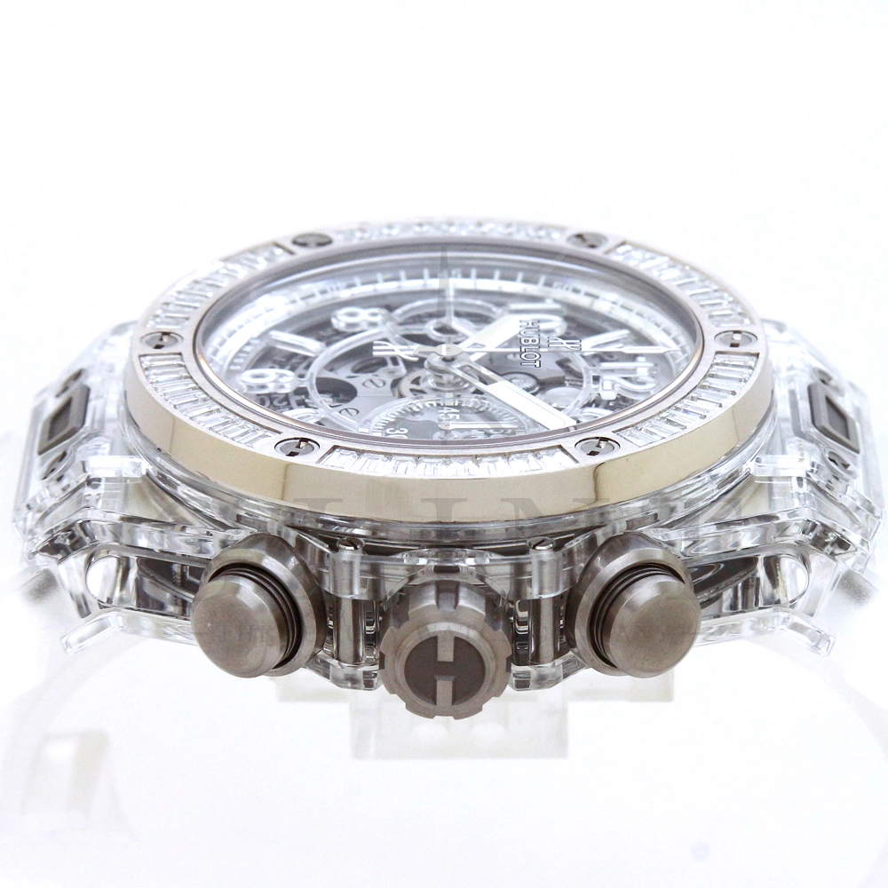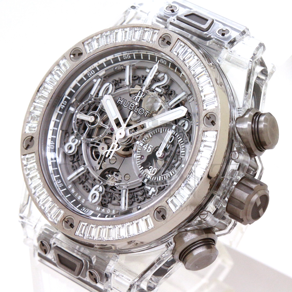 こちらはウブロ ビッグバン ウニコ サファイア 世界限定500本モデルです。2016年のバーゼルワールドで発表されたまさにウブロらしく斬新で独創的な一本。硬度が非常に高く、サファイアクリスタルをケース素材に採用し、完全なるスケルトンを実現しています。ムーブメントには自社開発された「ウニコ(Cal.HUB1242)」を搭載。どの角度からもムーブメントの動きを堪能する事ができるでしょう。ストラップはスケルトンシリコンラバーを使用するなど、徹底的にこだわった仕上がりとなっており、他とは一線を画したモデルといっても過言ではございません。遊び心もあふれた雰囲気で普段のファッションのアクセントにもなるオシャレな一本です。