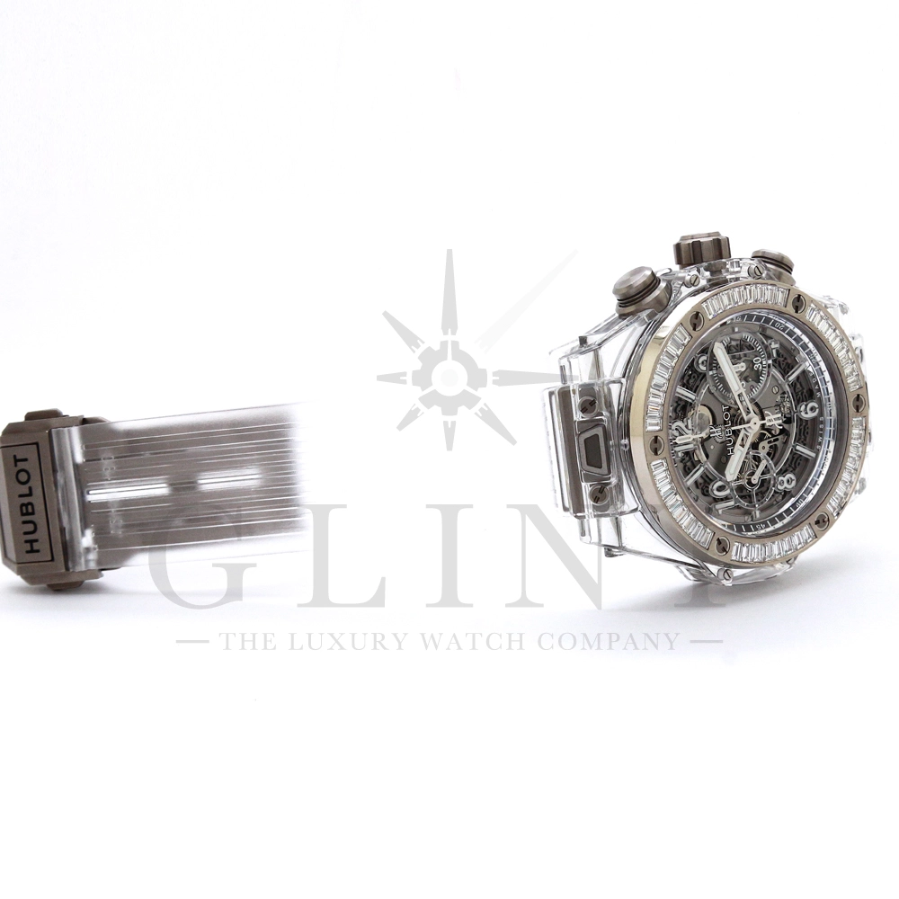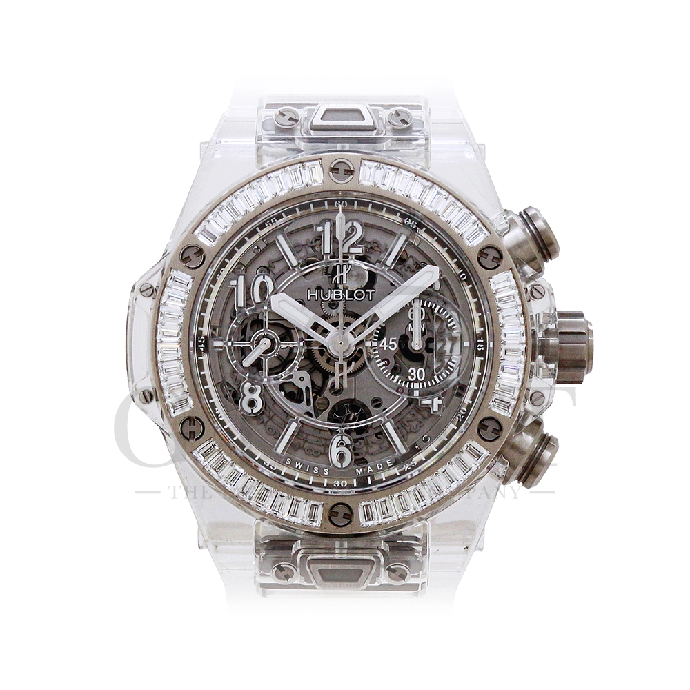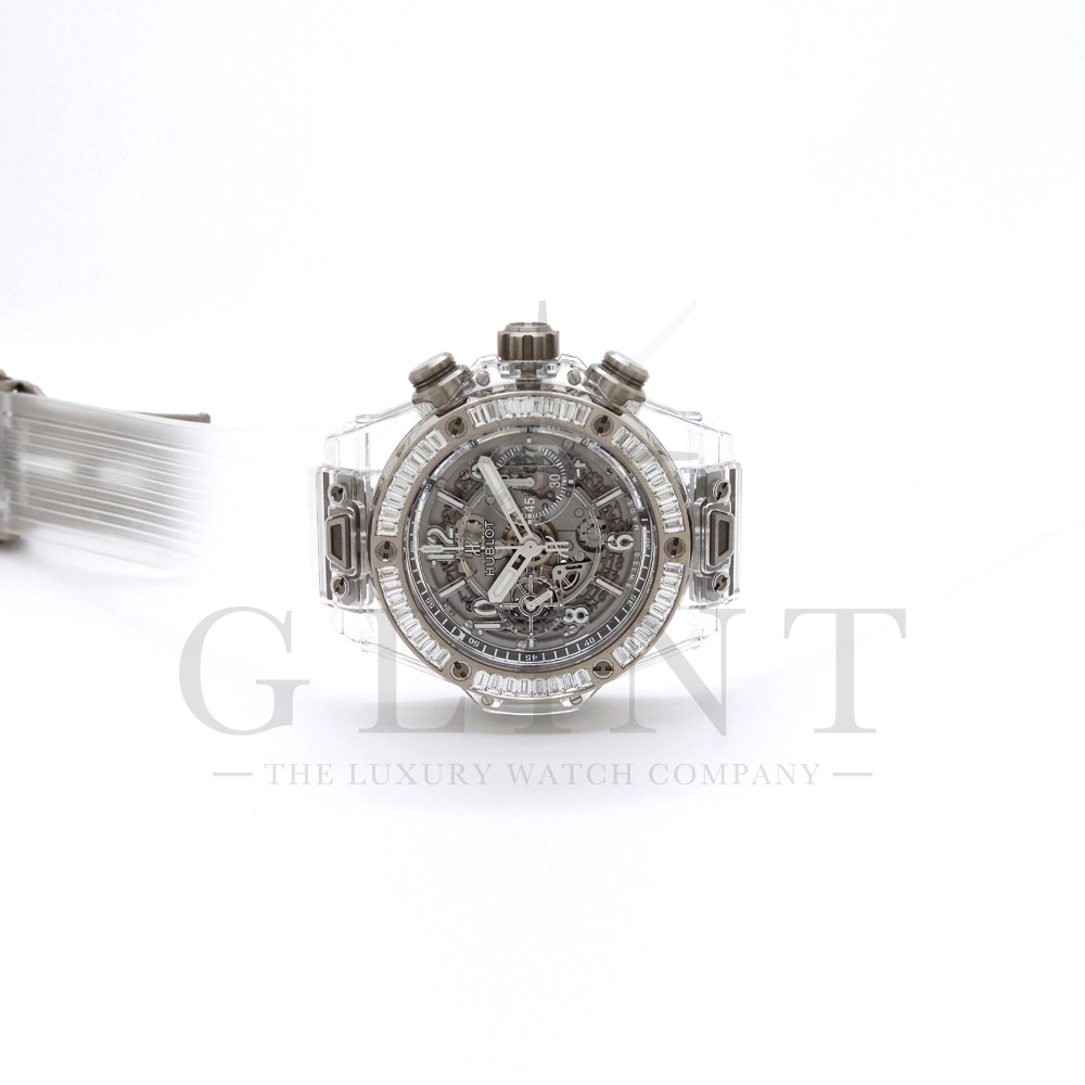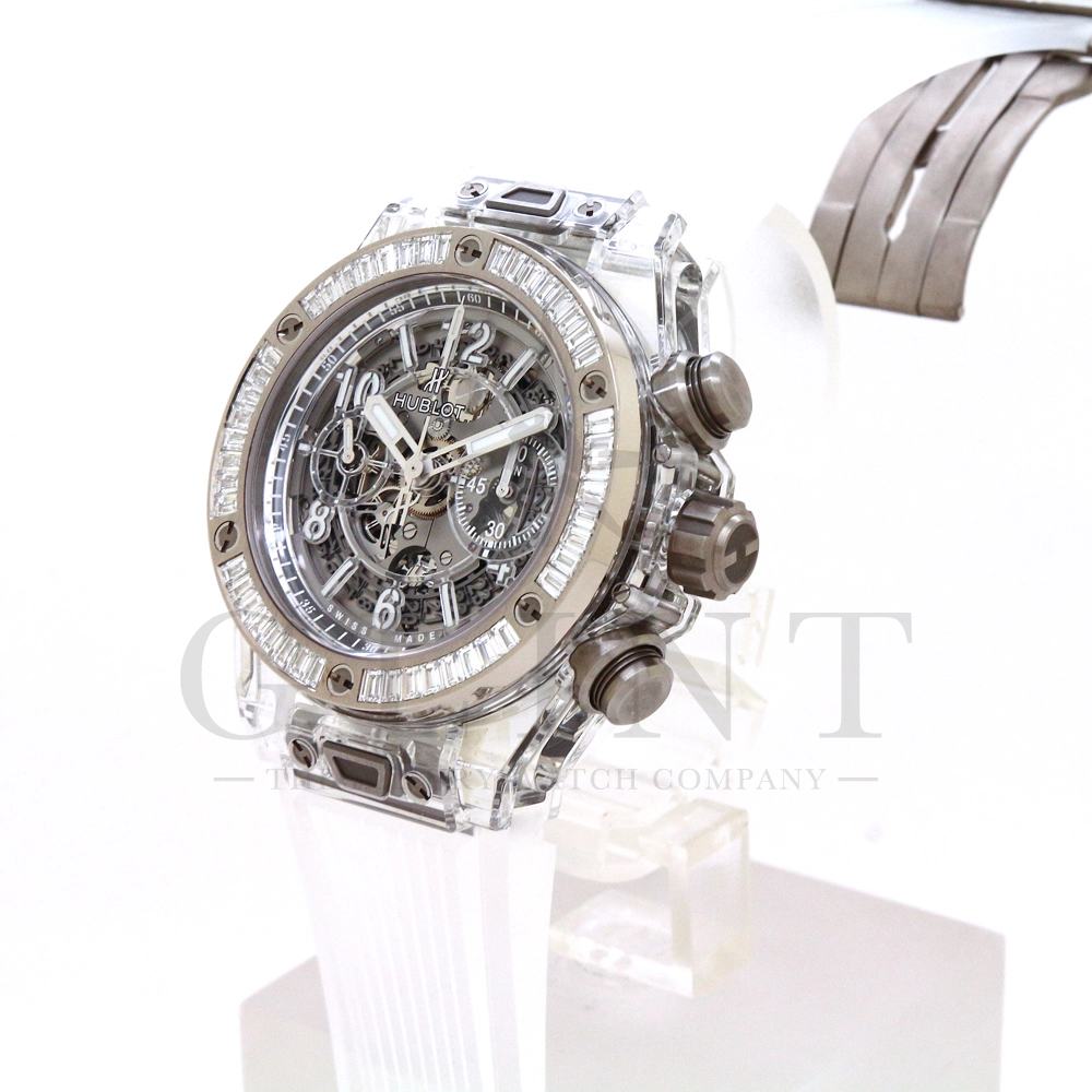 こちらはウブロ ビッグバン ウニコ サファイア 世界限定500本モデルです。2016年のバーゼルワールドで発表されたまさにウブロらしく斬新で独創的な一本。硬度が非常に高く、サファイアクリスタルをケース素材に採用し、完全なるスケルトンを実現しています。ムーブメントには自社開発された「ウニコ(Cal.HUB1242)」を搭載。どの角度からもムーブメントの動きを堪能する事ができるでしょう。ストラップはスケルトンシリコンラバーを使用するなど、徹底的にこだわった仕上がりとなっており、他とは一線を画したモデルといっても過言ではございません。遊び心もあふれた雰囲気で普段のファッションのアクセントにもなるオシャレな一本です。