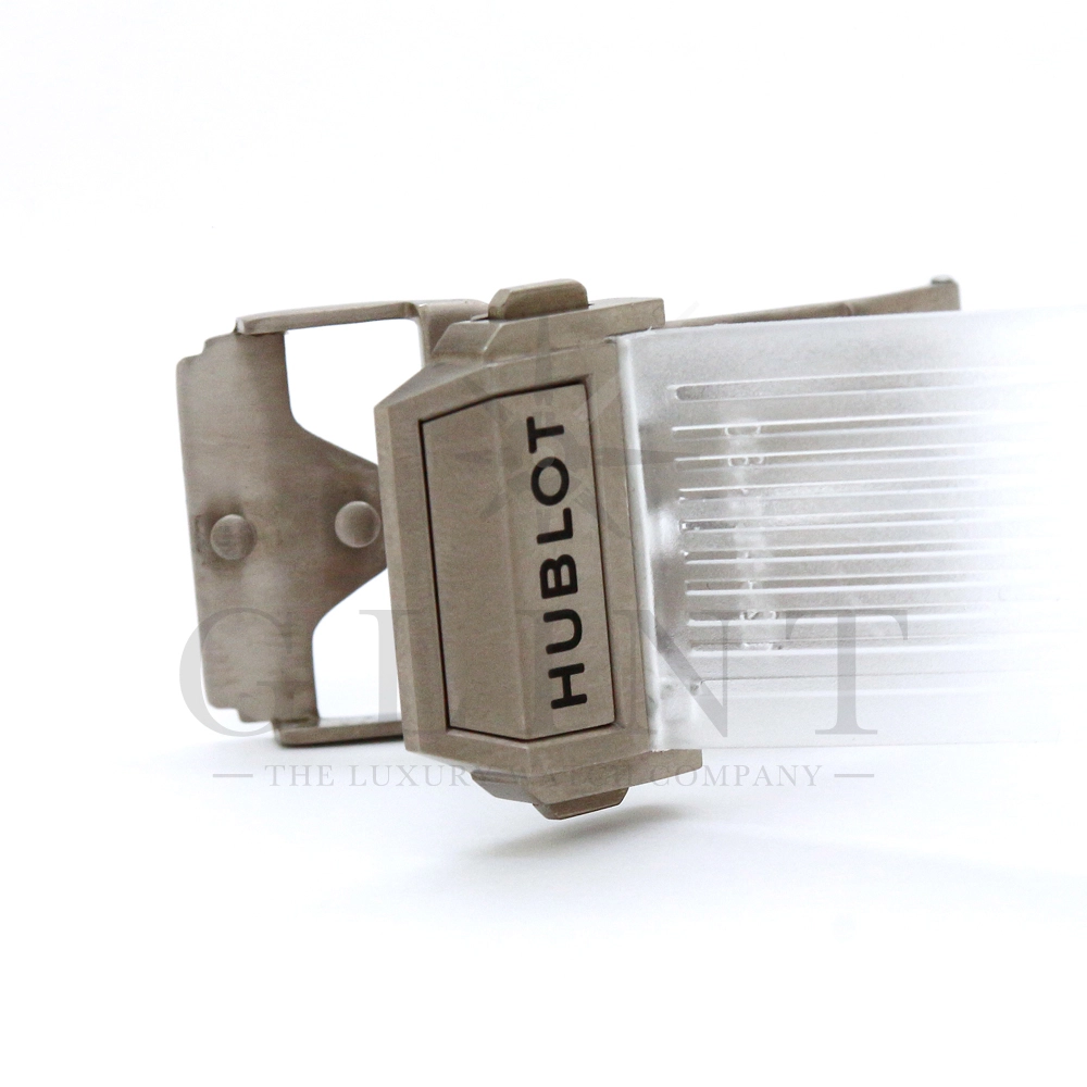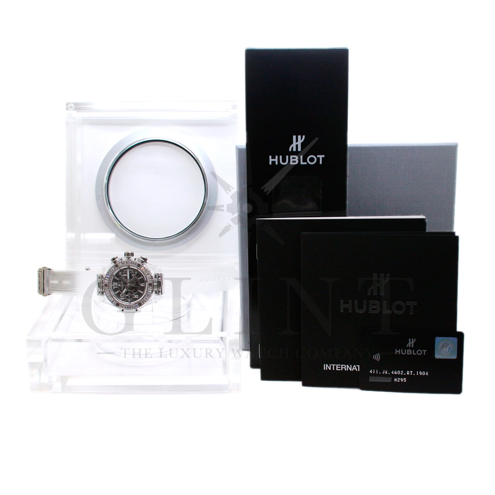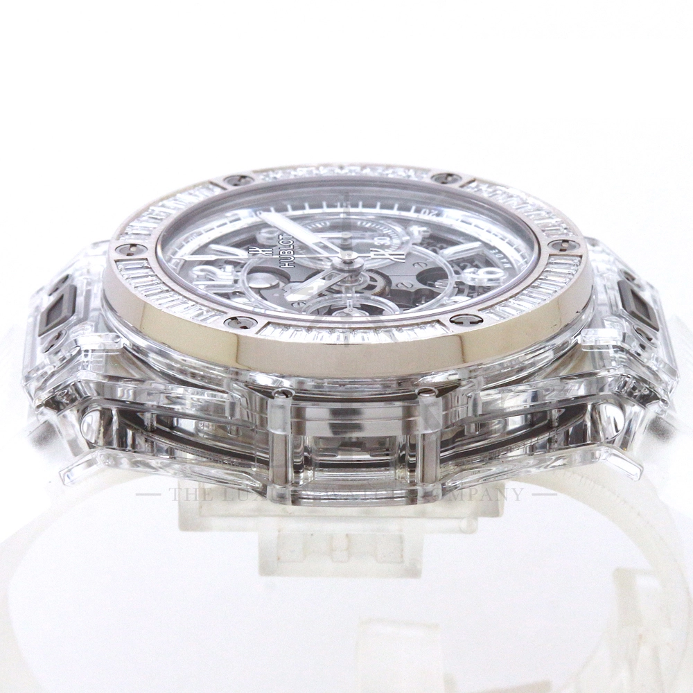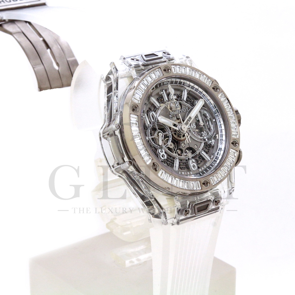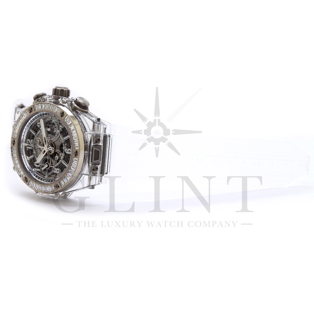 こちらはウブロ ビッグバン ウニコ サファイア 世界限定500本モデルです。2016年のバーゼルワールドで発表されたまさにウブロらしく斬新で独創的な一本。硬度が非常に高く、サファイアクリスタルをケース素材に採用し、完全なるスケルトンを実現しています。ムーブメントには自社開発された「ウニコ(Cal.HUB1242)」を搭載。どの角度からもムーブメントの動きを堪能する事ができるでしょう。ストラップはスケルトンシリコンラバーを使用するなど、徹底的にこだわった仕上がりとなっており、他とは一線を画したモデルといっても過言ではございません。遊び心もあふれた雰囲気で普段のファッションのアクセントにもなるオシャレな一本です。