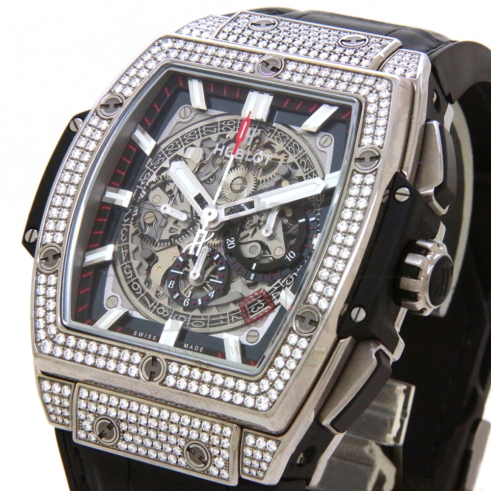こちらはウブロ スピリットオブビッグバン チタニウム パヴェ Ref.601.NX.0173.LR.1704です。その名の通り、ケース素材にチタニウムを採用したモデル。ベゼルとケースにはウブロ純正ダイヤモンドがセッティングされており、タフな印象とラグジュアリー感が見事に融合しています。ムーブメントには、ウブロ仕様として特別にデザインされた毎時36,000振動を誇るエル・プリメロ(自動巻きクロノグラフ・ムーブメント「HUB4700」)が搭載。約50時間のパワーリザーブ機能をもつ自動巻きムーブメントはスケルトン構造で、サファイアガラスのダイアルを通して、デイト・ディスクを含むスケルトン・メカニズムの美しさをご堪能いただけるでしょう。ストラップにはアリゲーターの裏側にラバーを縫合しており、高い装着感とエレガントさを体現しております。クロノグラフ機能に日付表示と実用性も申し分無い一本です。