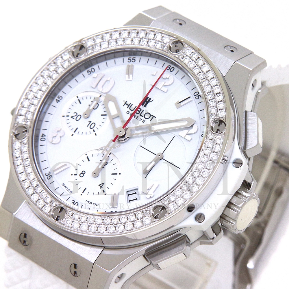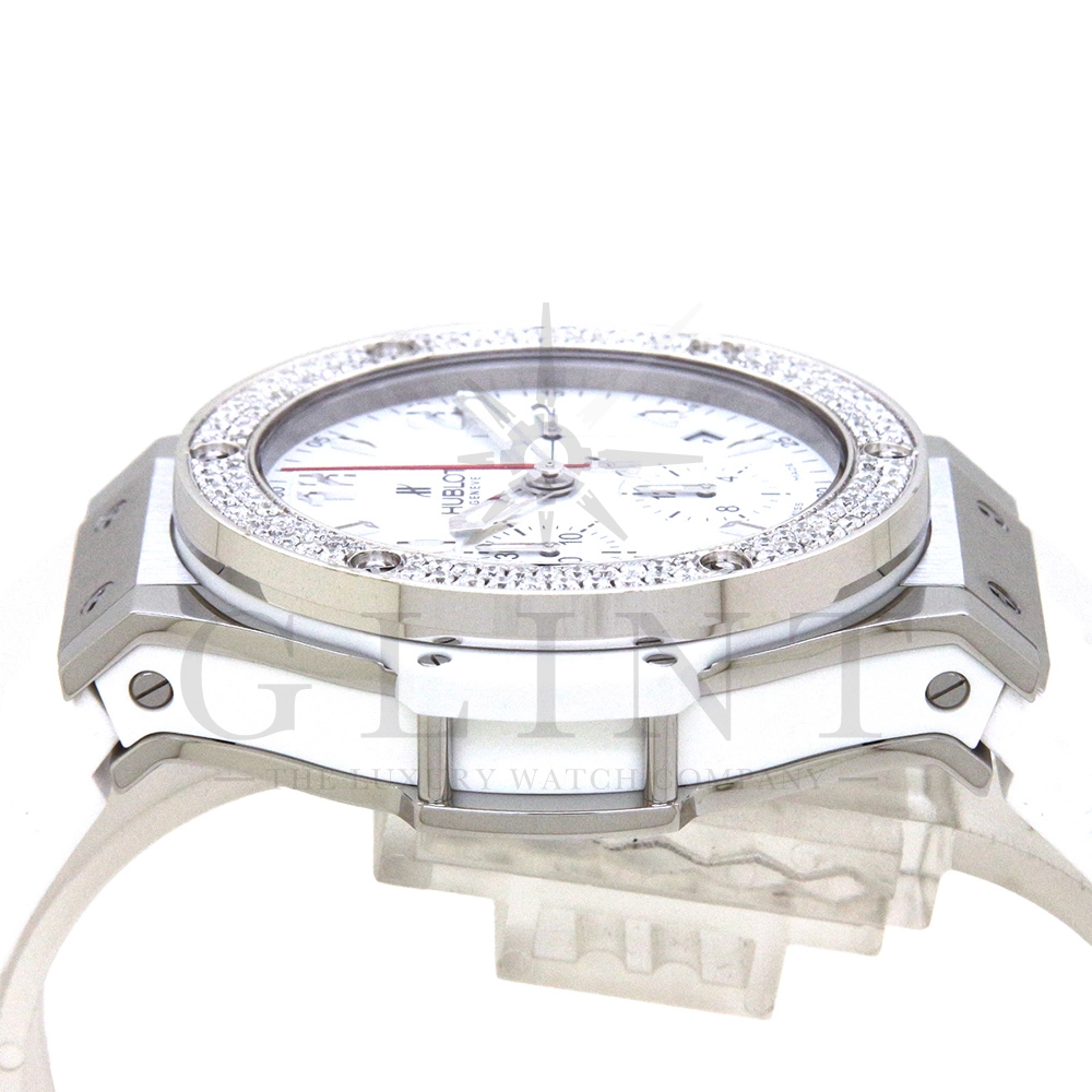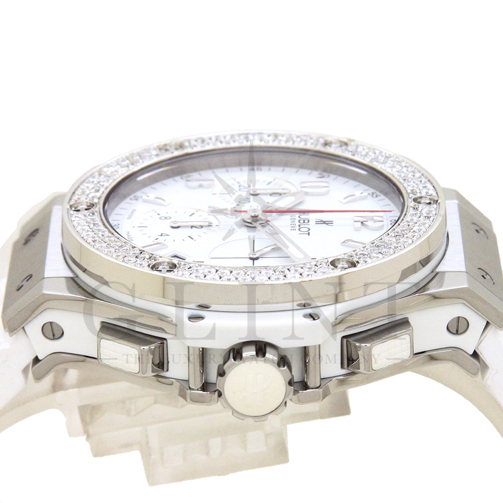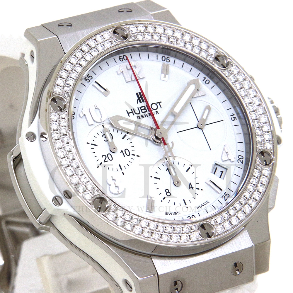 こちらはケース素材にホワイトセラミックが採用されたビッグバン アスペンです。アスペンとはホワイトポプラを意味し、モデル名の通りホワイトで統一感のある外観ながらも、スポーティでありながらエレガンスといった絶妙なデザインが特徴です。また、こちらのモデルはビッグバンの中では小ぶりなケースサイズ41mmとなり男女兼用でお使いいただけます。また、ダイヤモンドベゼルを装着した事により、より高級感を堪能できるでしょう。オシャレで爽やかなビッグバンで普段のファッションのアクセントとして楽しんでみてはいかがでしょうか。