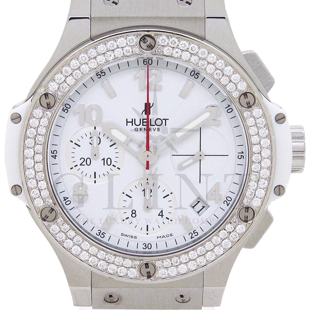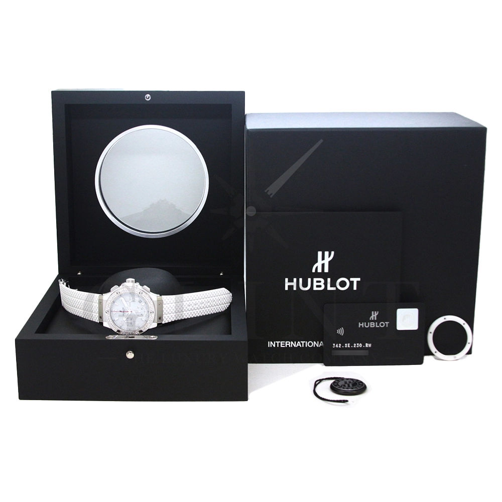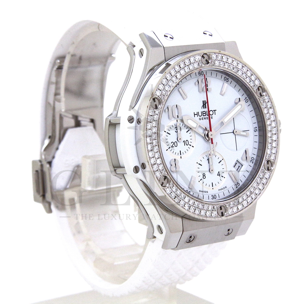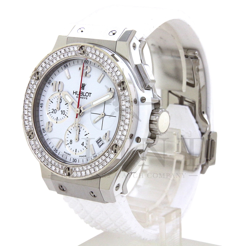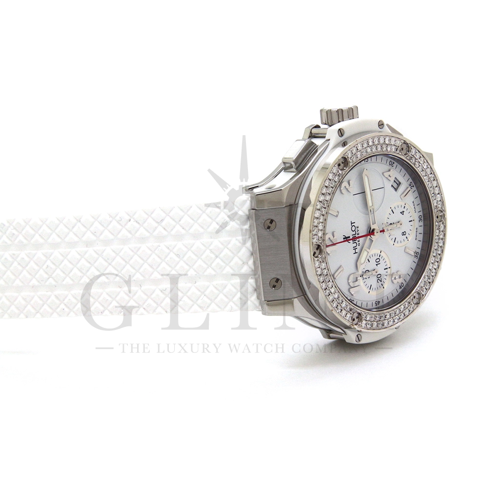 こちらはケース素材にホワイトセラミックが採用されたビッグバン アスペンです。アスペンとはホワイトポプラを意味し、モデル名の通りホワイトで統一感のある外観ながらも、スポーティでありながらエレガンスといった絶妙なデザインが特徴です。また、こちらのモデルはビッグバンの中では小ぶりなケースサイズ41mmとなり男女兼用でお使いいただけます。また、ダイヤモンドベゼルを装着した事により、より高級感を堪能できるでしょう。オシャレで爽やかなビッグバンで普段のファッションのアクセントとして楽しんでみてはいかがでしょうか。