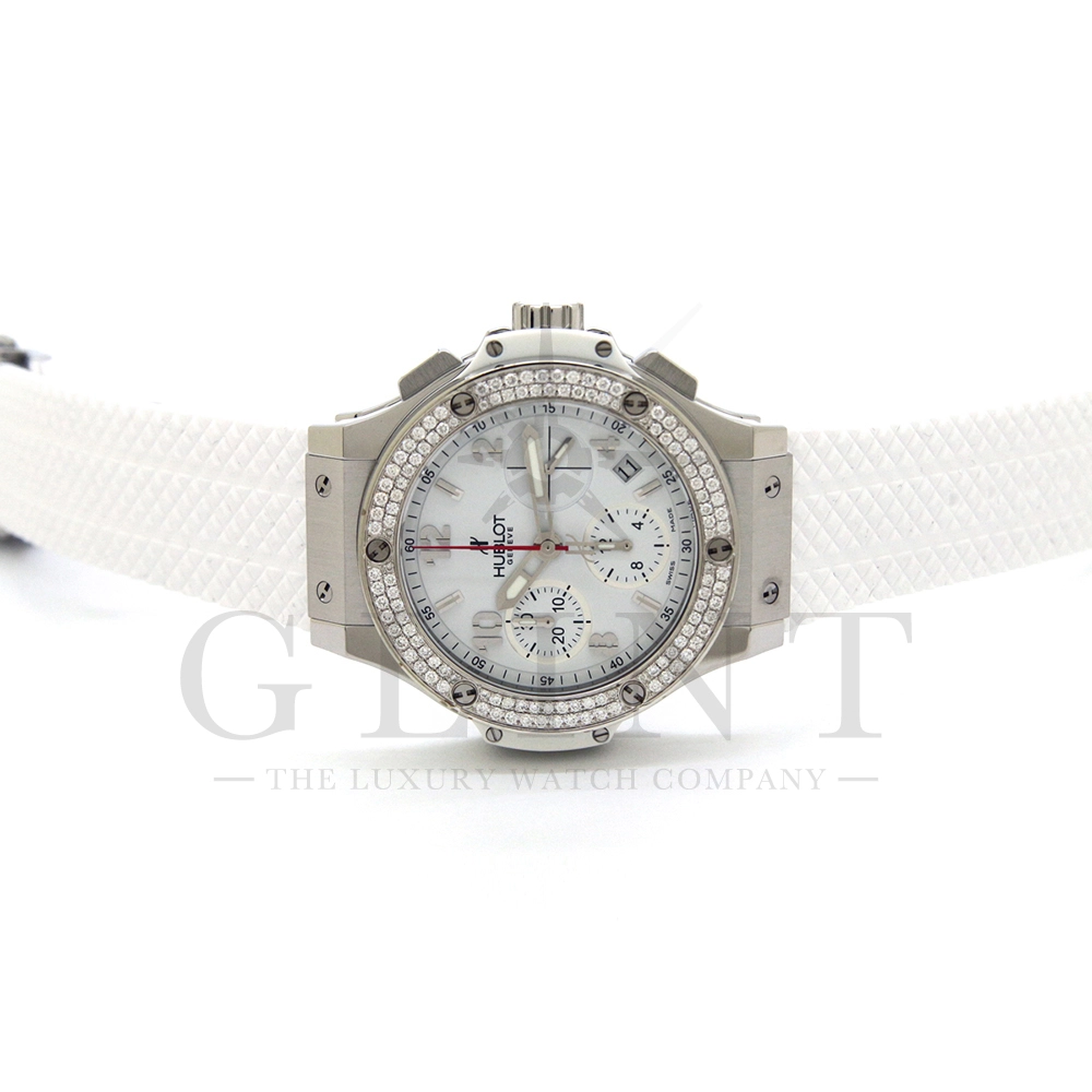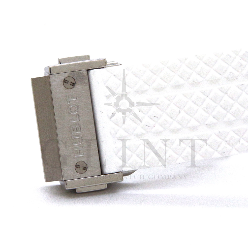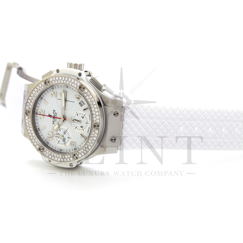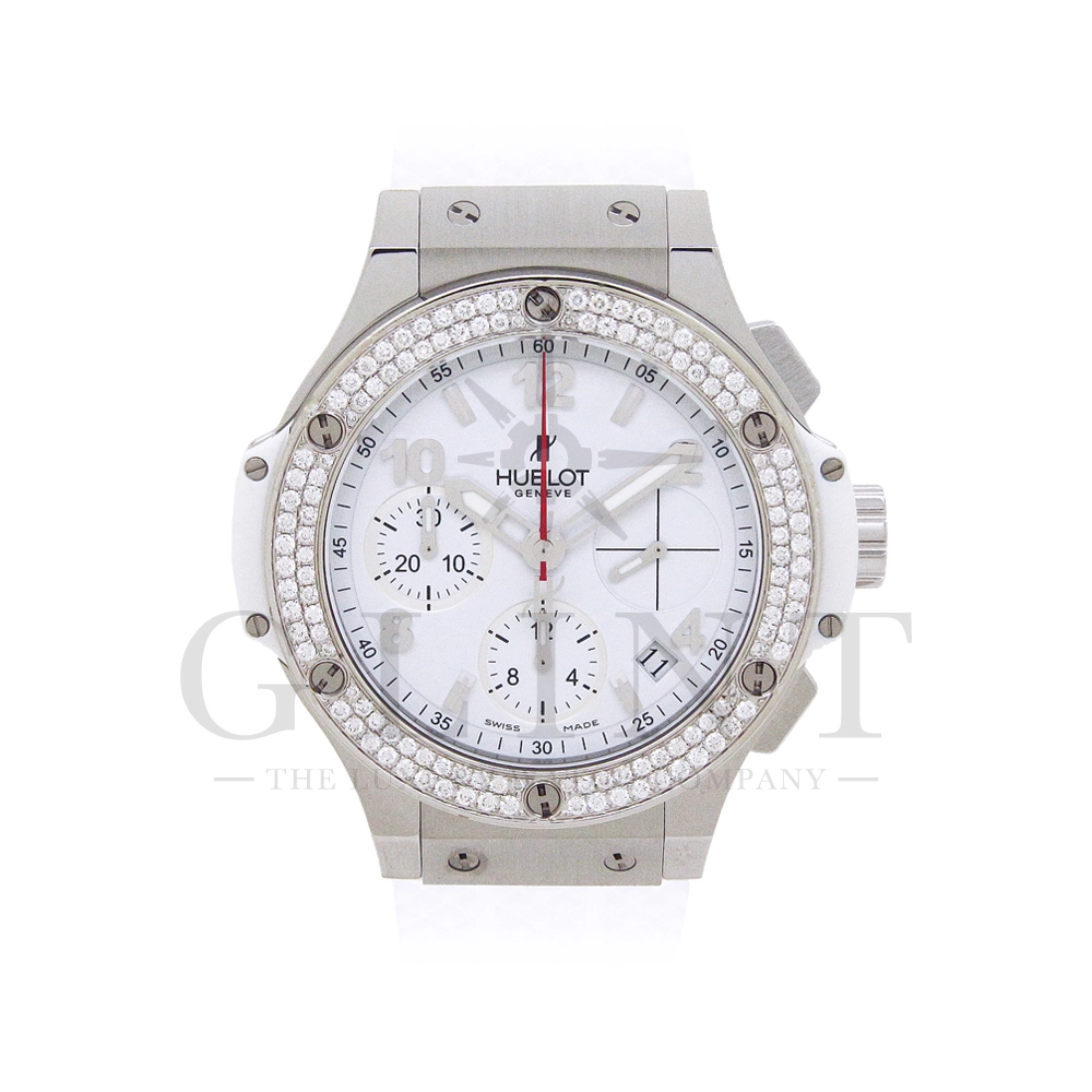 こちらはケース素材にホワイトセラミックが採用されたビッグバン アスペンです。アスペンとはホワイトポプラを意味し、モデル名の通りホワイトで統一感のある外観ながらも、スポーティでありながらエレガンスといった絶妙なデザインが特徴です。また、こちらのモデルはビッグバンの中では小ぶりなケースサイズ41mmとなり男女兼用でお使いいただけます。また、ダイヤモンドベゼルを装着した事により、より高級感を堪能できるでしょう。オシャレで爽やかなビッグバンで普段のファッションのアクセントとして楽しんでみてはいかがでしょうか。