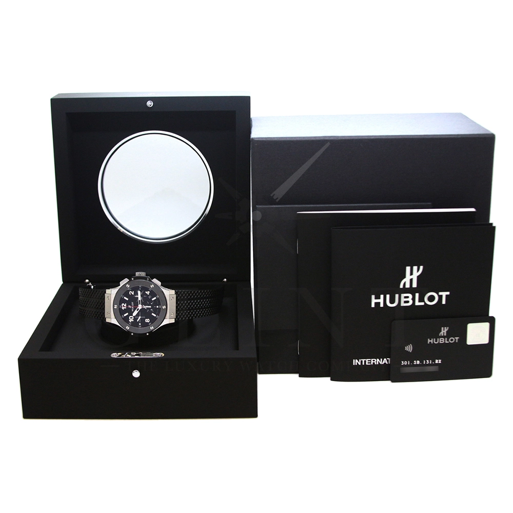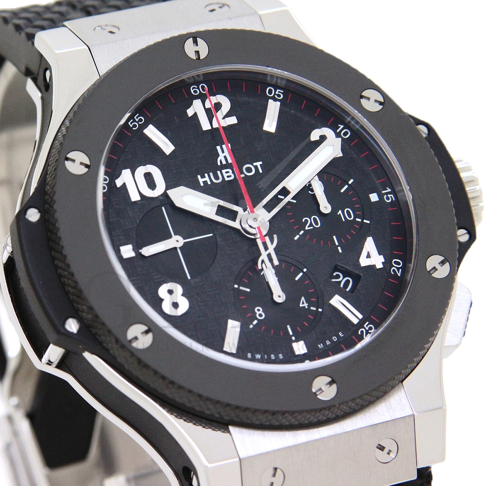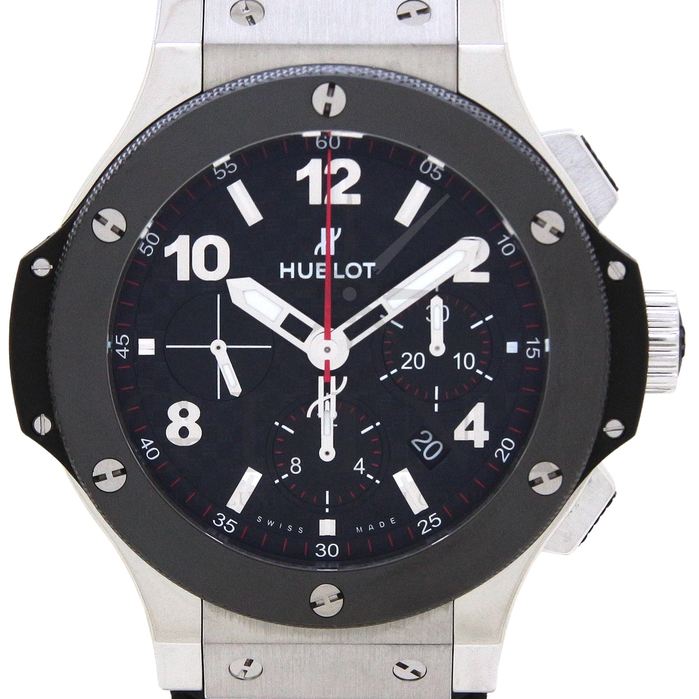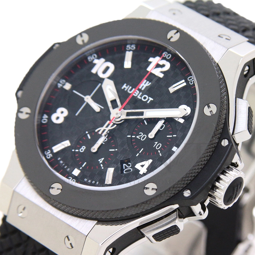 こちらのビッグバン44mm Ref.301.SB.131.RXは、耐久性に優れたステンレススティールとセラミックを素材に採用したモデル。カーボンブラックの文字盤とセラミックベゼルが時計にクールな印象を与えつつも、赤いクロノグラフ針がアクセントになっており、洗練された雰囲気が漂うデザインに仕上がっています。そしてデイト表示やクロノグラフなど機能性にも優れており、ケースバックルからはムーブメントの動きも確認できる為、時計の魅力も十分に堪能できるでしょう。芸能人やスポーツ選手も数多く愛用するウブロ ビッグバンでオシャレな雰囲気を演出してみてはいかがでしょうか。