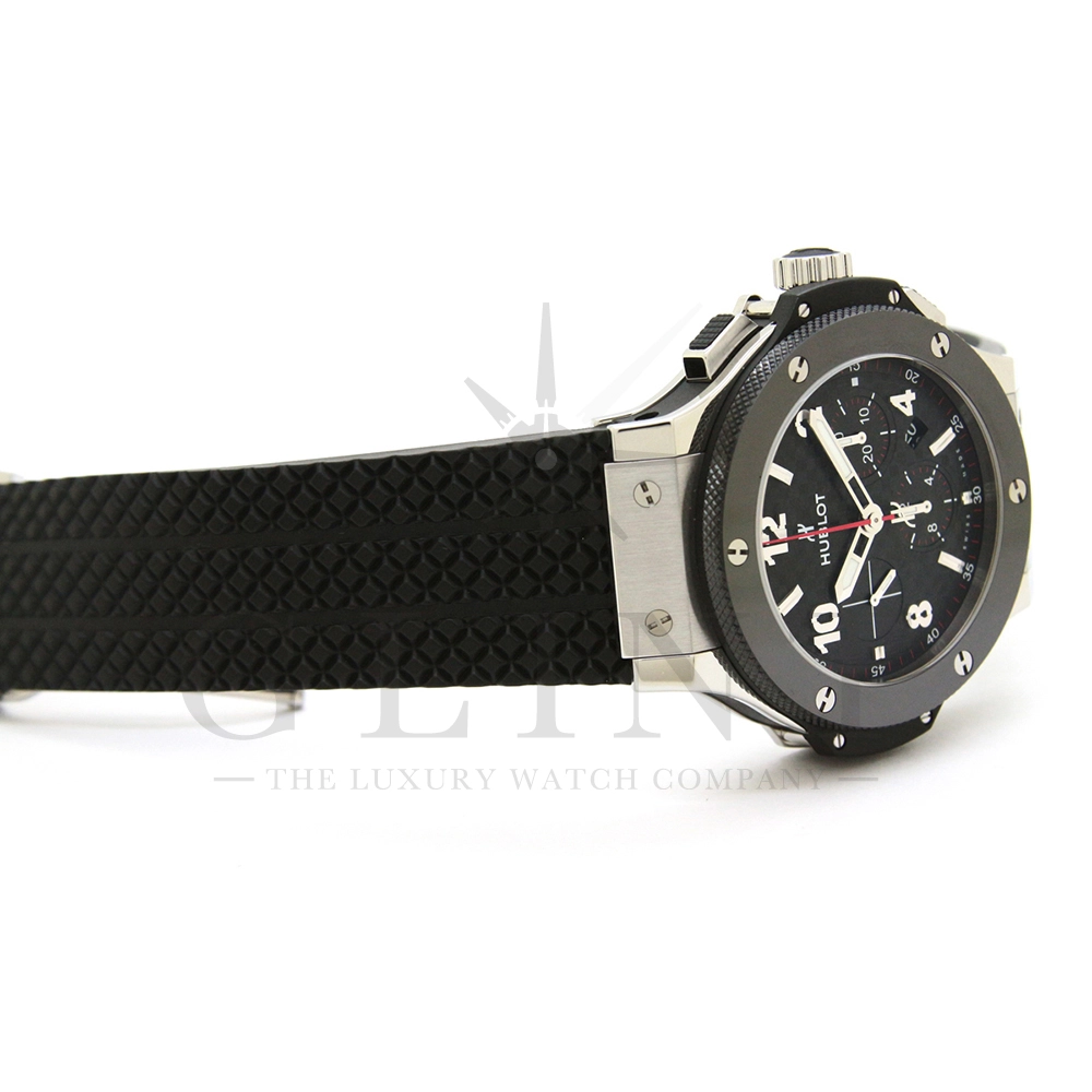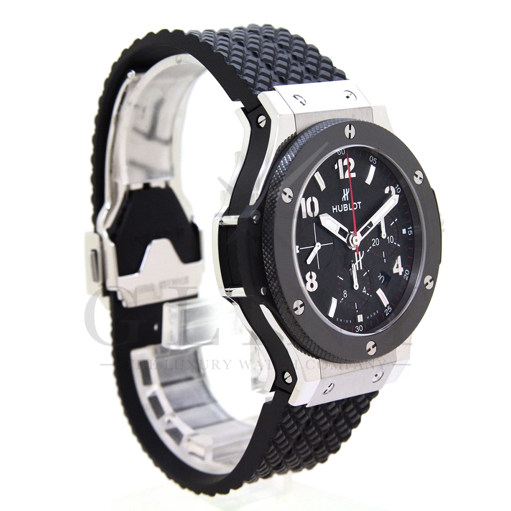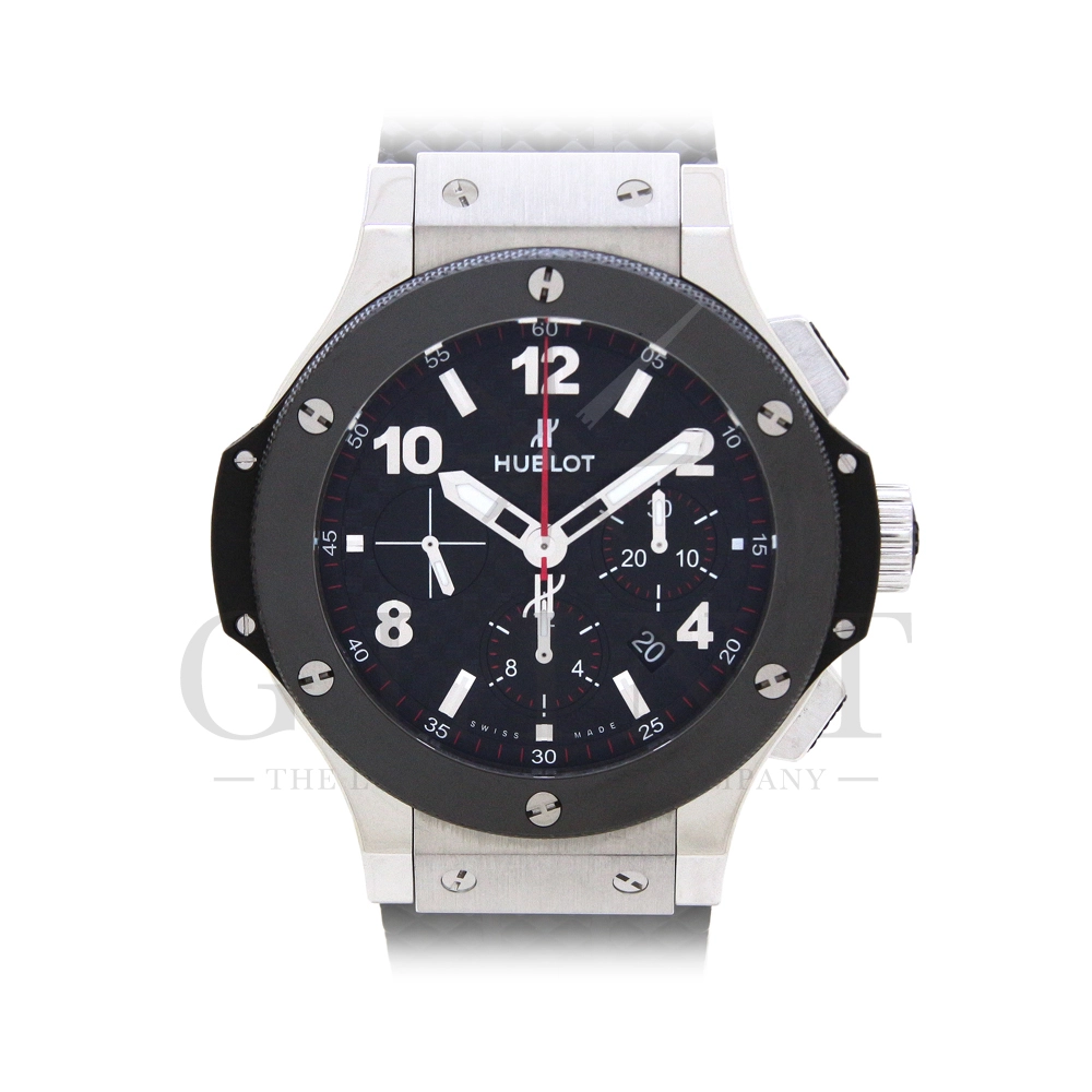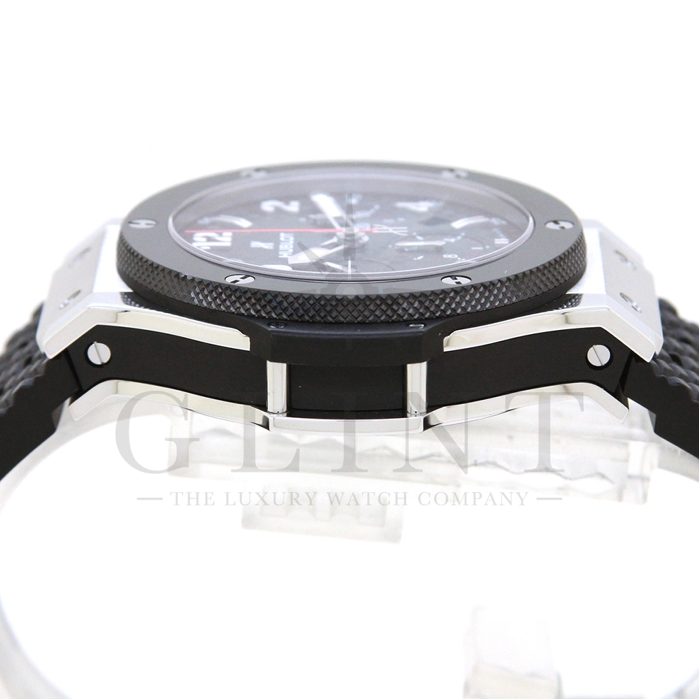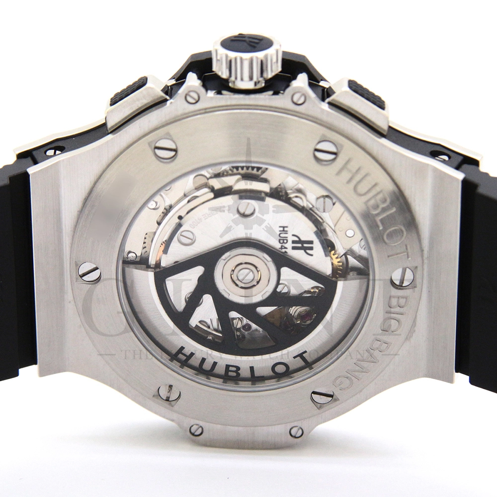 こちらのビッグバン44mm Ref.301.SB.131.RXは、耐久性に優れたステンレススティールとセラミックを素材に採用したモデル。カーボンブラックの文字盤とセラミックベゼルが時計にクールな印象を与えつつも、赤いクロノグラフ針がアクセントになっており、洗練された雰囲気が漂うデザインに仕上がっています。そしてデイト表示やクロノグラフなど機能性にも優れており、ケースバックルからはムーブメントの動きも確認できる為、時計の魅力も十分に堪能できるでしょう。芸能人やスポーツ選手も数多く愛用するウブロ ビッグバンでオシャレな雰囲気を演出してみてはいかがでしょうか。