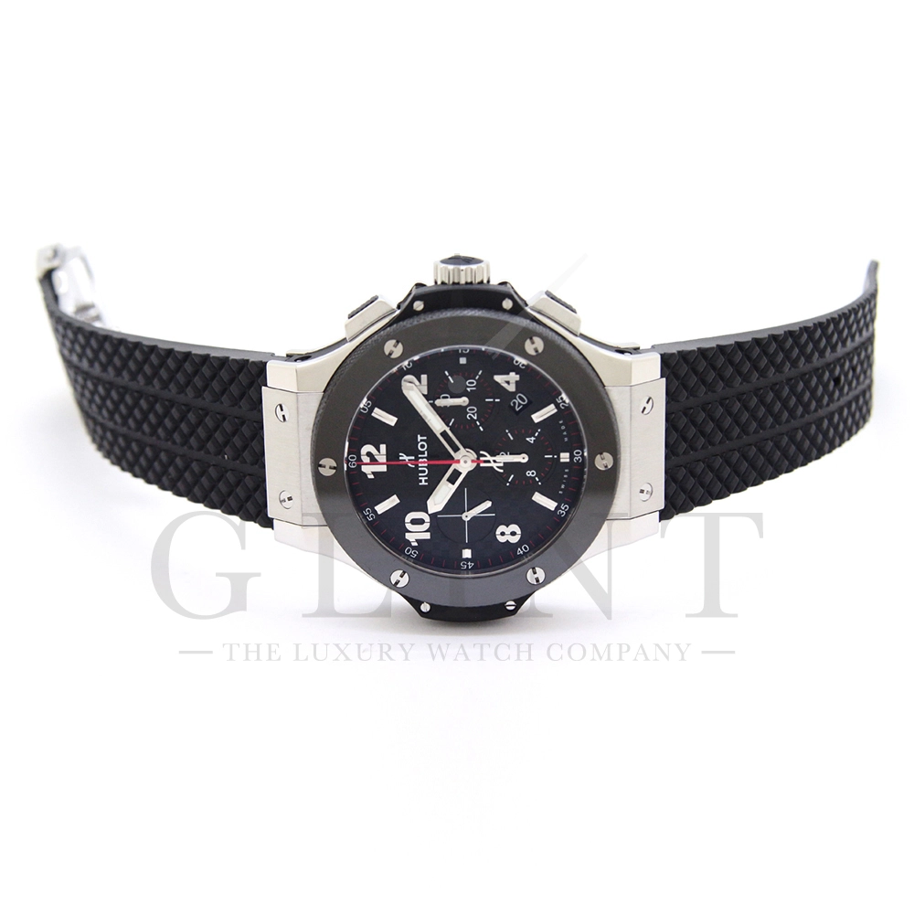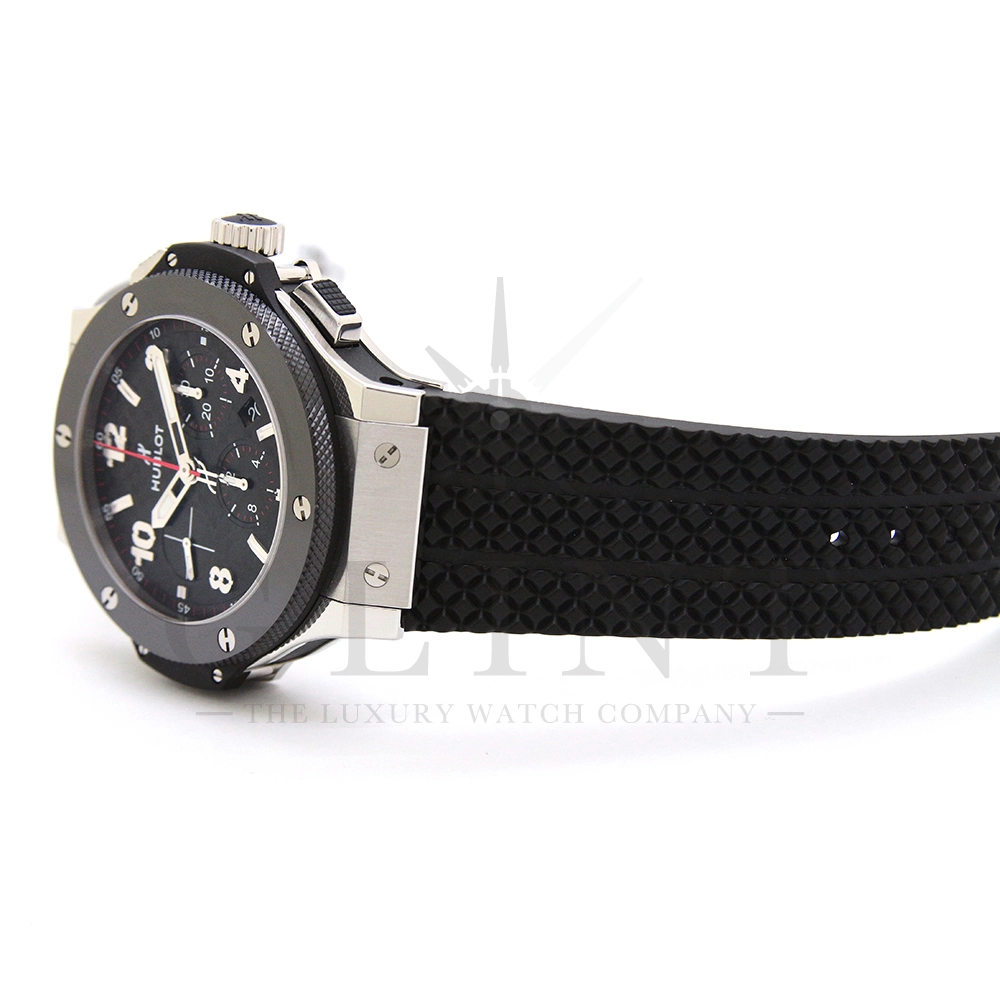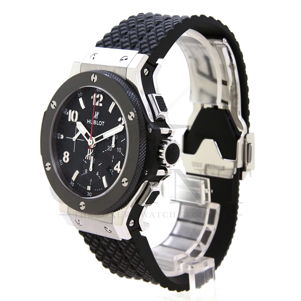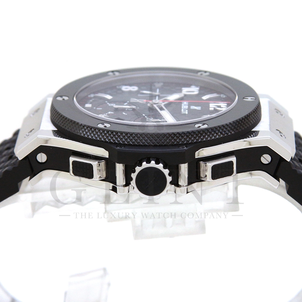 こちらのビッグバン44mm Ref.301.SB.131.RXは、耐久性に優れたステンレススティールとセラミックを素材に採用したモデル。カーボンブラックの文字盤とセラミックベゼルが時計にクールな印象を与えつつも、赤いクロノグラフ針がアクセントになっており、洗練された雰囲気が漂うデザインに仕上がっています。そしてデイト表示やクロノグラフなど機能性にも優れており、ケースバックルからはムーブメントの動きも確認できる為、時計の魅力も十分に堪能できるでしょう。芸能人やスポーツ選手も数多く愛用するウブロ ビッグバンでオシャレな雰囲気を演出してみてはいかがでしょうか。