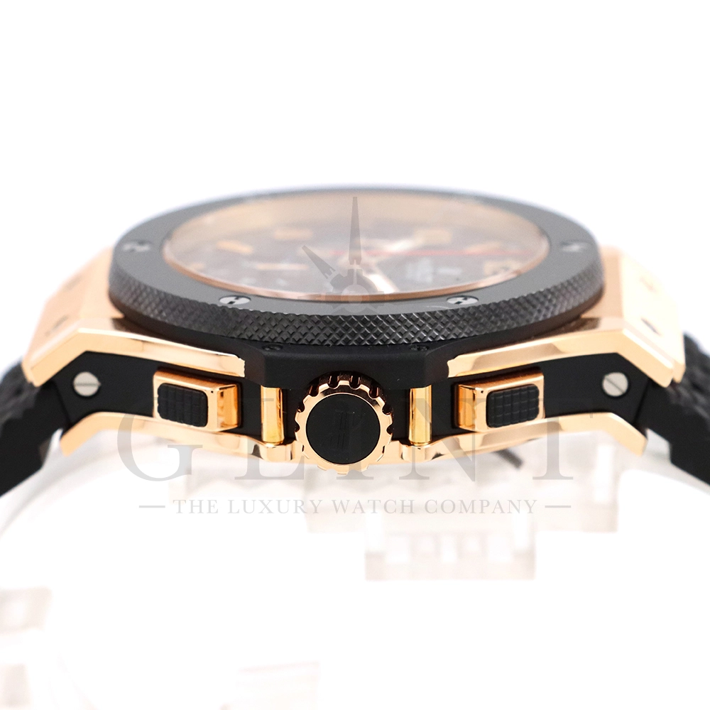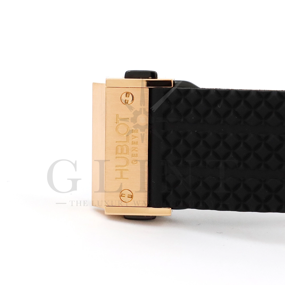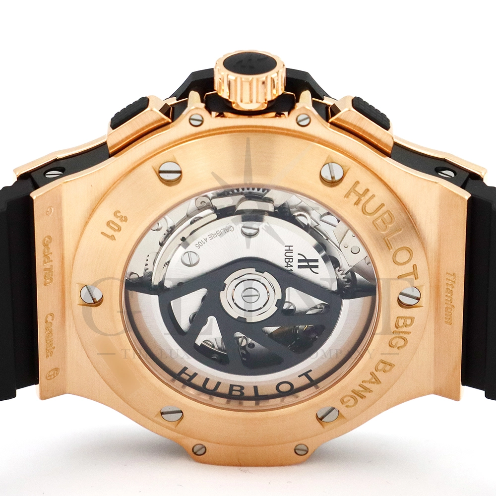 こちらはビッグ・バン ゴールド セラミックです。ピンクゴールドとブラックセラミックを組み合わせたスタイリッシュなモデル。文字盤とベゼル、ストラップにはカーボンパターンが施され、スポーティーで力強い印象に。ムーブメントには汎用ムーブメントをベースとしたCal.HUB4100を使用しており、シースルーバックの裏蓋からは、ムーブメントの繊細な動きが堪能できます。