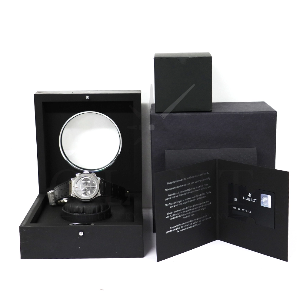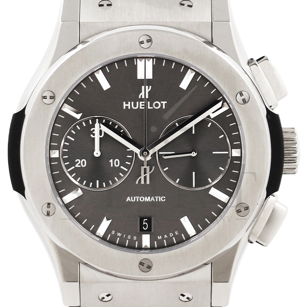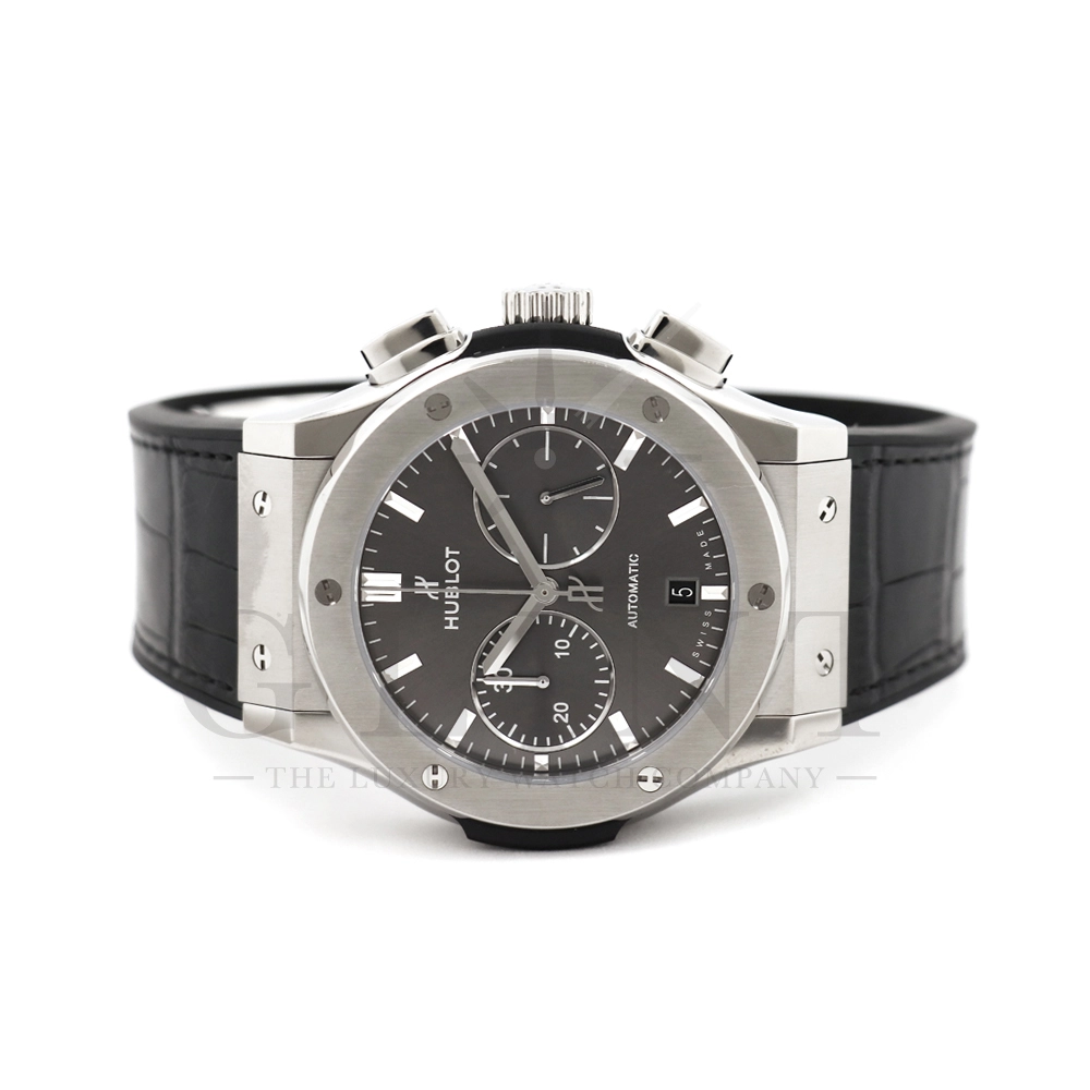 こちらはウブロ クラシック フュージョン クロノグラフ チタニウム レーシンググレーです。ケース素材には軽量かつ頑丈で、腐食耐性に優れ肌に優しい点においても卓越するチタニウムを採用。ポリッシュ仕上げとサテン仕上げが施されたケースにグレーサンバーストのダイヤルがドレッシーな印象を与えてくれます。ムーブメントはCal.HUB1143を搭載しており、シースルーバックからはその動きを堪能いただけます。クラシカルでシンプルなデザインは普段使いに適していると共に洗練された雰囲気や高級感を引き立たせ、スポーティーの中に秘められたエレガントさをお楽しみいただけるでしょう。