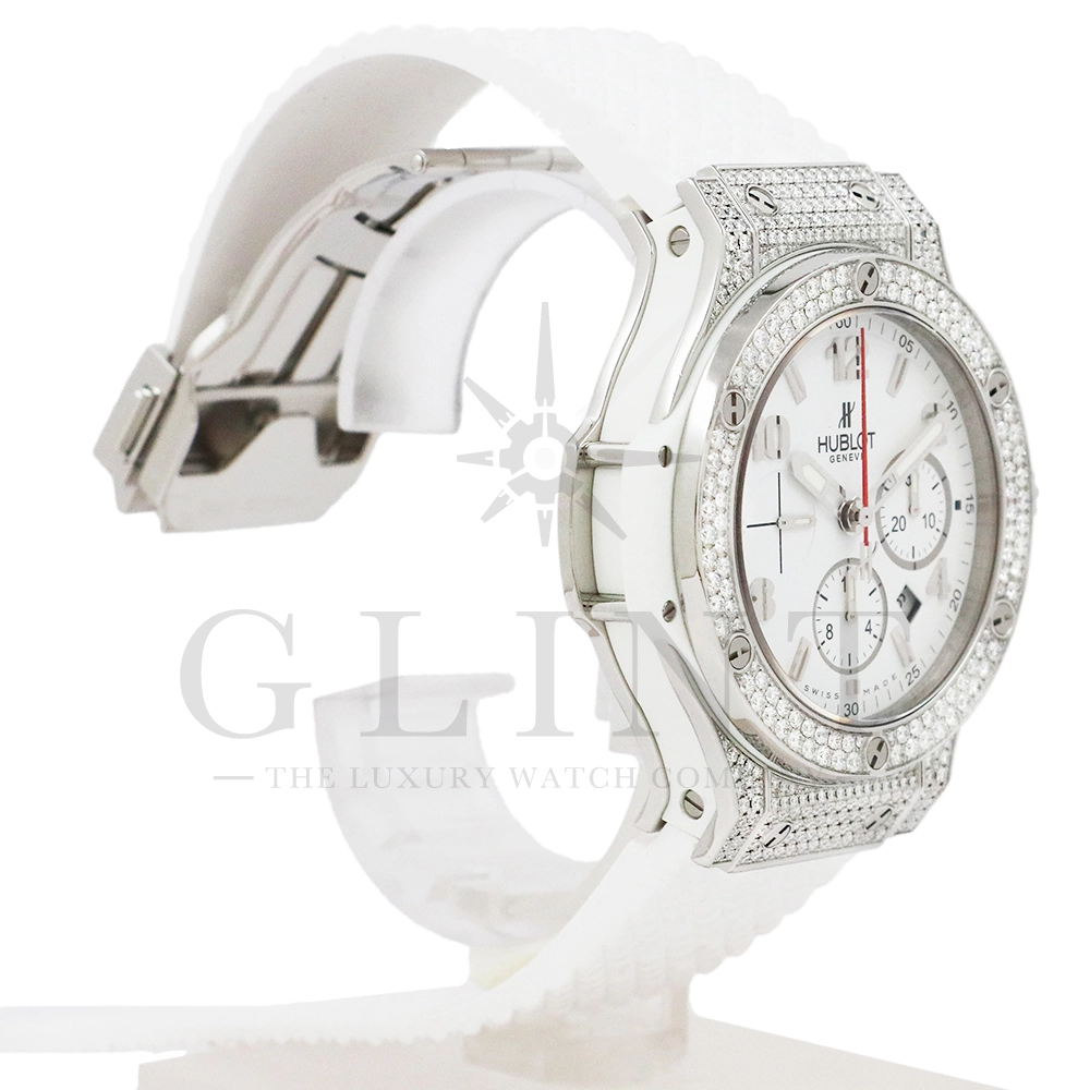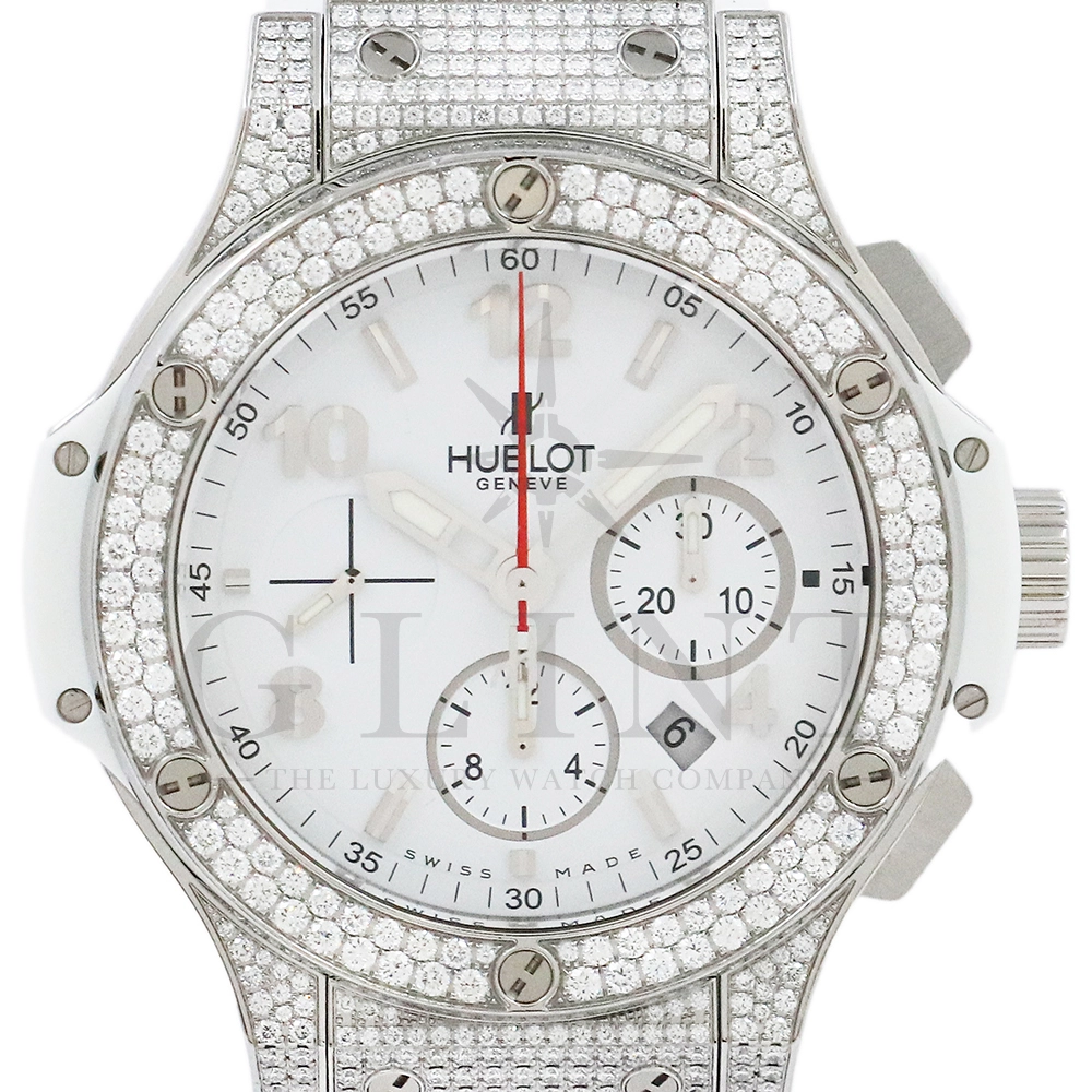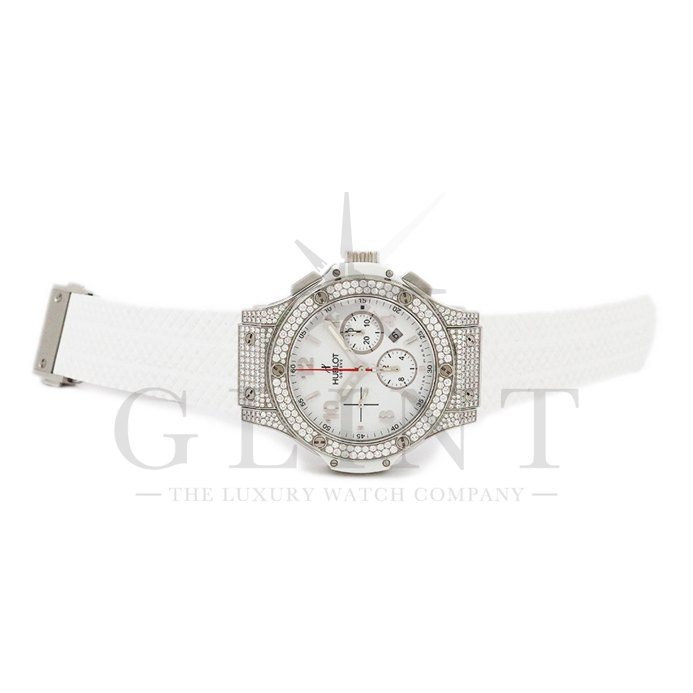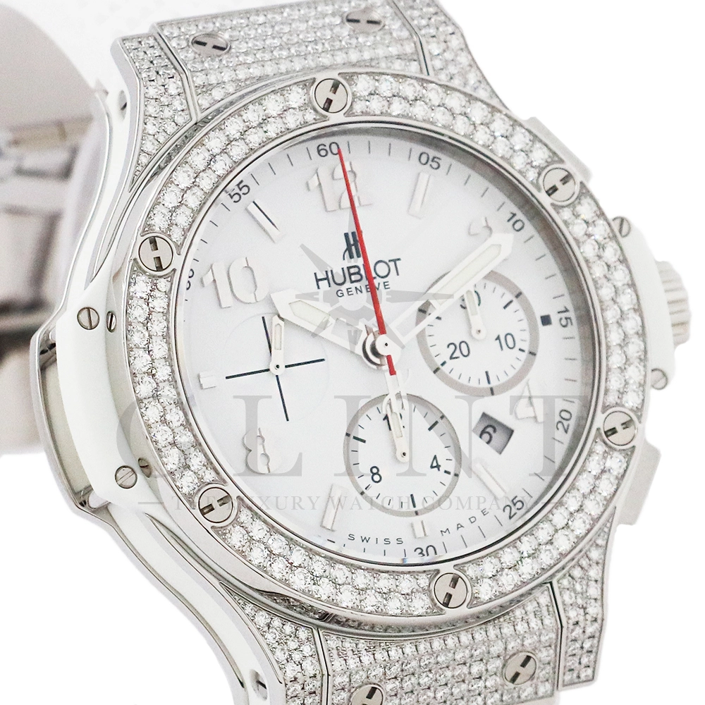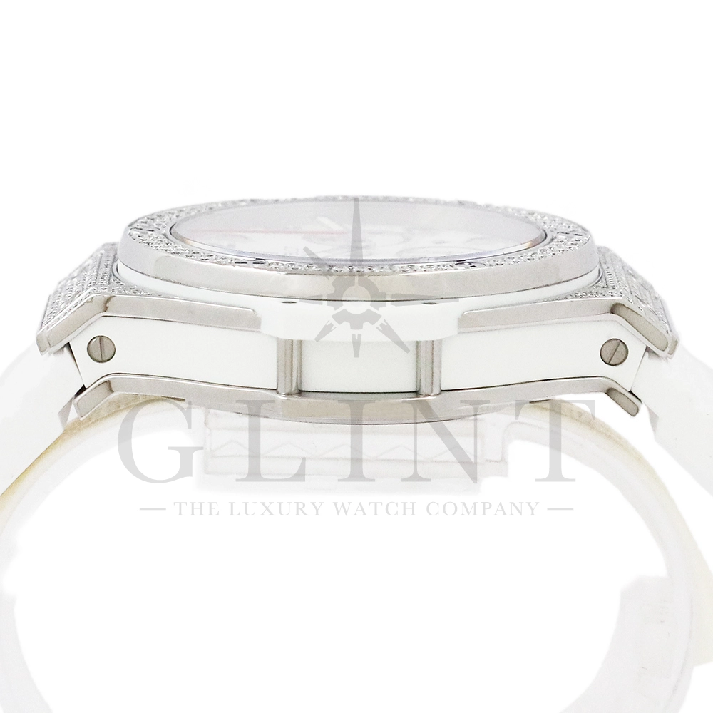 こちらはビッグバン サンモリッツ オールホワイト パヴェダイヤです。ケース素材にはステンレススティールを使用。スイスの高級リゾート地、サンモリッツの名を冠したモデル名の通り、ホワイトで統一感のある外観ながらも、スポーティでありながらエレガンスといった絶妙なデザインが特徴です。ベゼルとラグには合計326個のウブロ純正ダイヤモンドがセッティングされており、とても豪華でより高級感を演出してくれるでしょう。ゴージャスで爽やかなビッグバンで普段のファッションのアクセントとして楽しんでみてはいかがでしょうか。