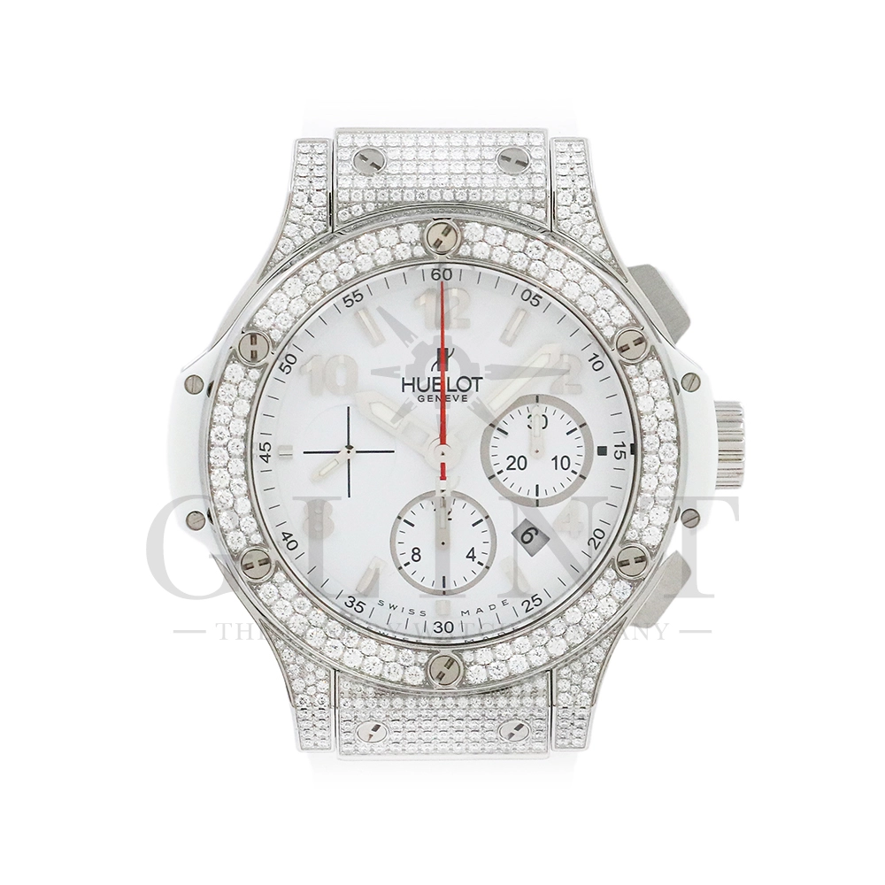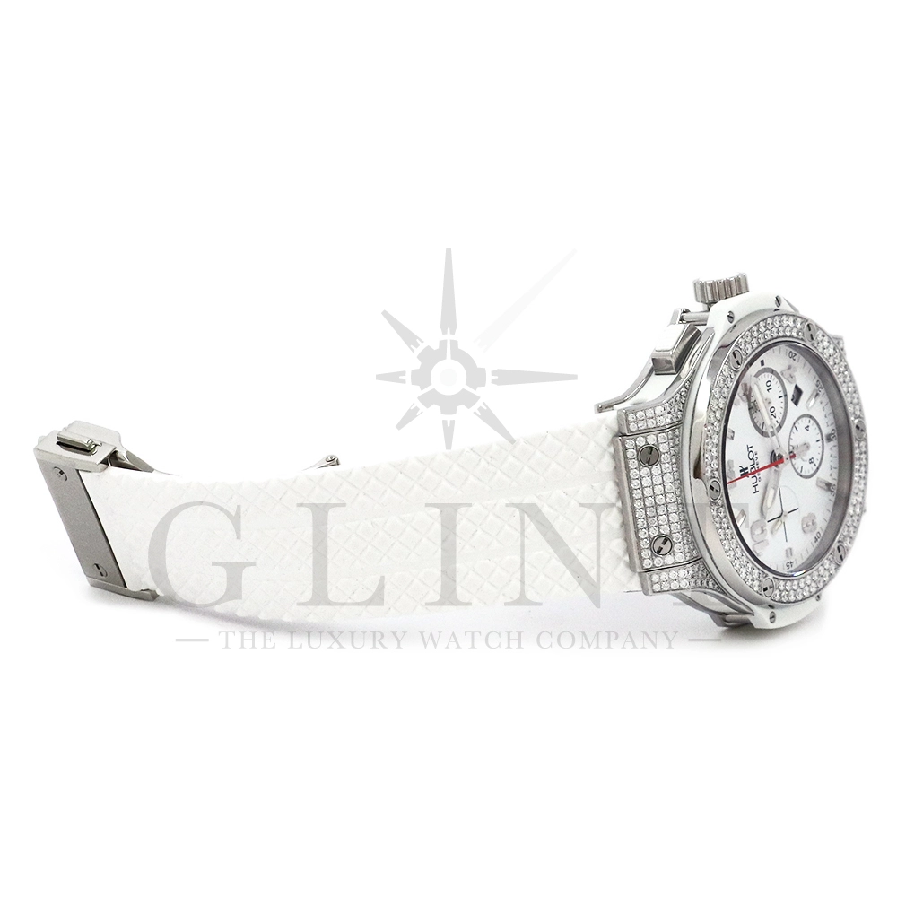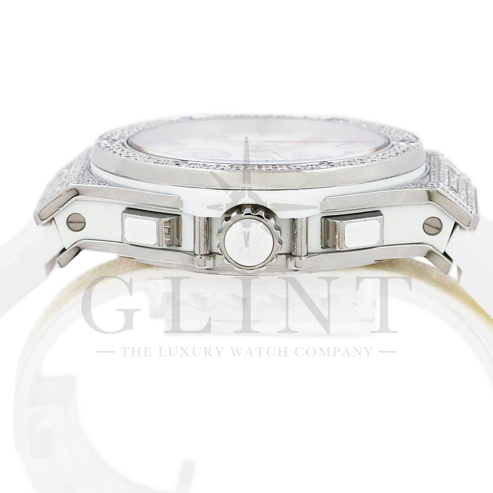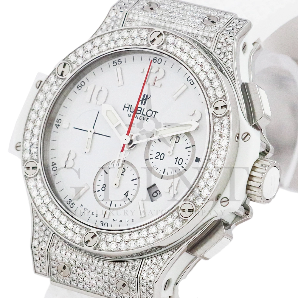 こちらはビッグバン サンモリッツ オールホワイト パヴェダイヤです。ケース素材にはステンレススティールを使用。スイスの高級リゾート地、サンモリッツの名を冠したモデル名の通り、ホワイトで統一感のある外観ながらも、スポーティでありながらエレガンスといった絶妙なデザインが特徴です。ベゼルとラグには合計326個のウブロ純正ダイヤモンドがセッティングされており、とても豪華でより高級感を演出してくれるでしょう。ゴージャスで爽やかなビッグバンで普段のファッションのアクセントとして楽しんでみてはいかがでしょうか。