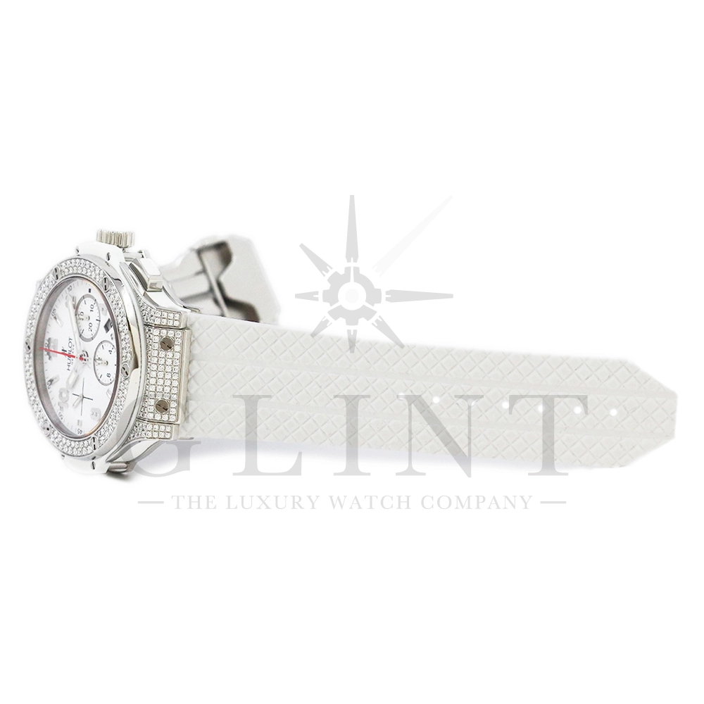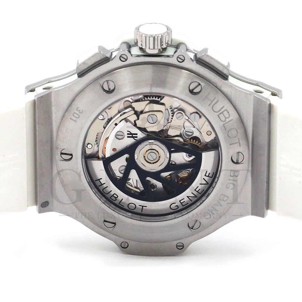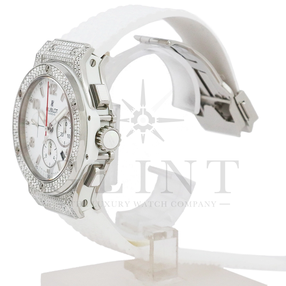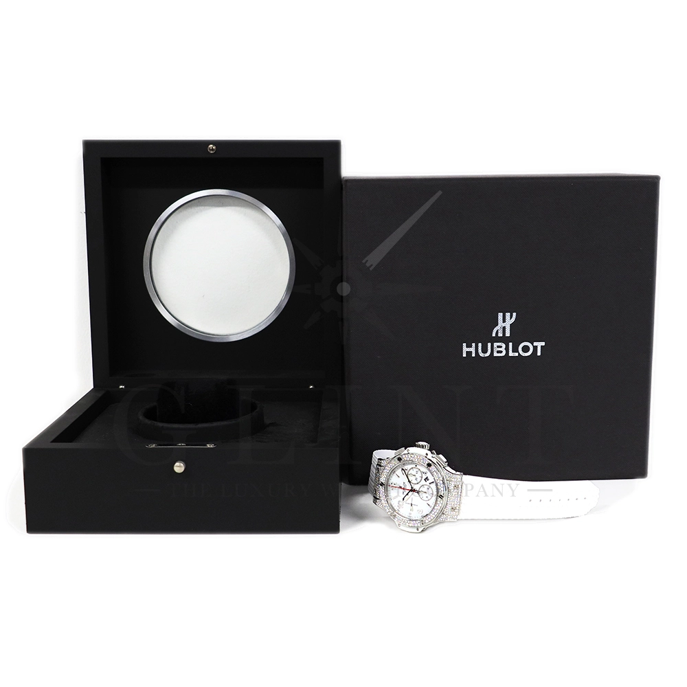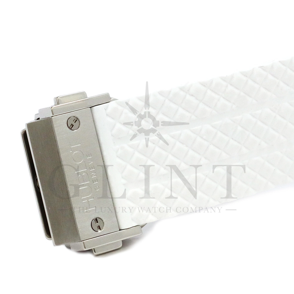 こちらはビッグバン サンモリッツ オールホワイト パヴェダイヤです。ケース素材にはステンレススティールを使用。スイスの高級リゾート地、サンモリッツの名を冠したモデル名の通り、ホワイトで統一感のある外観ながらも、スポーティでありながらエレガンスといった絶妙なデザインが特徴です。ベゼルとラグには合計326個のウブロ純正ダイヤモンドがセッティングされており、とても豪華でより高級感を演出してくれるでしょう。ゴージャスで爽やかなビッグバンで普段のファッションのアクセントとして楽しんでみてはいかがでしょうか。