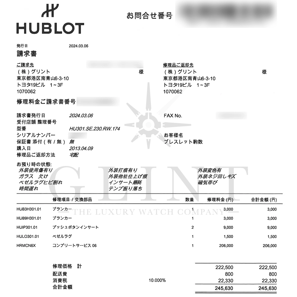 2024年3月ウブロにてコンプリートサービス済み。ライトポリッシュで取り切れなかった微細な小傷がある程度でコンディションの良い美品となります。