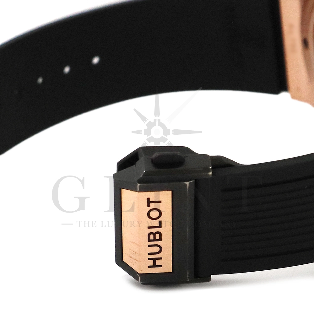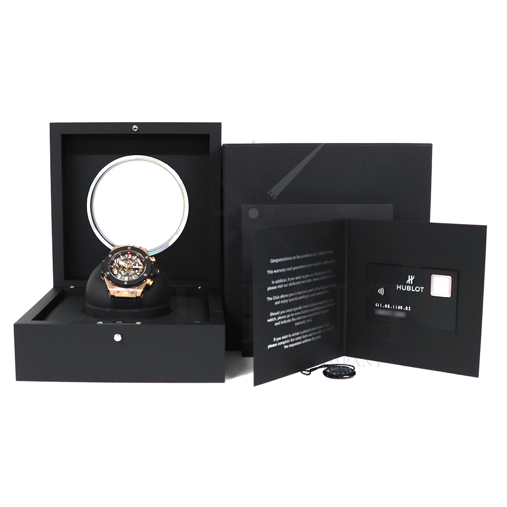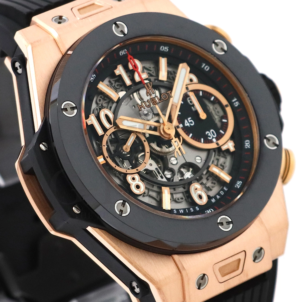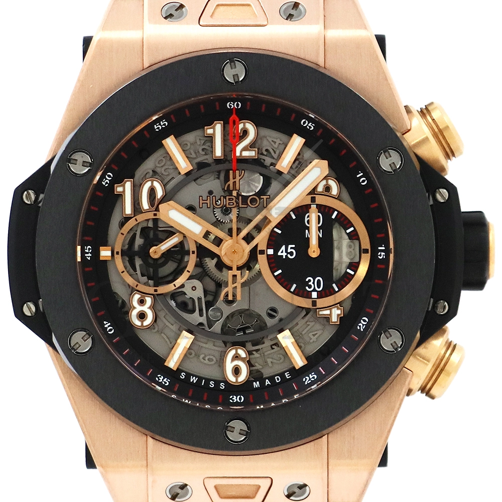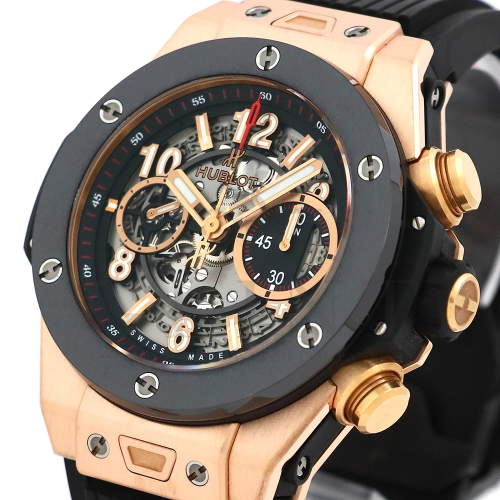 こちらはウブロ ビッグバン ウニコ キングゴールド セラミックです。ポリッシュとサテン仕上げが施されたウブロ独自の18Kキングゴールドとブラックセラミックを素材に採用したゴージャスな印象を与えてくれるモデル。ムーブメントにはウブロが長年掛けて自社開発したcal.HUB1242 UNICO自動巻きクロノグラフが搭載されており、スケルトナイズされた文字盤と裏蓋からその動きを堪能できるでしょう。ケースサイズは45mmと従来のビッグバンよりケースアップされており、その迫力と18Kキングゴールドの高級感に魅了される事は間違いありません。ベルト交換もプッシュボタンを押すだけで簡単に替えられる為、非常に利便性の高い作りとなっております。完成度の優れたラグジュアリーなビッグバンでオシャレに攻めてみてはいかがでしょうか。