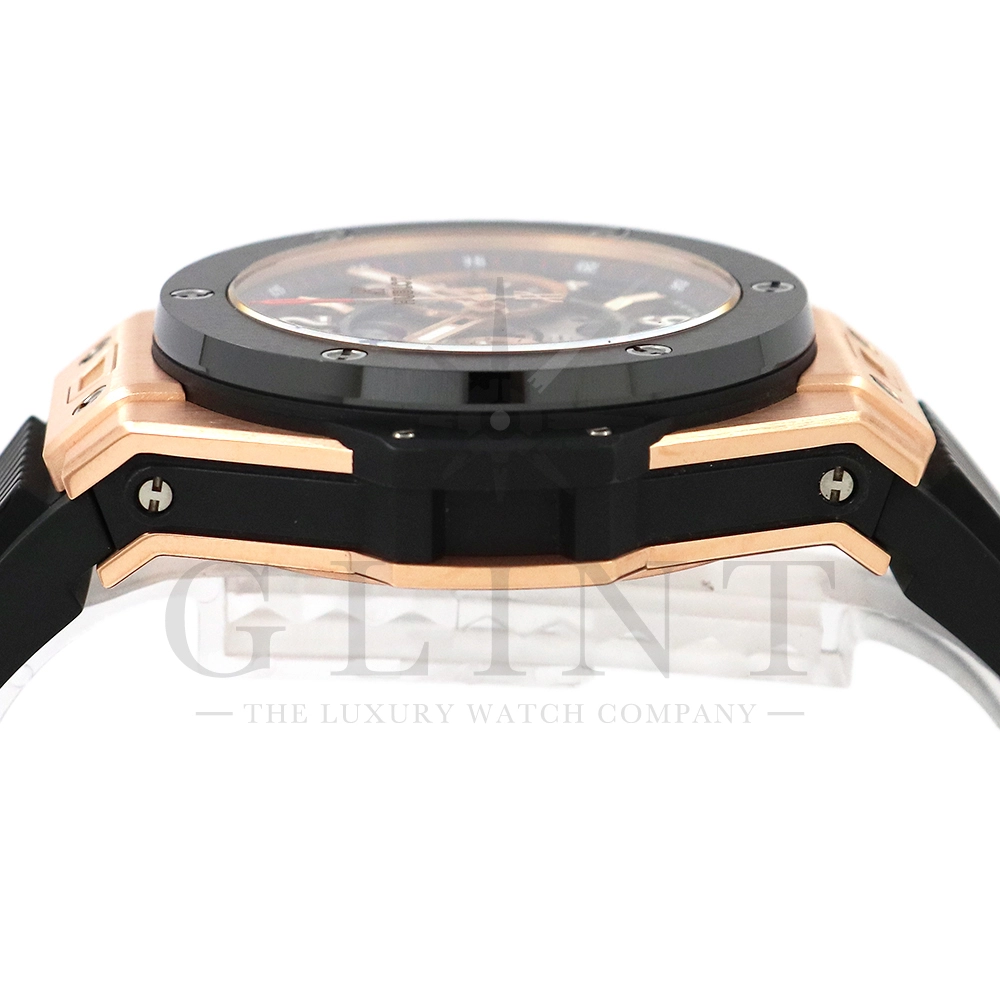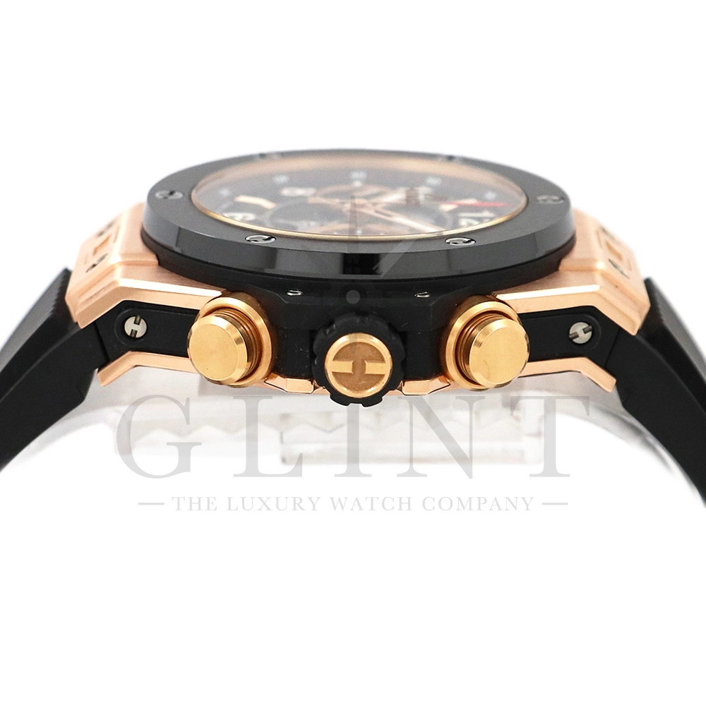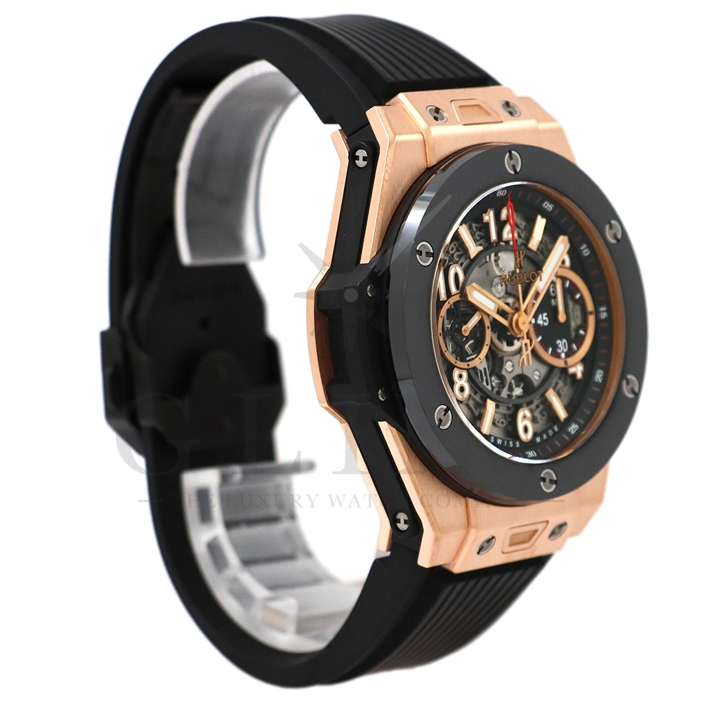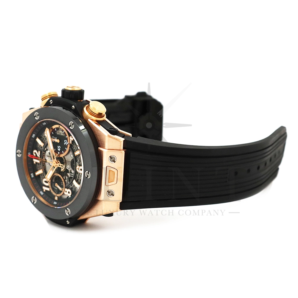 こちらはウブロ ビッグバン ウニコ キングゴールド セラミックです。ポリッシュとサテン仕上げが施されたウブロ独自の18Kキングゴールドとブラックセラミックを素材に採用したゴージャスな印象を与えてくれるモデル。ムーブメントにはウブロが長年掛けて自社開発したcal.HUB1242 UNICO自動巻きクロノグラフが搭載されており、スケルトナイズされた文字盤と裏蓋からその動きを堪能できるでしょう。ケースサイズは45mmと従来のビッグバンよりケースアップされており、その迫力と18Kキングゴールドの高級感に魅了される事は間違いありません。ベルト交換もプッシュボタンを押すだけで簡単に替えられる為、非常に利便性の高い作りとなっております。完成度の優れたラグジュアリーなビッグバンでオシャレに攻めてみてはいかがでしょうか。