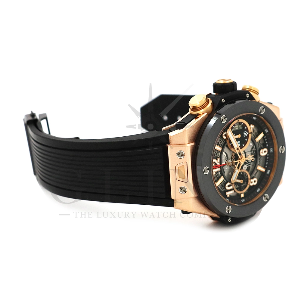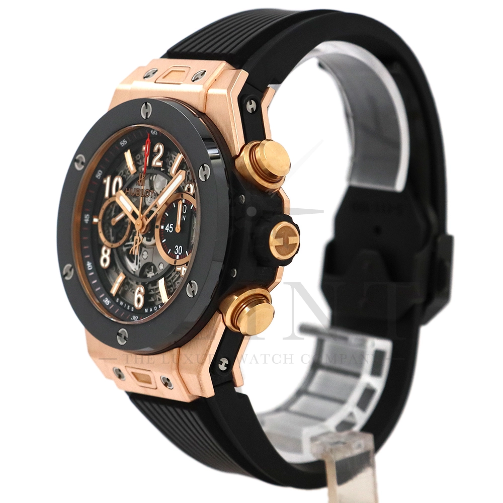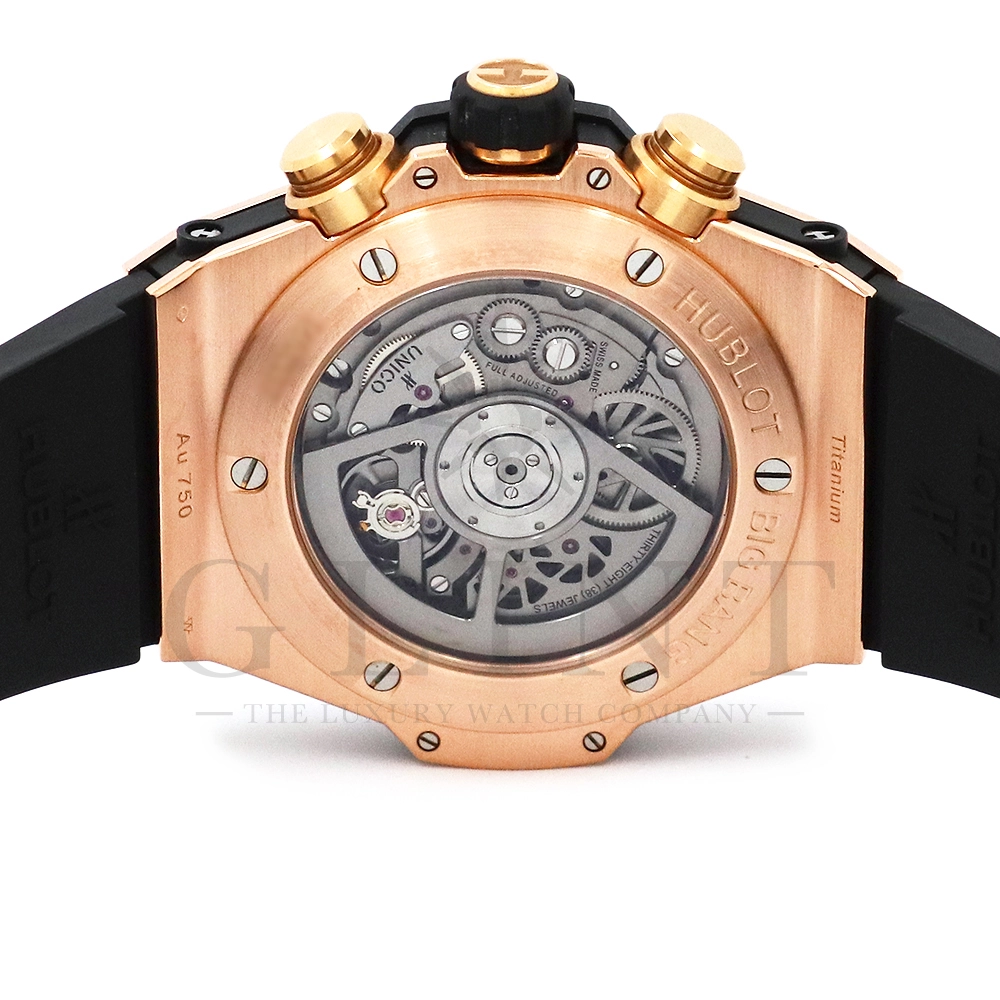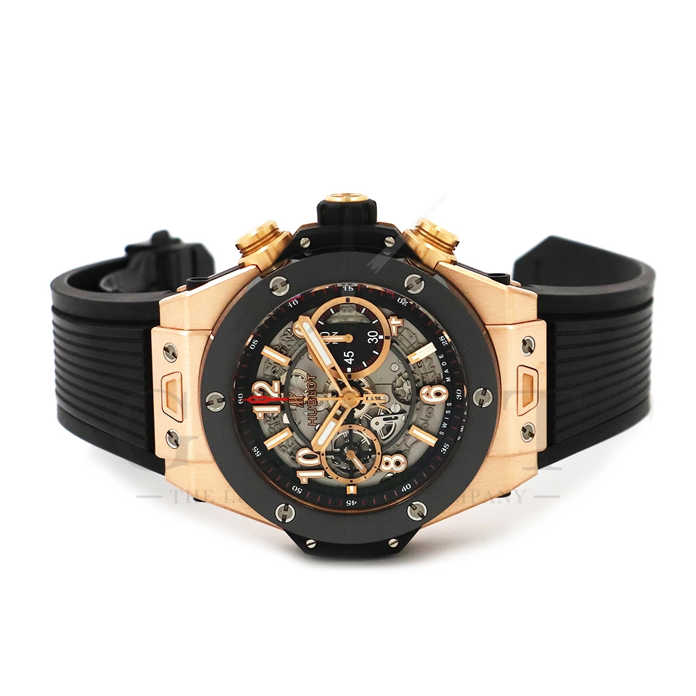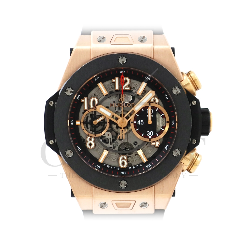 こちらはウブロ ビッグバン ウニコ キングゴールド セラミックです。ポリッシュとサテン仕上げが施されたウブロ独自の18Kキングゴールドとブラックセラミックを素材に採用したゴージャスな印象を与えてくれるモデル。ムーブメントにはウブロが長年掛けて自社開発したcal.HUB1242 UNICO自動巻きクロノグラフが搭載されており、スケルトナイズされた文字盤と裏蓋からその動きを堪能できるでしょう。ケースサイズは45mmと従来のビッグバンよりケースアップされており、その迫力と18Kキングゴールドの高級感に魅了される事は間違いありません。ベルト交換もプッシュボタンを押すだけで簡単に替えられる為、非常に利便性の高い作りとなっております。完成度の優れたラグジュアリーなビッグバンでオシャレに攻めてみてはいかがでしょうか。