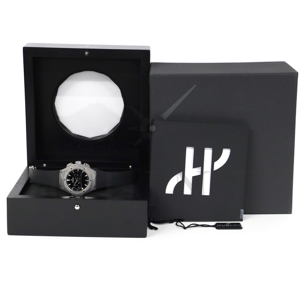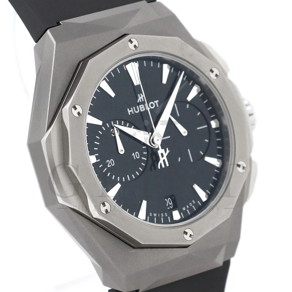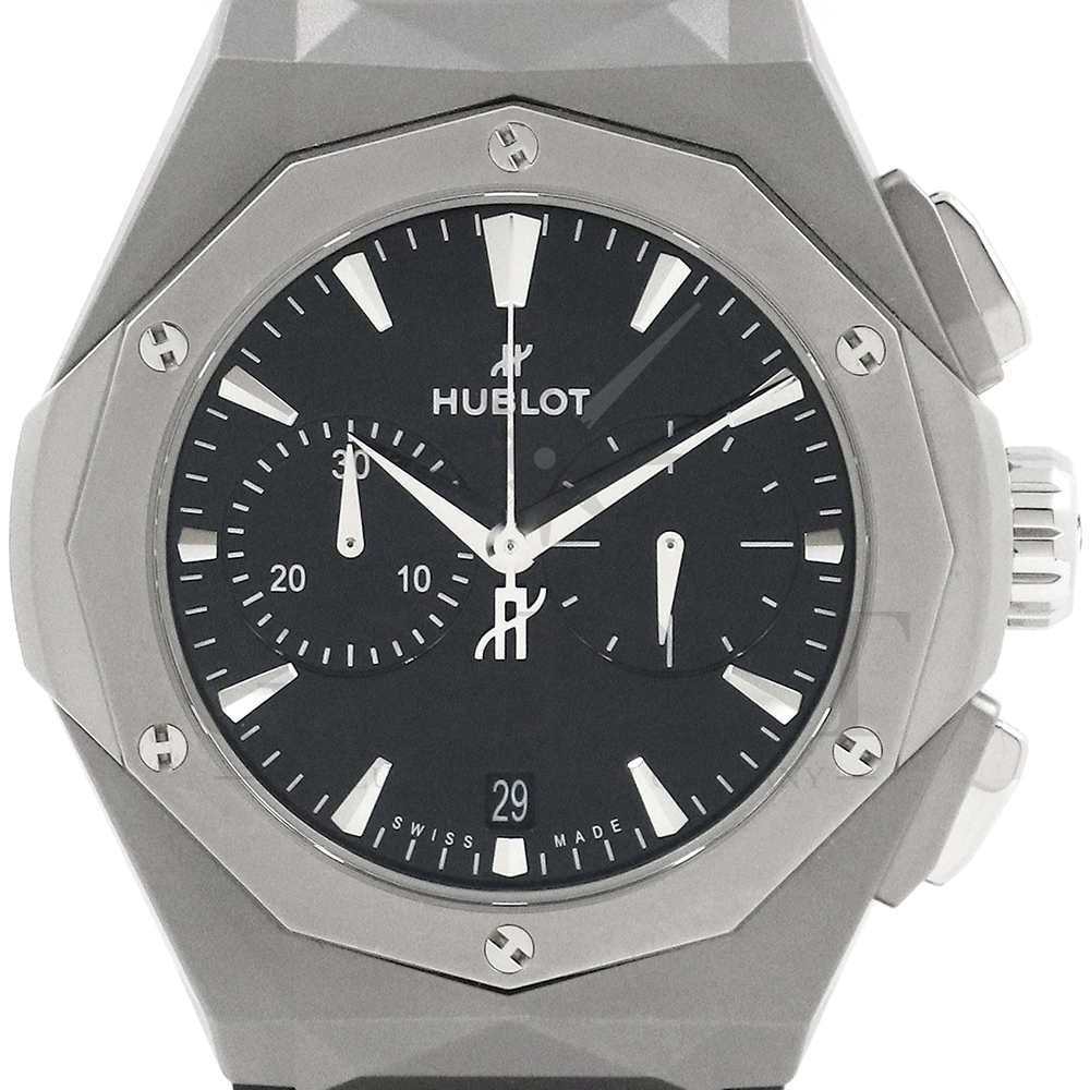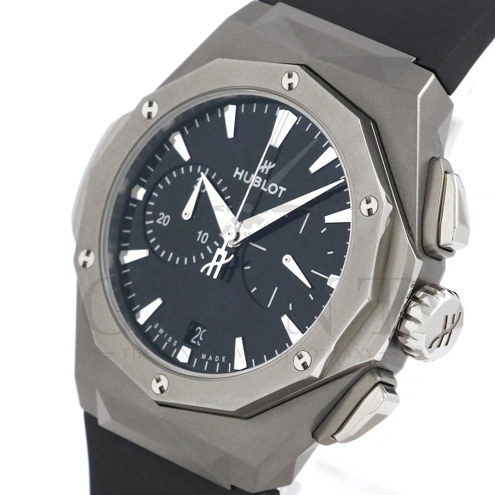 こちらはウブロ クラシックフュージョン クロノグラフ オーリンスキー チタニウム 世界限定500本です。野生動物の彫像で知られるフランスの現代アーティスト「リチャード・オーリンスキー氏」とのコラボレーションモデル。ケース素材にはマイクロブラスト加工&ポリッシュ仕上げのチタニウムが採用されており、搭載されているクロノグラフムーブメントはキャリバー HUB1153。時・分表示、日付表示にパワーリザーブは約42時間保ちます。シースルーバックからムーブメントの動きをダイレクトにご堪能いただけるでしょう。The Art of Fusion(異なる素材やアイデアの融合)を掲げるウブロらしいこだわりが感じられる仕上がりとなっております。