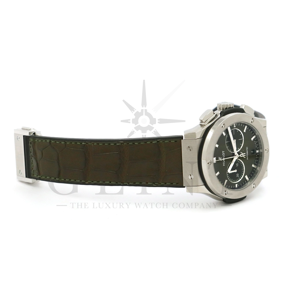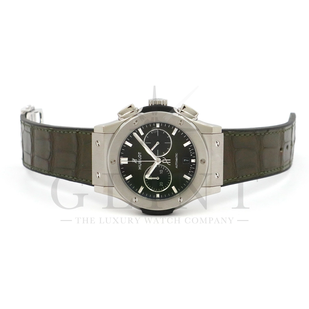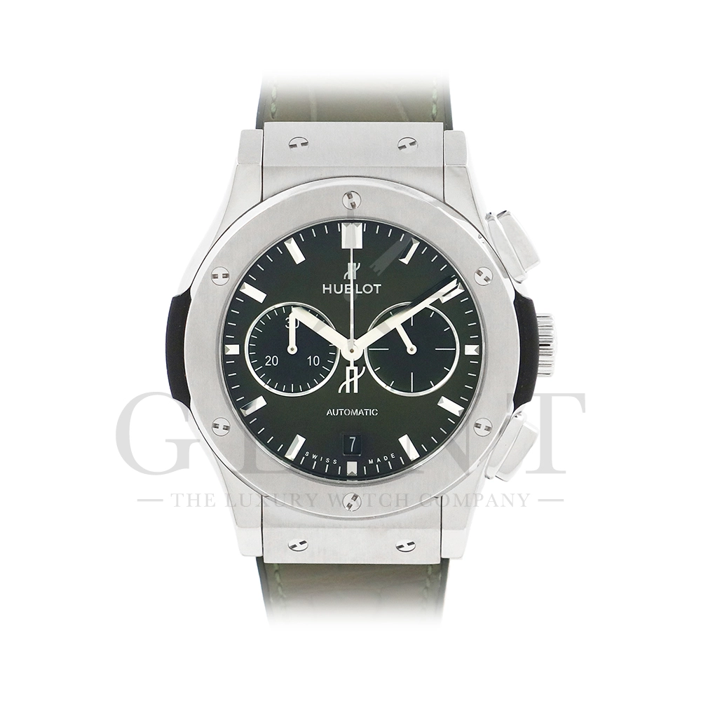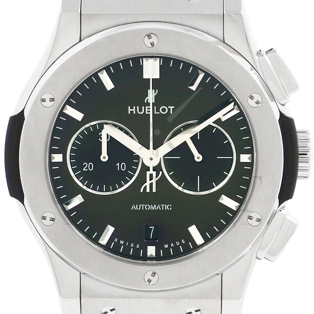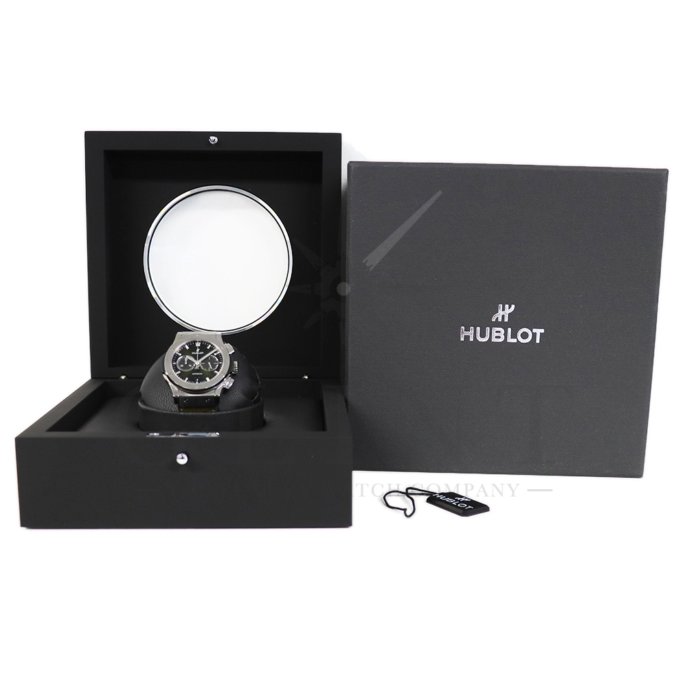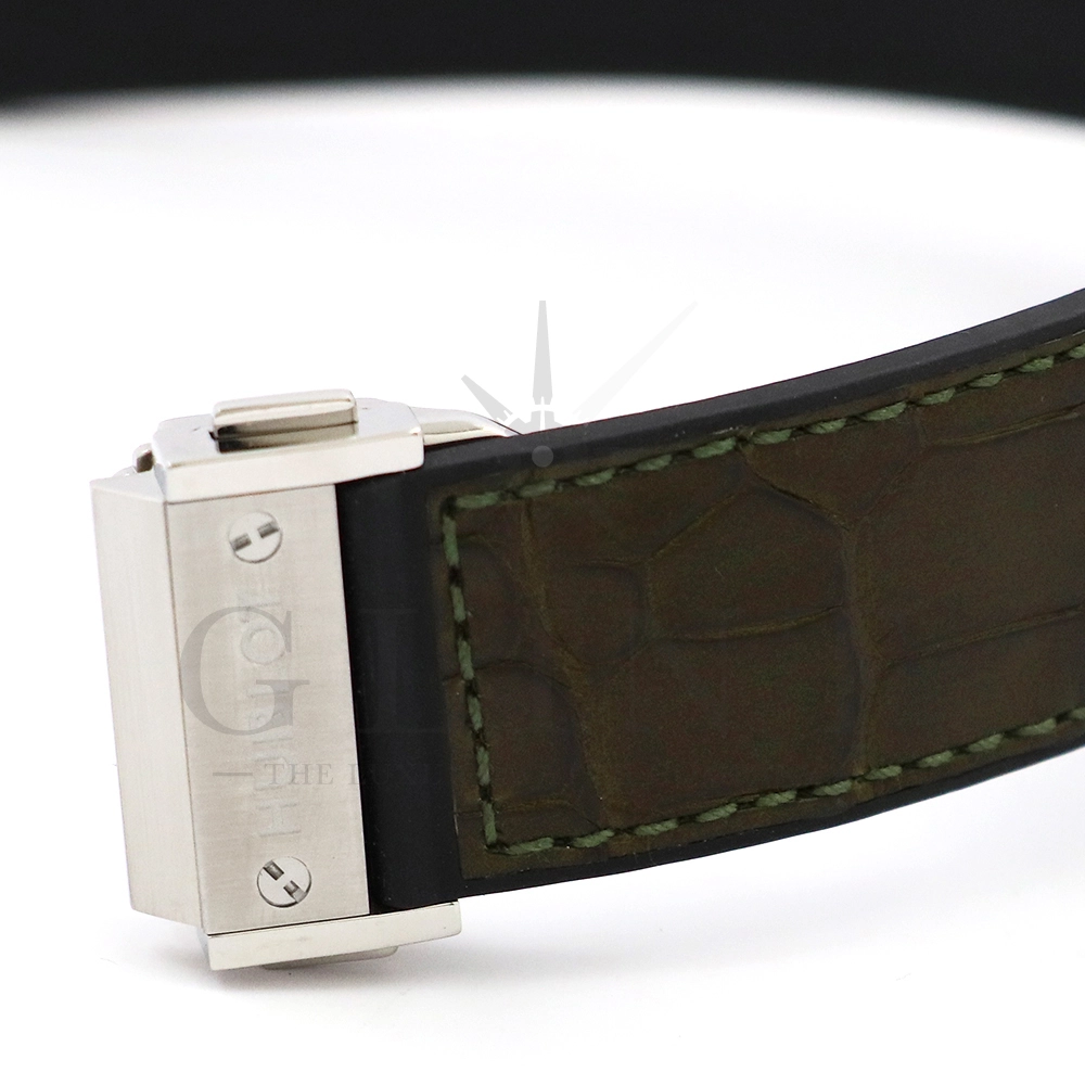 こちらはウブロ クラシック・フュージョン クロノグラフ チタニウム グリーンです。ケース素材にチタンを採用することで、軽量感もあり、とても着け心地の良いモデルになっています。ストラップも特徴的で、アリゲーター素材とラバーを組み合わせた「ラバー・グミアリゲーター」を採用しており、実用性の高さは抜群。ムーブメントはCal.HUB1143を搭載しており、シースルーバックからはその動きを堪能いただけます。ストラップのカラーと合わせたグリーンサンレイ文字盤は非常に美しく、ウブロらしい斬新的なアイデアが凝縮された一本です。