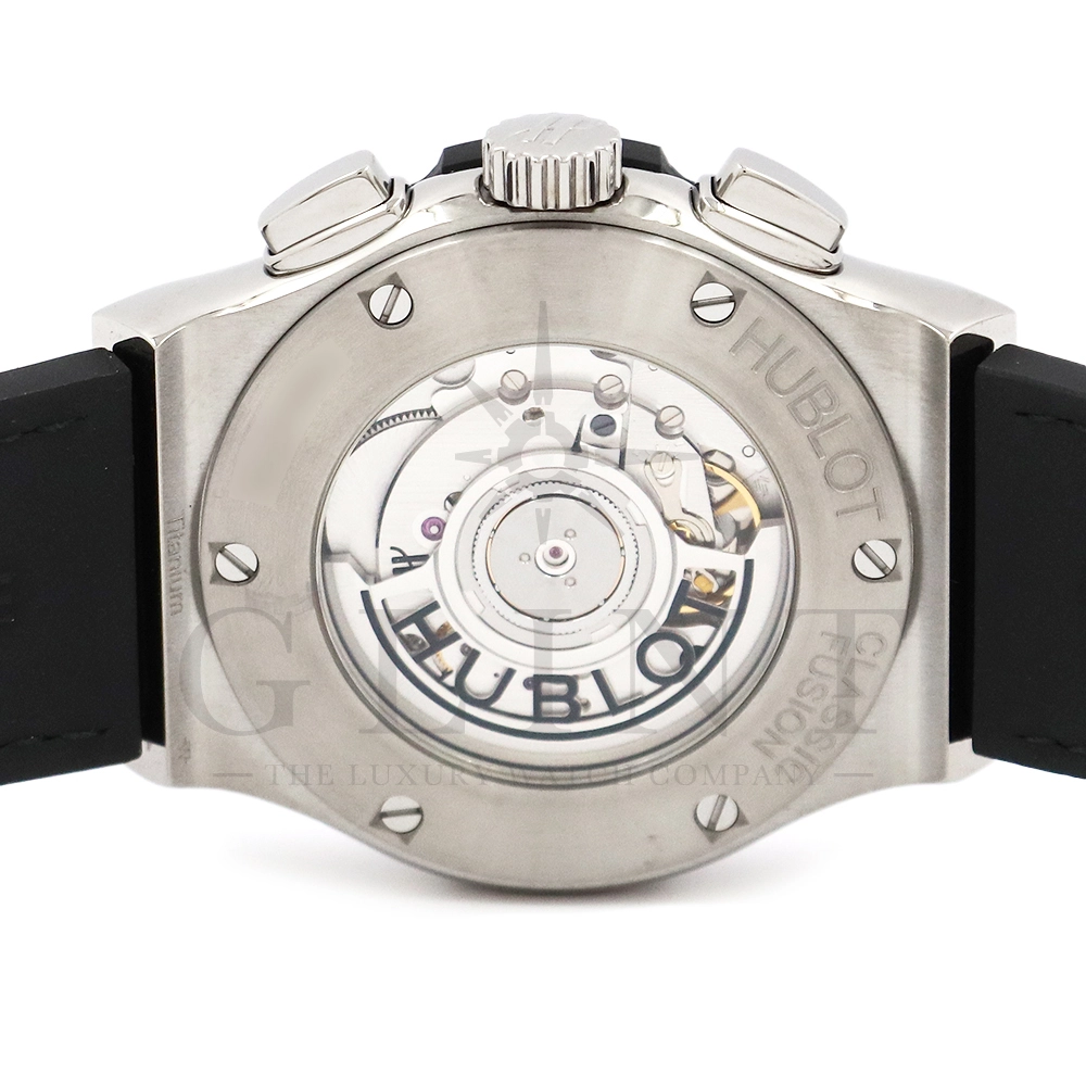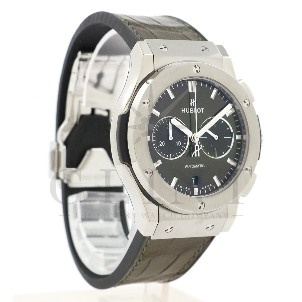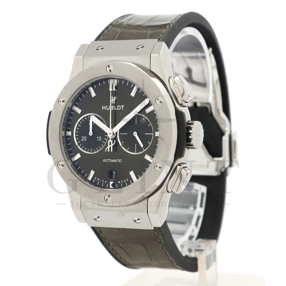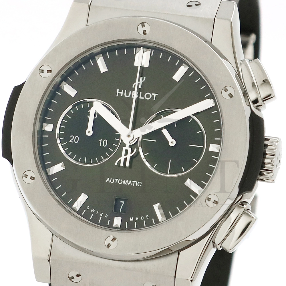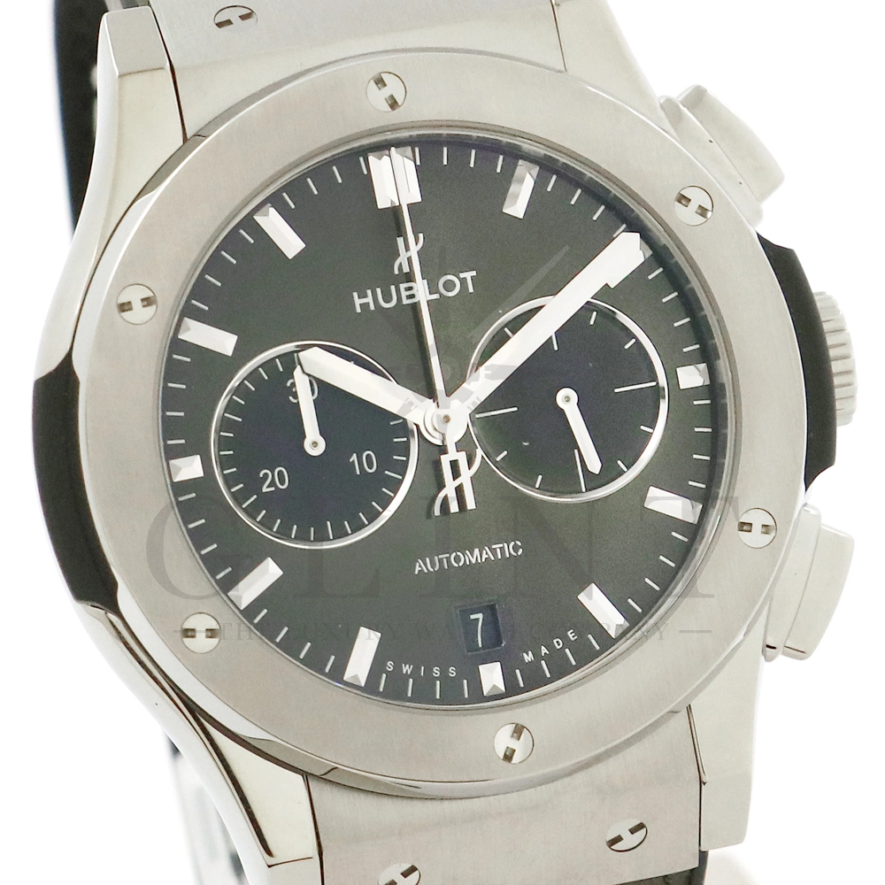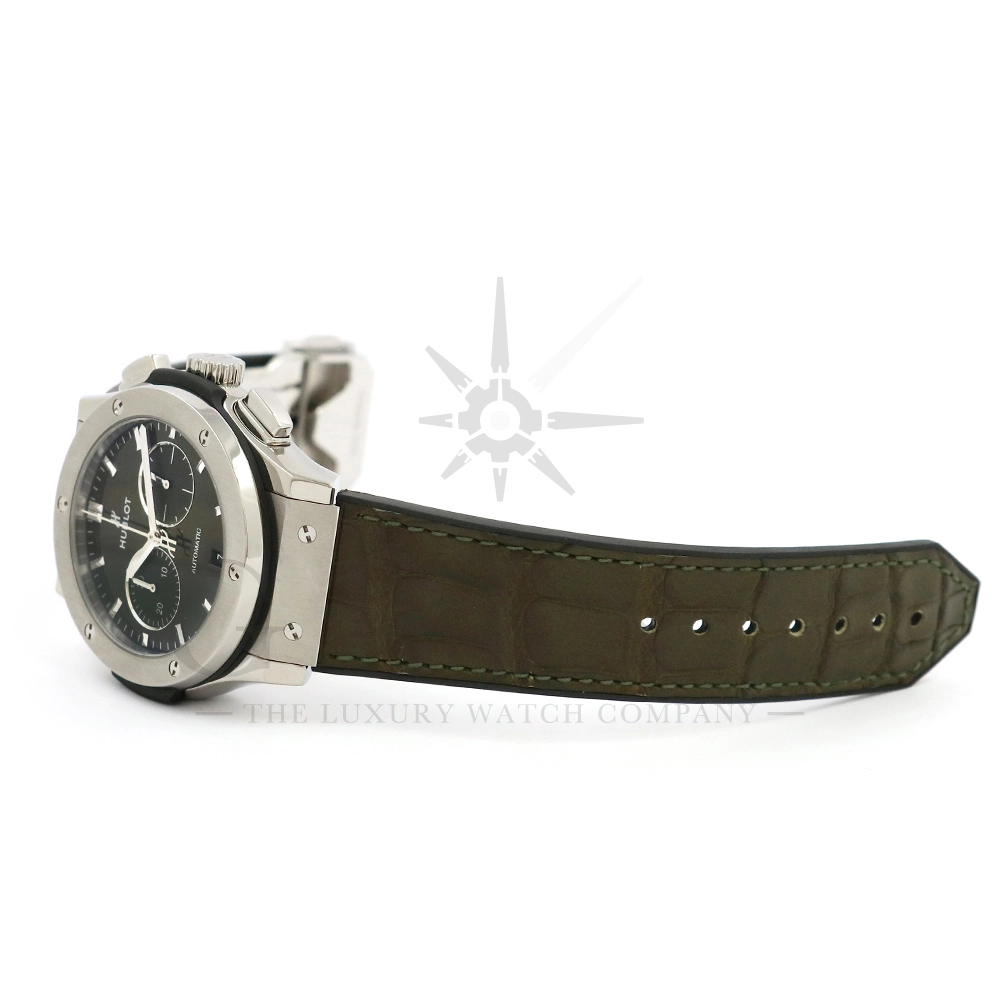 こちらはウブロ クラシック・フュージョン クロノグラフ チタニウム グリーンです。ケース素材にチタンを採用することで、軽量感もあり、とても着け心地の良いモデルになっています。ストラップも特徴的で、アリゲーター素材とラバーを組み合わせた「ラバー・グミアリゲーター」を採用しており、実用性の高さは抜群。ムーブメントはCal.HUB1143を搭載しており、シースルーバックからはその動きを堪能いただけます。ストラップのカラーと合わせたグリーンサンレイ文字盤は非常に美しく、ウブロらしい斬新的なアイデアが凝縮された一本です。