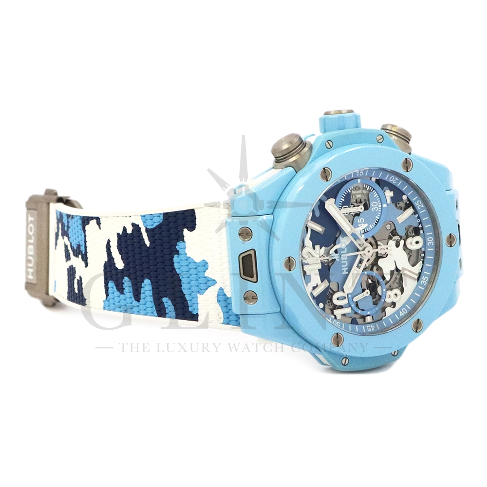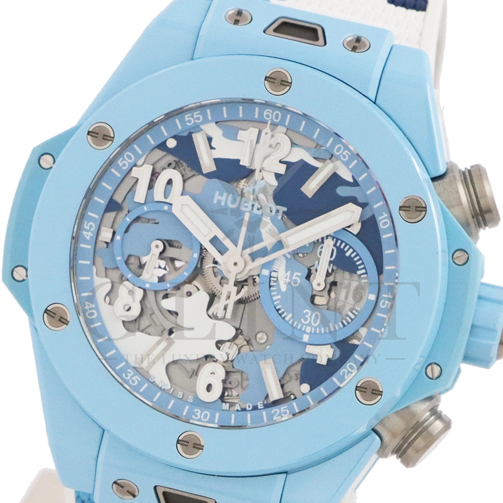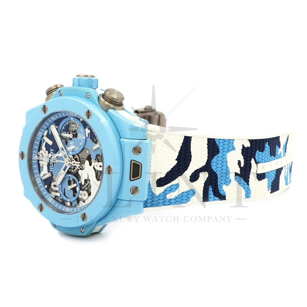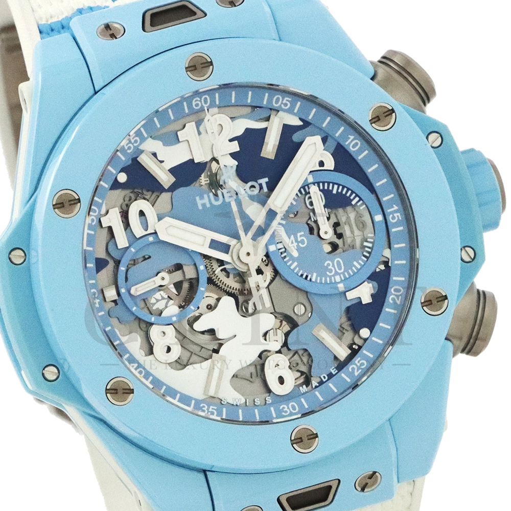 こちらはウブロ ビッグ・バン ウニコ スカイブルーカモ 日本限定100本モデルです。ウブロのシグネチャーであるハイテクセラミックをケースに採用。ビッグバン特有のケースが持つ強靭なイメージはそのままに、爽やかなスカイブルーのセラミックケース、ホワイトを基調としてブルー、スカイブルーが組み合わされたカモフラージュモチーフのラバーストラップ、カモフラージュモチーフを重ねたスケルトンダイアルにより、軽やかで大胆、洗練されたミリタリー調の迫力ある印象をお楽しみいただけます。ムーブメントには完全自社製となるCal.HUB1280を搭載しており、シースルーバックからその動きを堪能できます。斬新でウブロらしい独創的な雰囲気を堪能できる一本です。
