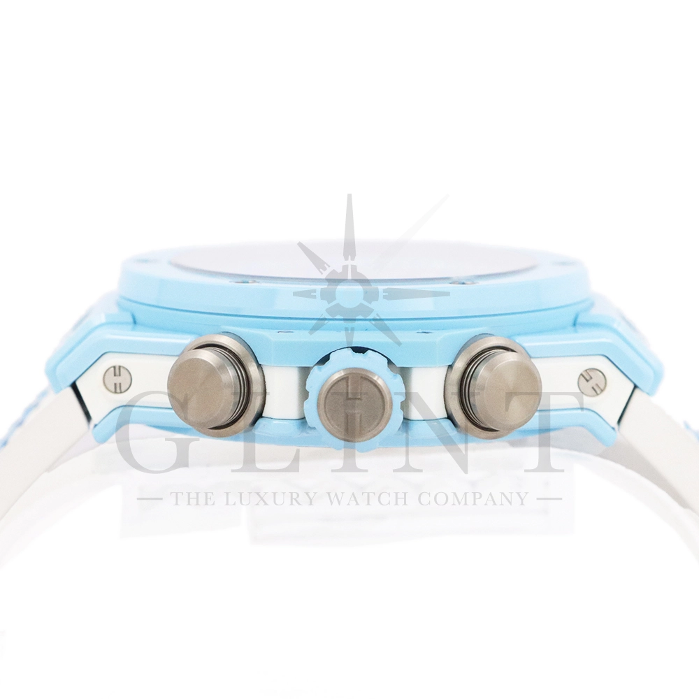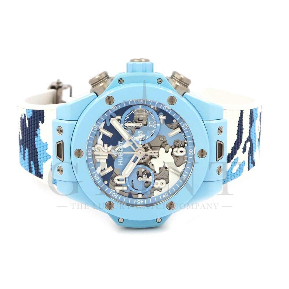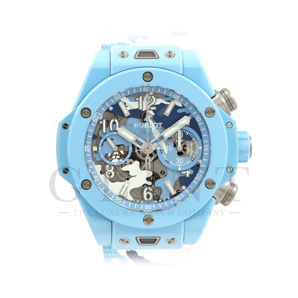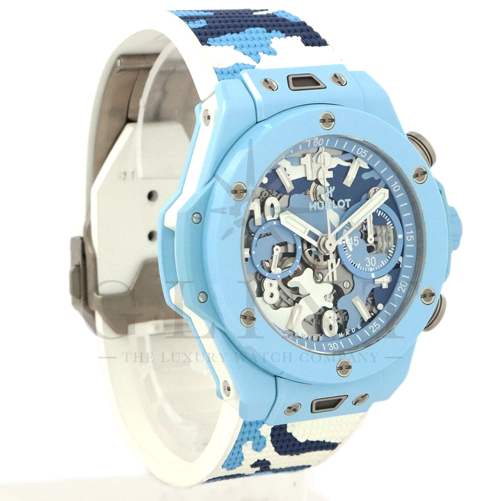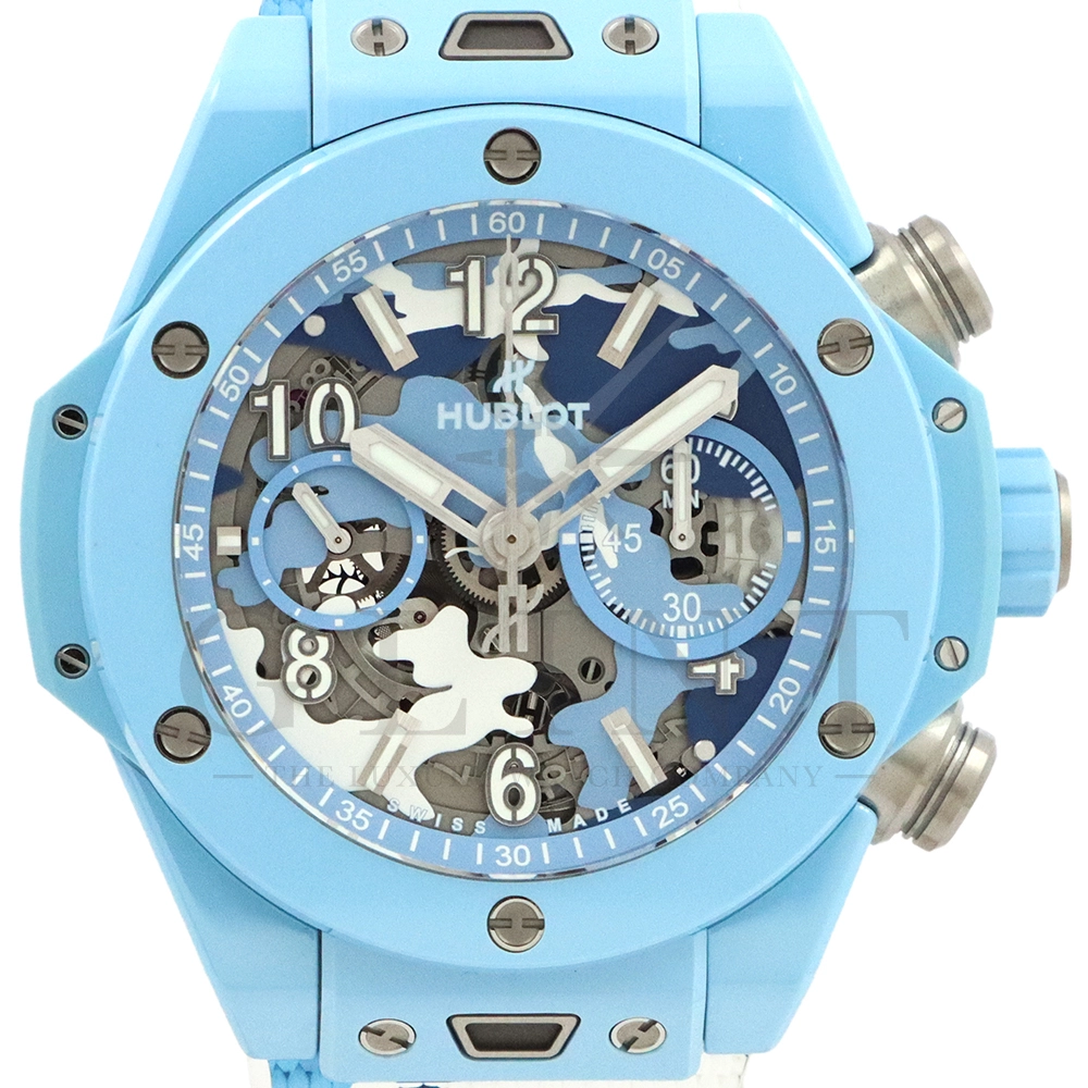 こちらはウブロ ビッグ・バン ウニコ スカイブルーカモ 日本限定100本モデルです。ウブロのシグネチャーであるハイテクセラミックをケースに採用。ビッグバン特有のケースが持つ強靭なイメージはそのままに、爽やかなスカイブルーのセラミックケース、ホワイトを基調としてブルー、スカイブルーが組み合わされたカモフラージュモチーフのラバーストラップ、カモフラージュモチーフを重ねたスケルトンダイアルにより、軽やかで大胆、洗練されたミリタリー調の迫力ある印象をお楽しみいただけます。ムーブメントには完全自社製となるCal.HUB1280を搭載しており、シースルーバックからその動きを堪能できます。斬新でウブロらしい独創的な雰囲気を堪能できる一本です。