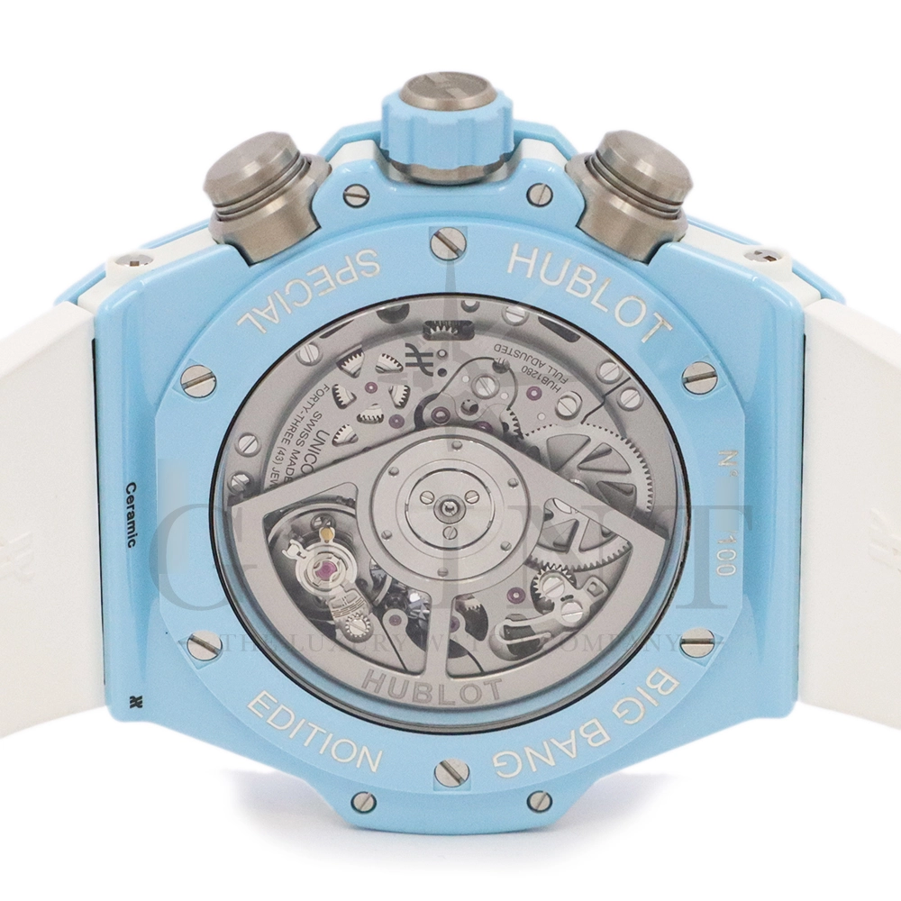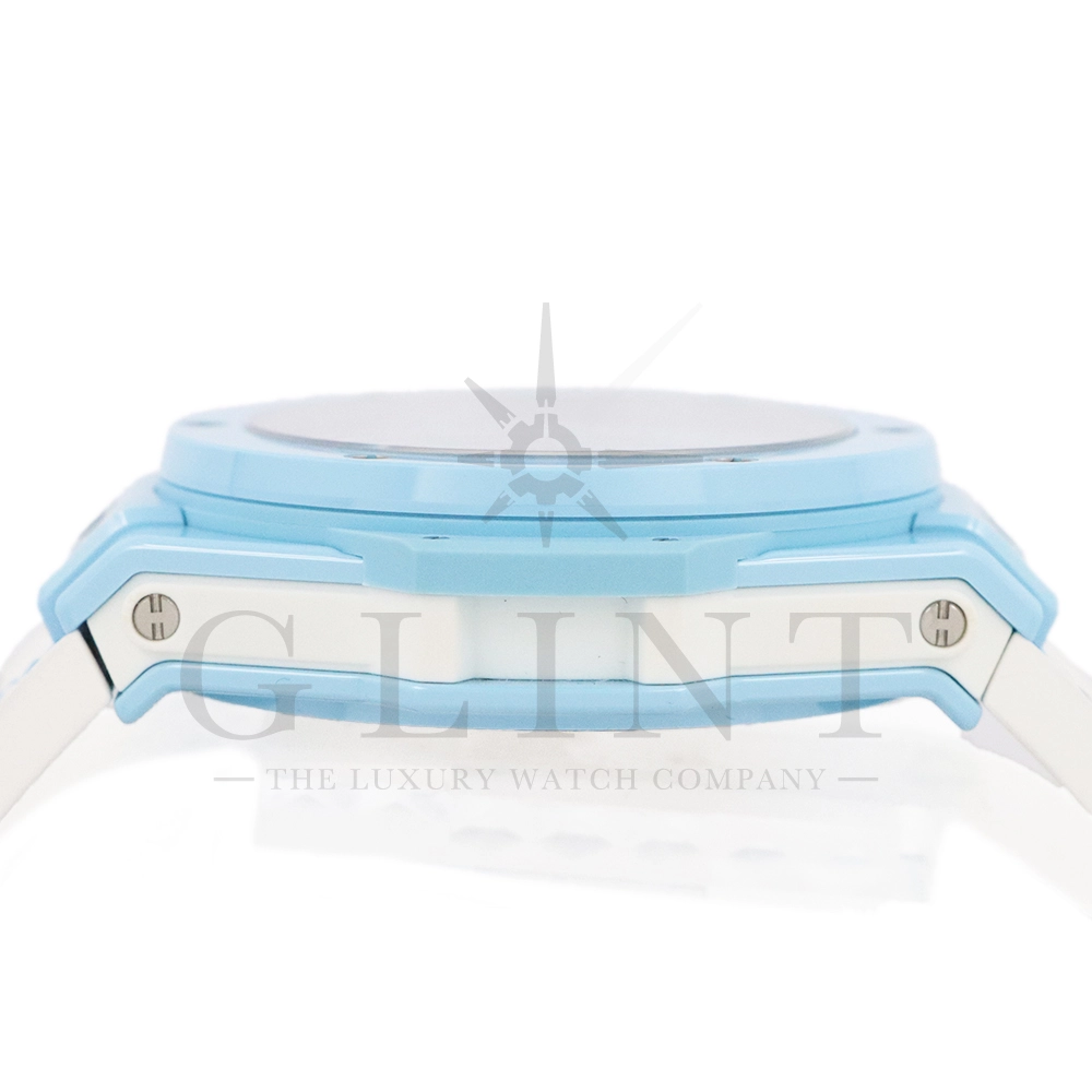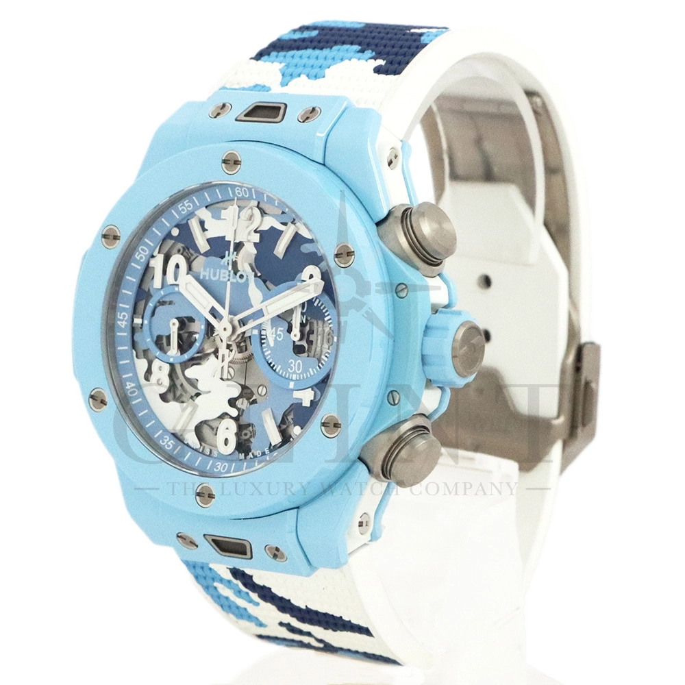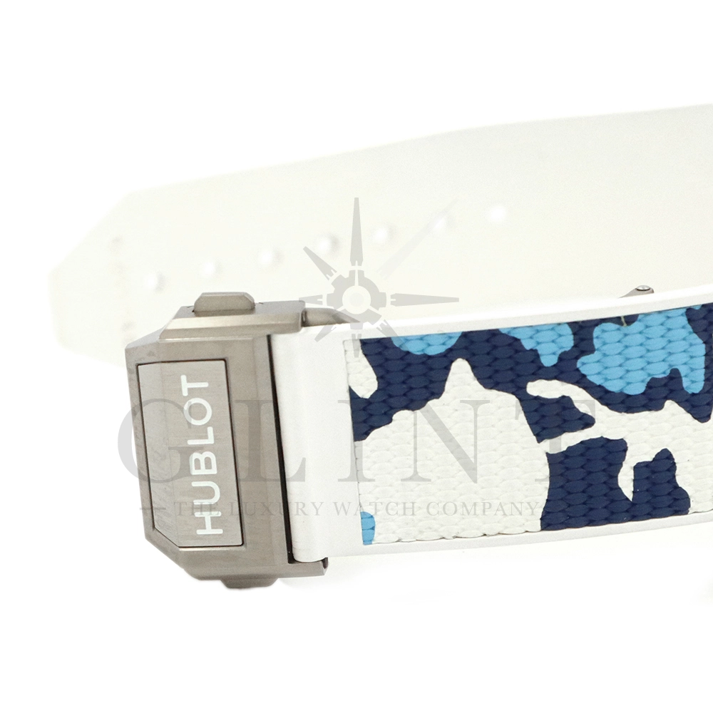 こちらはウブロ ビッグ・バン ウニコ スカイブルーカモ 日本限定100本モデルです。ウブロのシグネチャーであるハイテクセラミックをケースに採用。ビッグバン特有のケースが持つ強靭なイメージはそのままに、爽やかなスカイブルーのセラミックケース、ホワイトを基調としてブルー、スカイブルーが組み合わされたカモフラージュモチーフのラバーストラップ、カモフラージュモチーフを重ねたスケルトンダイアルにより、軽やかで大胆、洗練されたミリタリー調の迫力ある印象をお楽しみいただけます。ムーブメントには完全自社製となるCal.HUB1280を搭載しており、シースルーバックからその動きを堪能できます。斬新でウブロらしい独創的な雰囲気を堪能できる一本です。