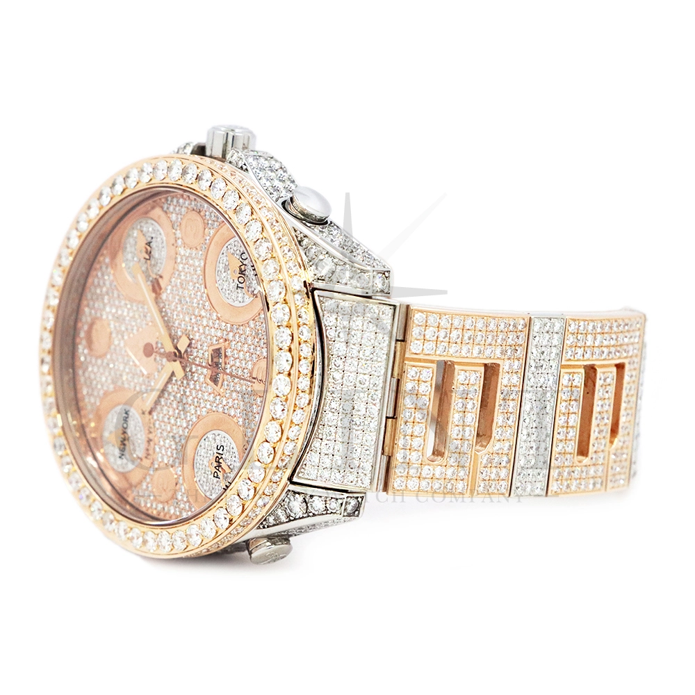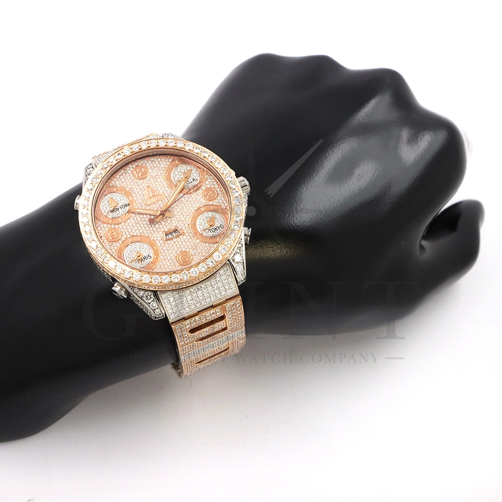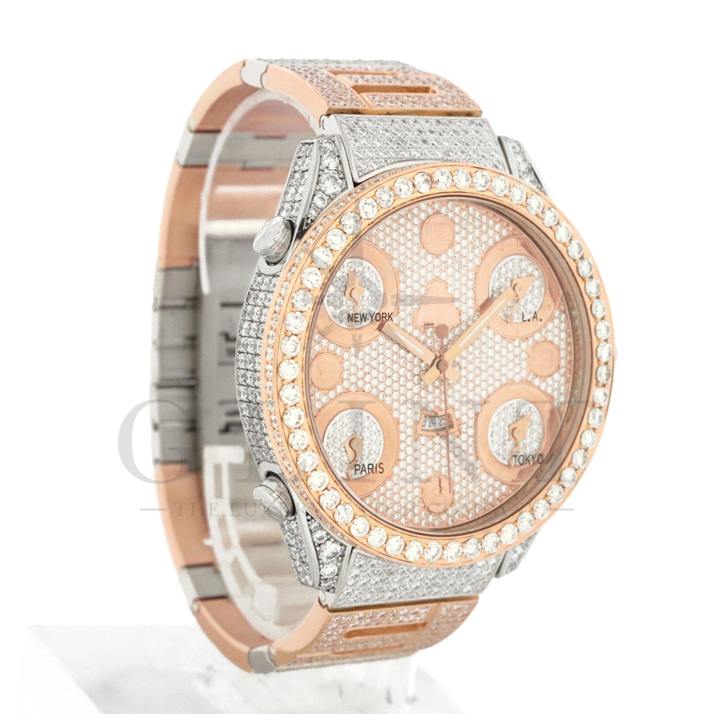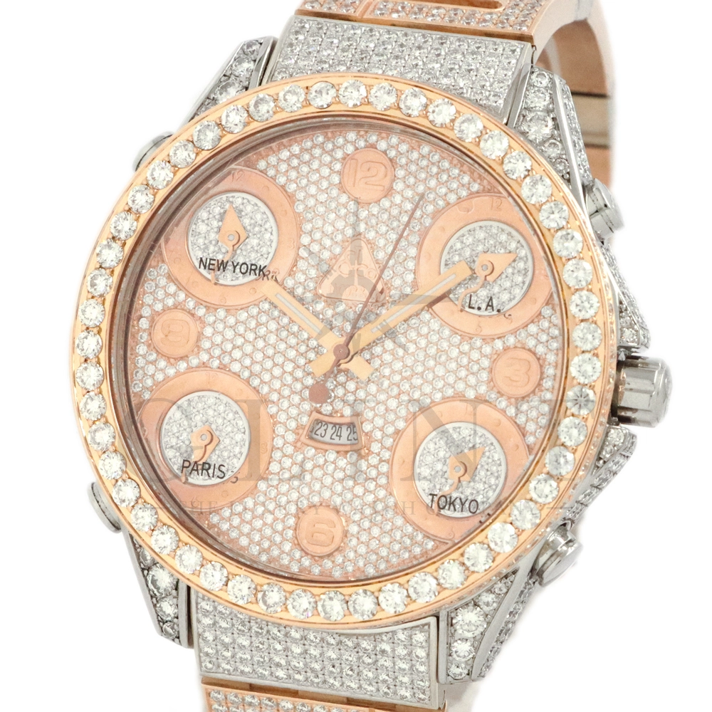 こちらはJACOB&CO.(ジェイコブ)の代表作となるファイブタイムゾーンです。ホームタイムの他に、ニューヨーク、パリ、ロサンゼルス、東京と4か国の時刻表示を可能としており、世界を股に掛けて活躍するセレブやビジネスマンの為に考えられた遊び心溢れる外観が特徴的。素材には18Kホワイトゴールドと18Kローズゴールドを使用しており、ゴージャスな印象を与えてくれるでしょう。ベゼル、文字盤のみならず、ケース全面やベゼルのサイドにもダイヤモンドが美しくセッティングされており、他のファイブタイムゾーンと比較しても圧倒的な存在感を放ってくれます。いつまでも変わらないインパクトと輝きを放ち続けるジェイコブ ファイブタイムゾーン。オシャレに攻めたい時にオススメの一本です。