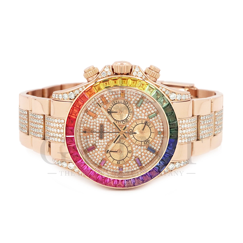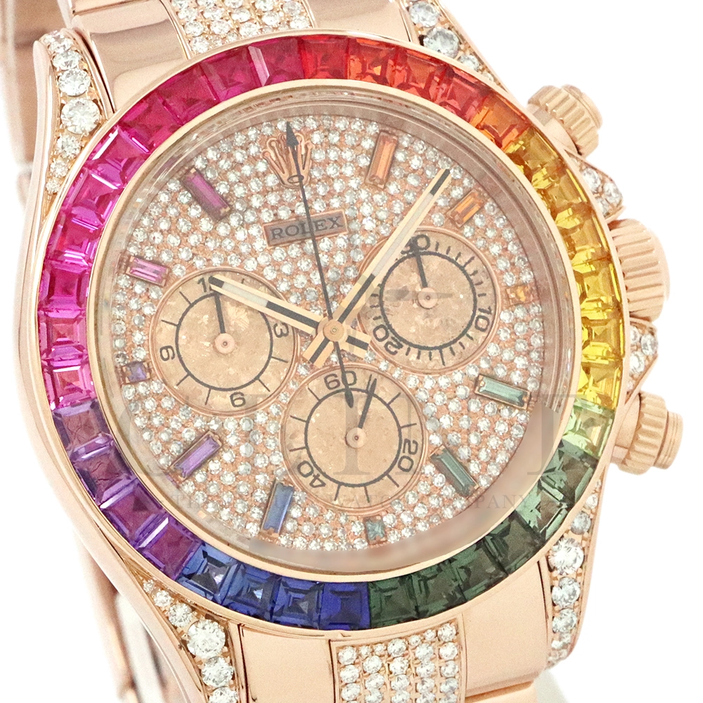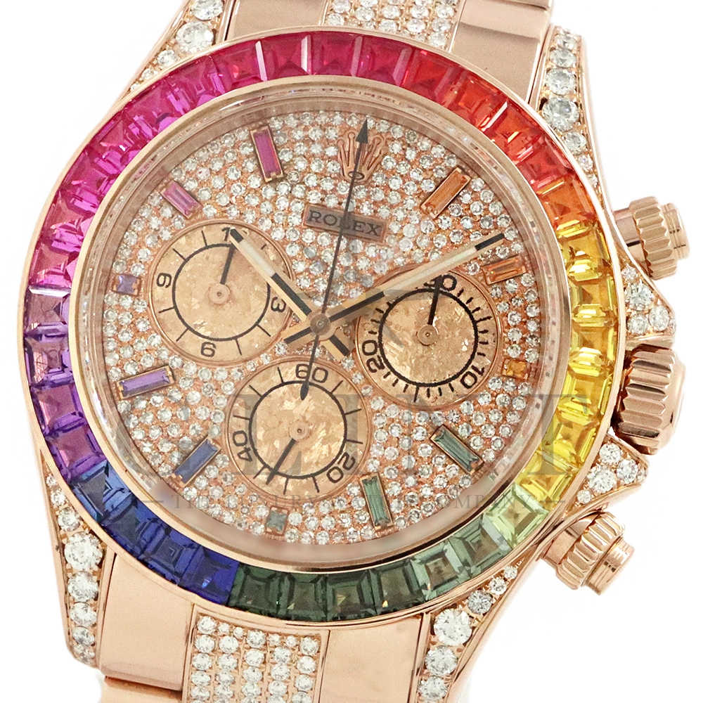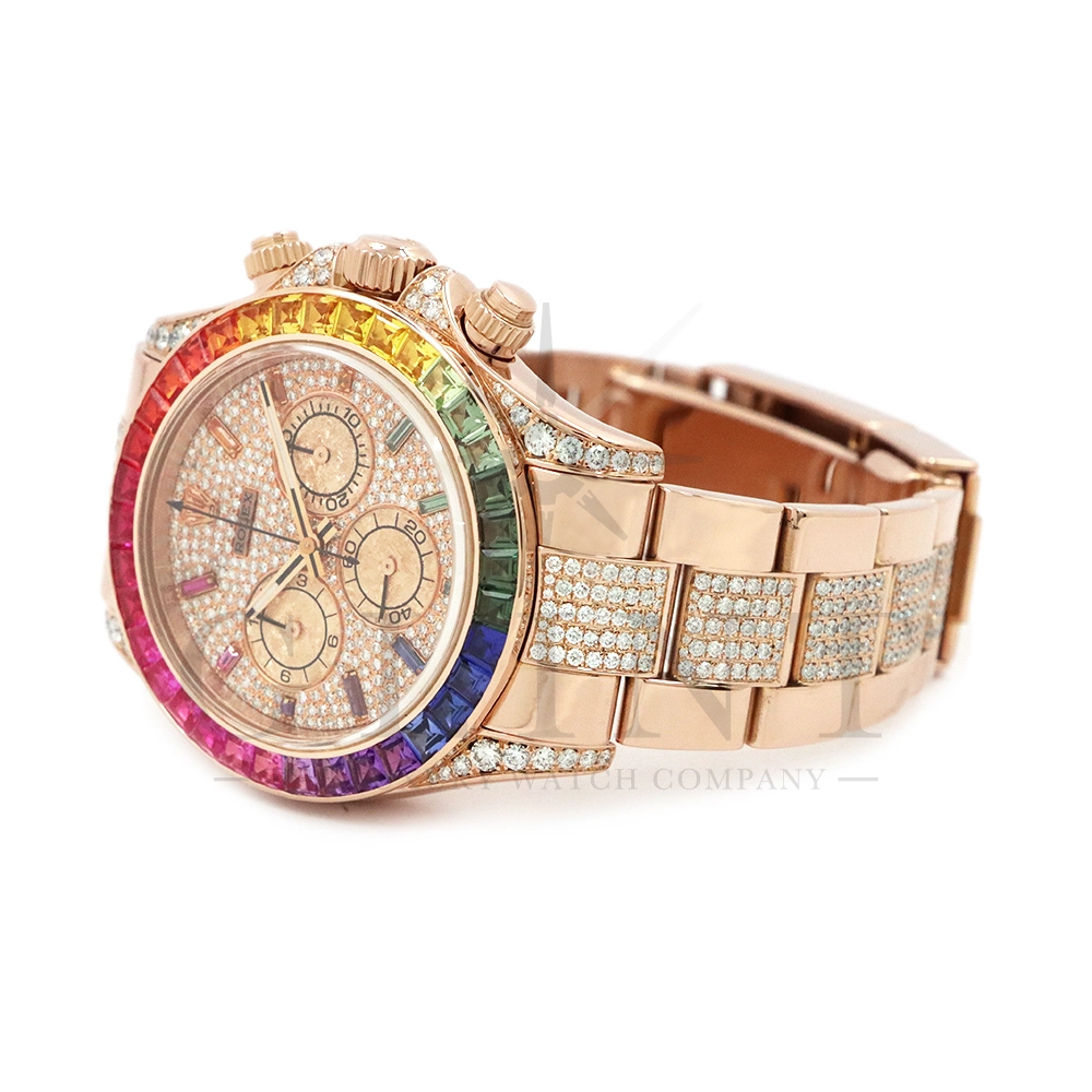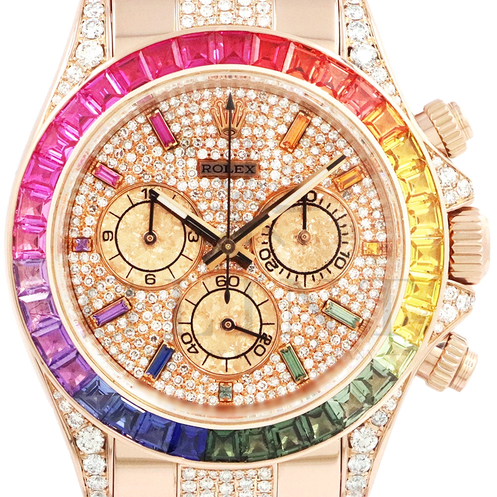 こちらはロレックス デイトナです。素材にはエバーローズゴールドを使用。そしてベゼルにはレインボーカラーで宝石がセッティングされ、ラグやリューズガード、文字盤、ブレスレットにまで最高品質のダイヤモンドがセッティングされており、大変豪華な印象を与えてくれるでしょう。オイスターブレスレットの両端は鏡面仕上げが施されており、より高級感を感じさせてくれる仕上がりに。この美しさにはたちまち魅了してくれる事は間違いありません。ラグジュアリーなデイトナで他のモデルでは味わえない特別な雰囲気を堪能してみてはいかがでしょうか。