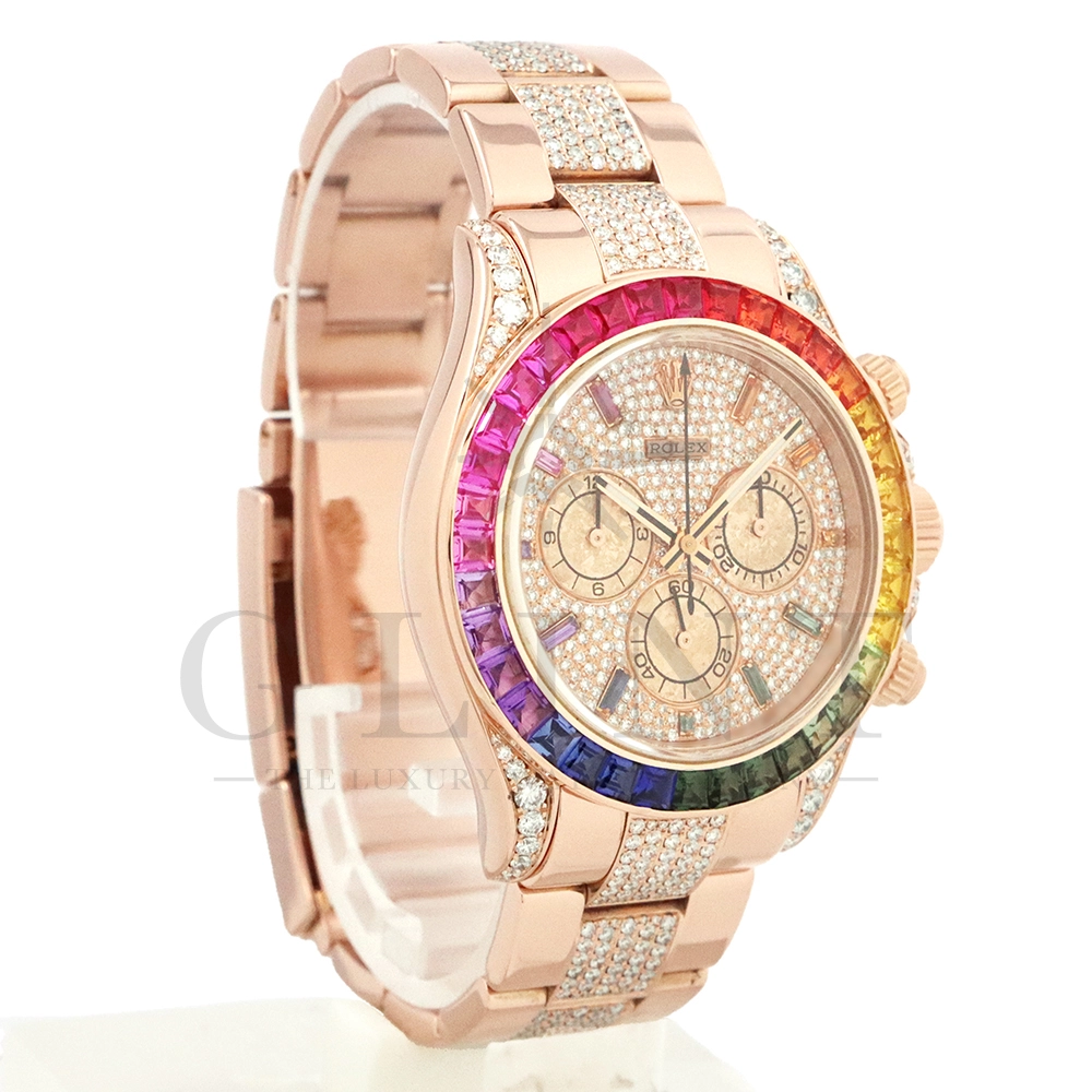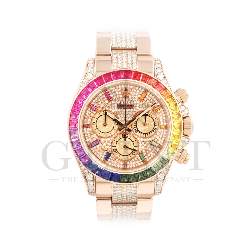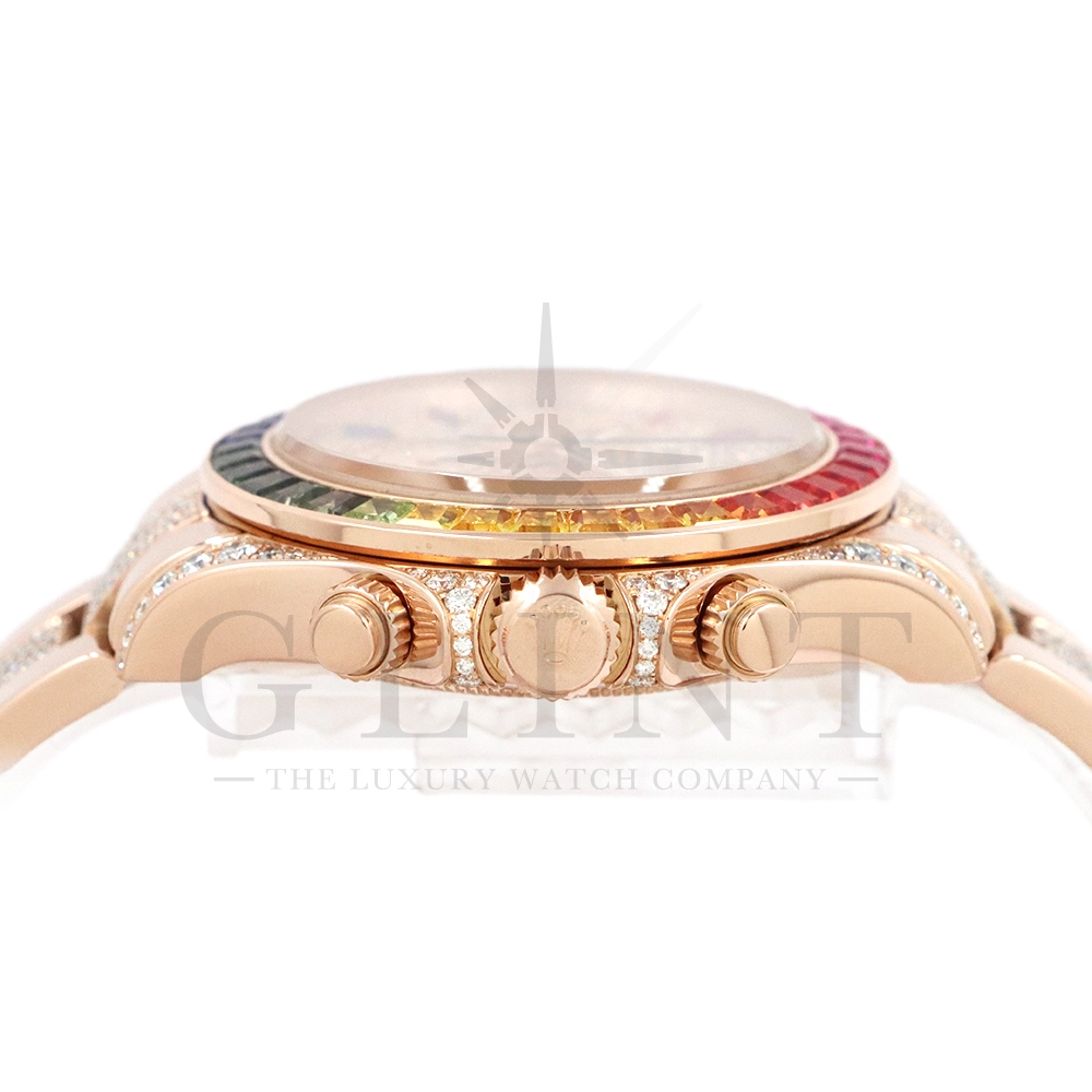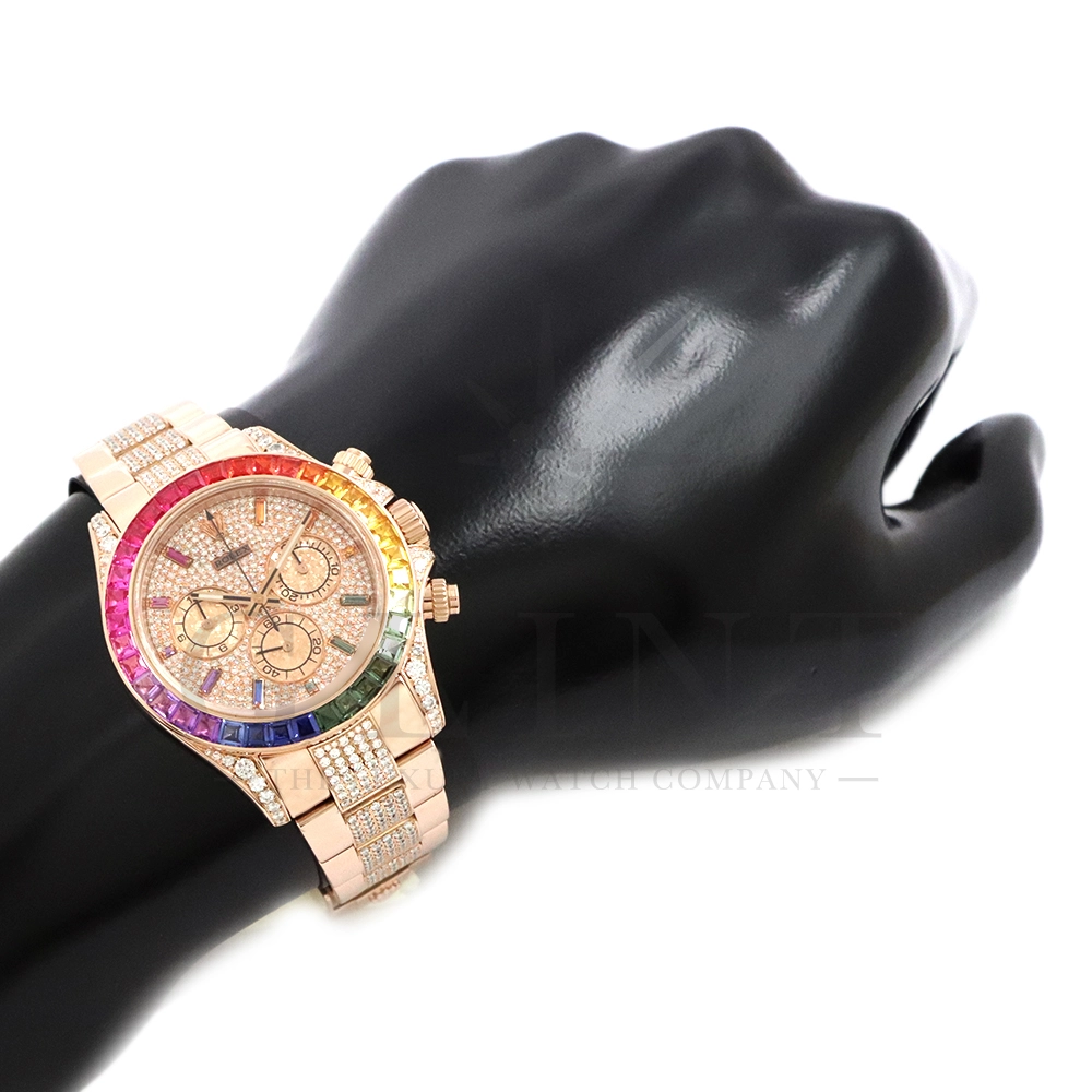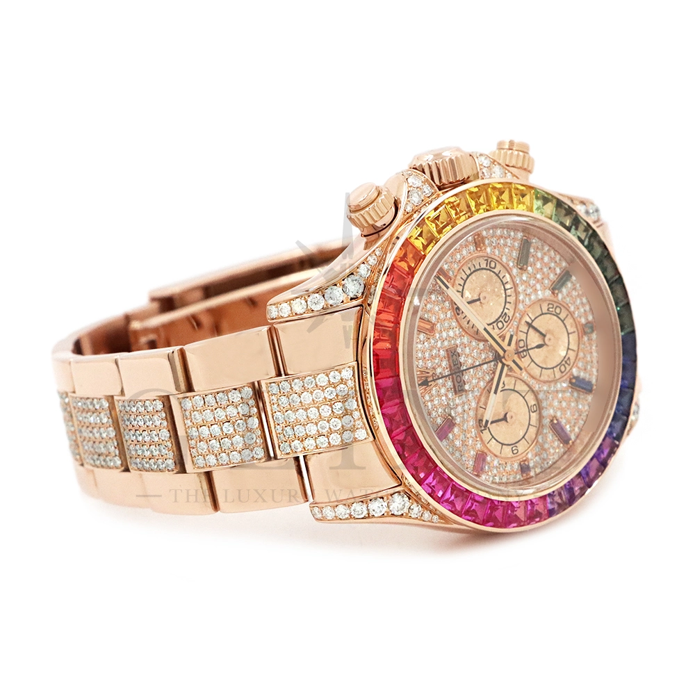 こちらはロレックス デイトナです。素材にはエバーローズゴールドを使用。そしてベゼルにはレインボーカラーで宝石がセッティングされ、ラグやリューズガード、文字盤、ブレスレットにまで最高品質のダイヤモンドがセッティングされており、大変豪華な印象を与えてくれるでしょう。オイスターブレスレットの両端は鏡面仕上げが施されており、より高級感を感じさせてくれる仕上がりに。この美しさにはたちまち魅了してくれる事は間違いありません。ラグジュアリーなデイトナで他のモデルでは味わえない特別な雰囲気を堪能してみてはいかがでしょうか。