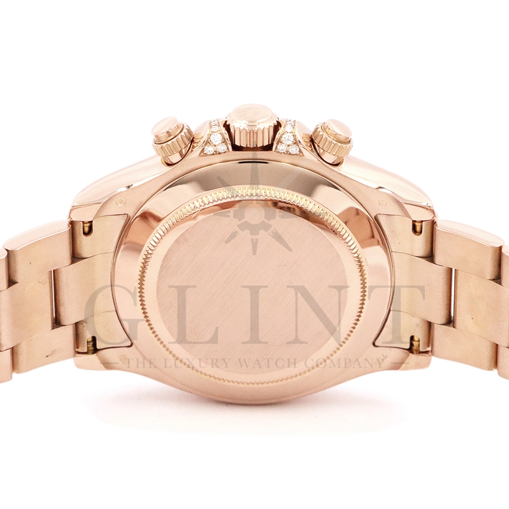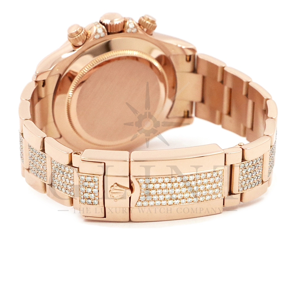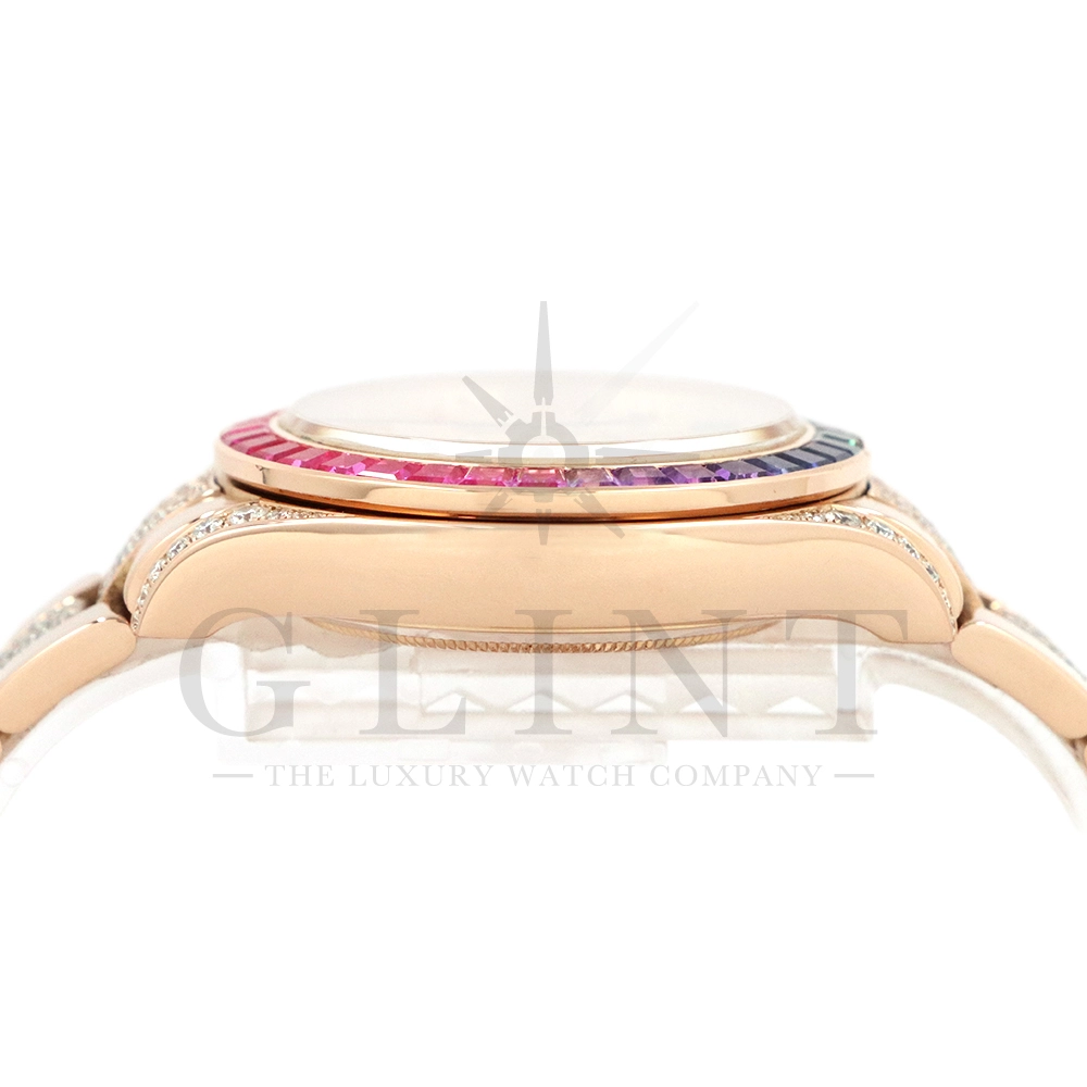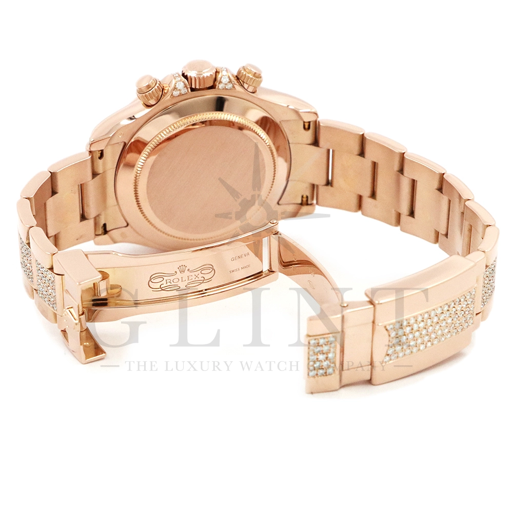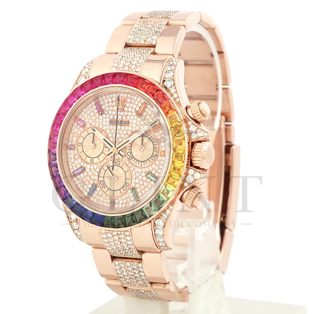 こちらはロレックス デイトナです。素材にはエバーローズゴールドを使用。そしてベゼルにはレインボーカラーで宝石がセッティングされ、ラグやリューズガード、文字盤、ブレスレットにまで最高品質のダイヤモンドがセッティングされており、大変豪華な印象を与えてくれるでしょう。オイスターブレスレットの両端は鏡面仕上げが施されており、より高級感を感じさせてくれる仕上がりに。この美しさにはたちまち魅了してくれる事は間違いありません。ラグジュアリーなデイトナで他のモデルでは味わえない特別な雰囲気を堪能してみてはいかがでしょうか。