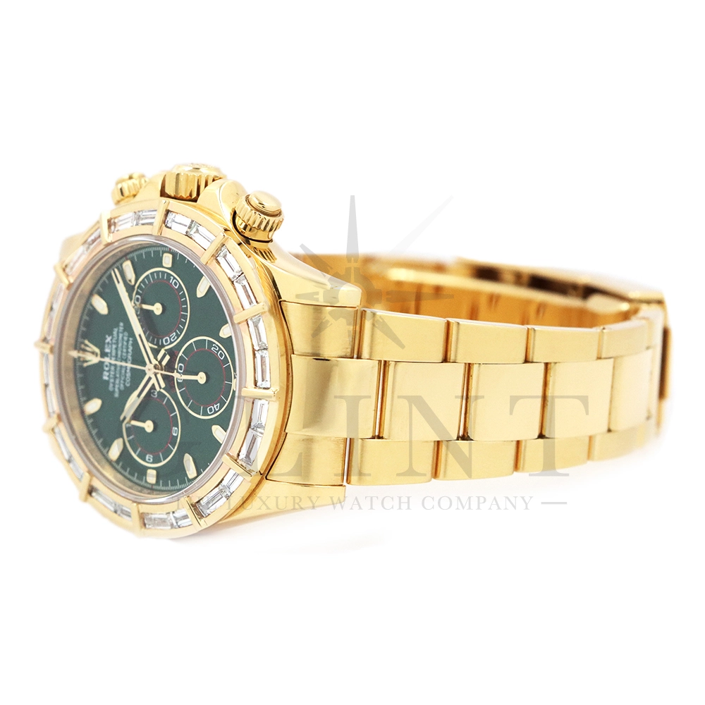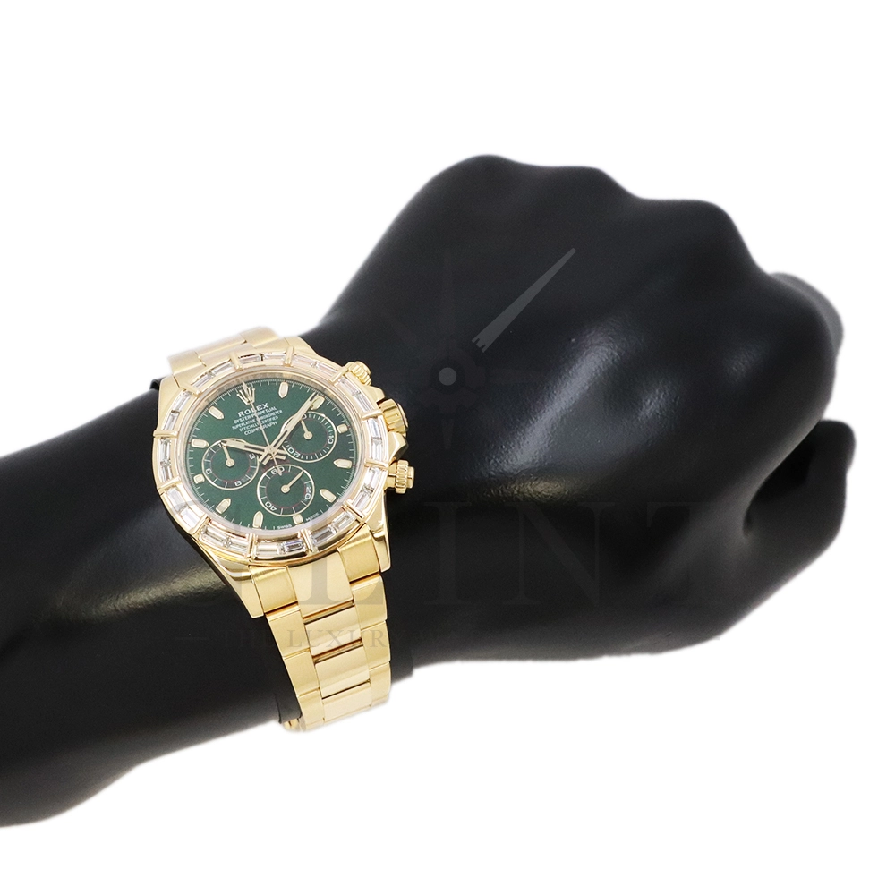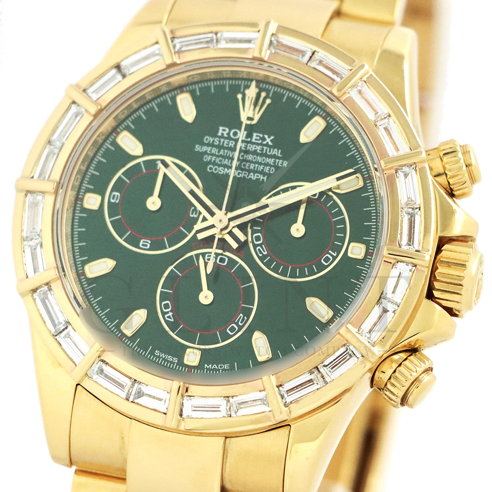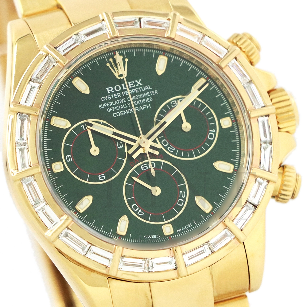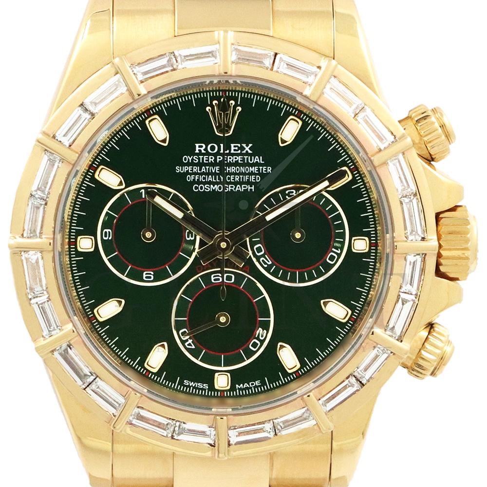 こちらはロレックス デイトナです。18Kイエローゴールド製ケースにグリーンダイヤルを組み合わせた、圧倒的な存在感と希少性を誇る一本です。深みのあるグリーン文字盤は、光の当たり方によって表情を変え、イエローゴールドとのコントラストが非常に美しく、ラグジュアリーでありながらスポーティな印象を演出してくれるでしょう。18Kイエローゴールドのベゼルにはカスタムされた24pcものバゲットダイヤモンドがセッティングされており、大変豪華な印象を与えてくれます。搭載ムーブメントはロレックス自社製クロノグラフムーブメント「Cal.4130」。高い精度と耐久性を兼ね備え、実用性においても申し分のない仕上がりです。近年は生産終了に伴い市場流通数が限られ、国内外で非常に高い人気と資産価値を維持しているモデルです。所有する喜びと将来的価値を兼ね備えた、まさに特別なデイトナと言えるでしょう。