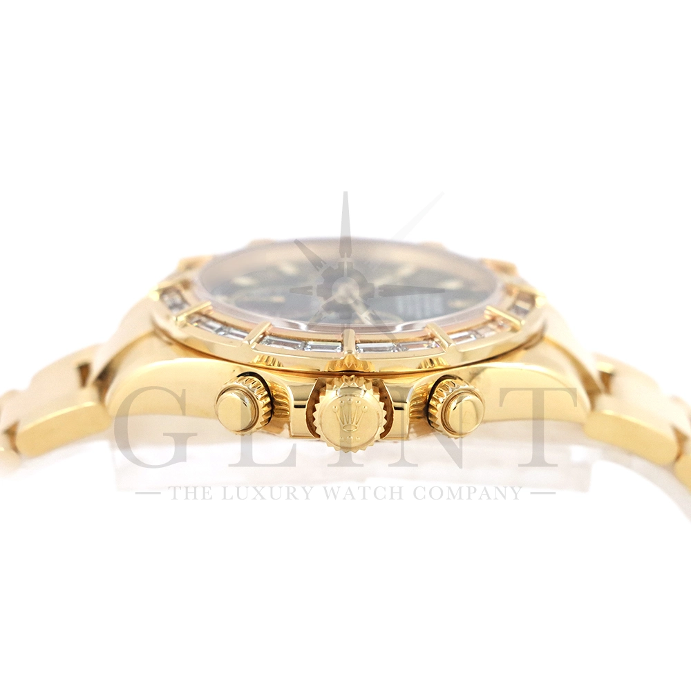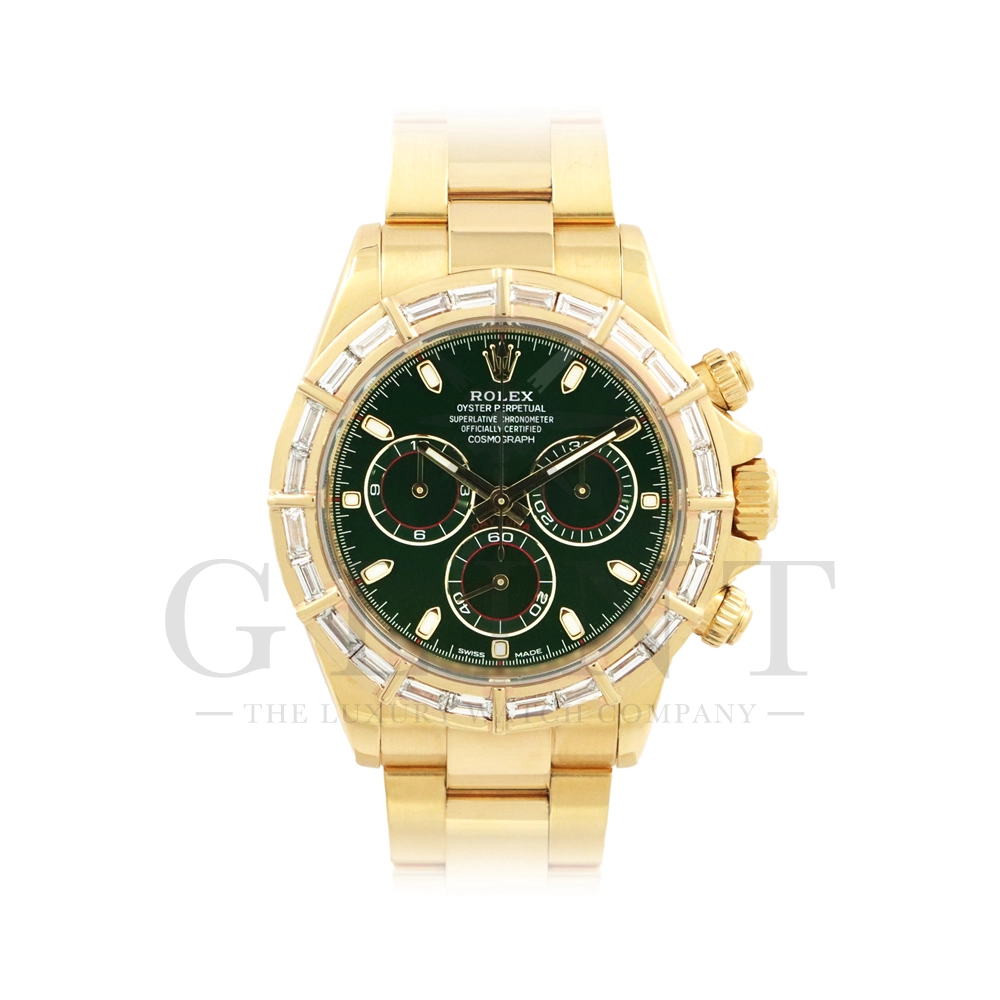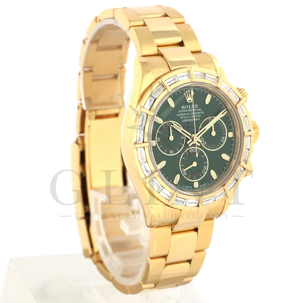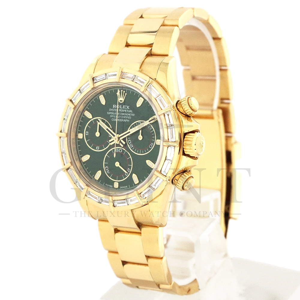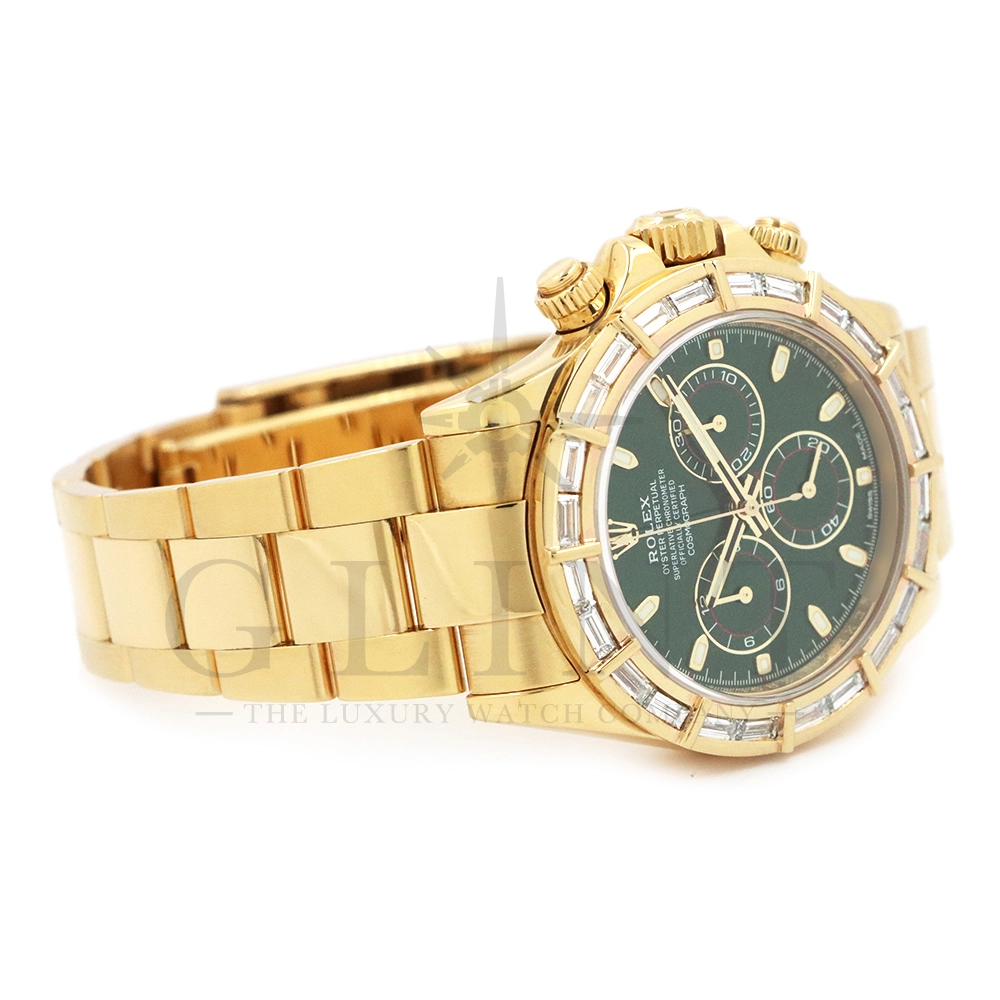 こちらはロレックス デイトナです。18Kイエローゴールド製ケースにグリーンダイヤルを組み合わせた、圧倒的な存在感と希少性を誇る一本です。深みのあるグリーン文字盤は、光の当たり方によって表情を変え、イエローゴールドとのコントラストが非常に美しく、ラグジュアリーでありながらスポーティな印象を演出してくれるでしょう。18Kイエローゴールドのベゼルにはカスタムされた24pcものバゲットダイヤモンドがセッティングされており、大変豪華な印象を与えてくれます。搭載ムーブメントはロレックス自社製クロノグラフムーブメント「Cal.4130」。高い精度と耐久性を兼ね備え、実用性においても申し分のない仕上がりです。近年は生産終了に伴い市場流通数が限られ、国内外で非常に高い人気と資産価値を維持しているモデルです。所有する喜びと将来的価値を兼ね備えた、まさに特別なデイトナと言えるでしょう。