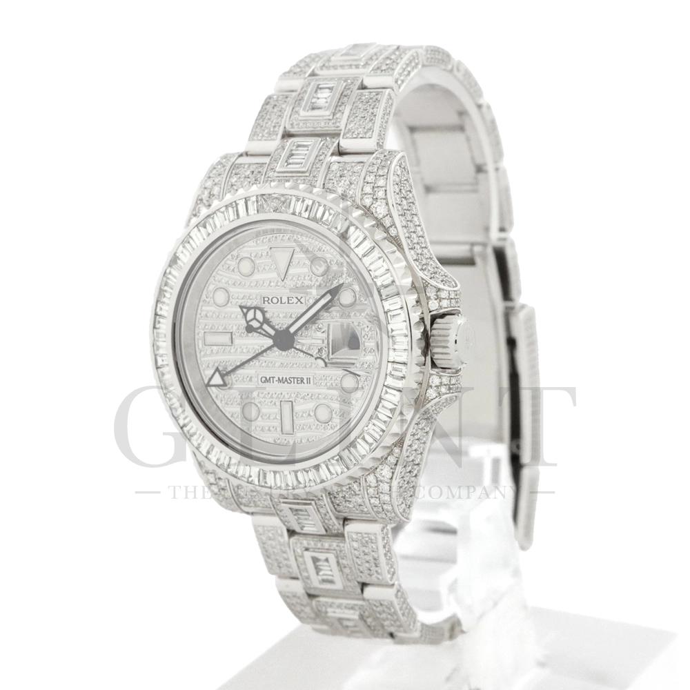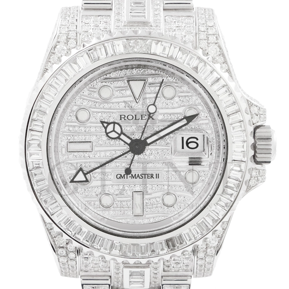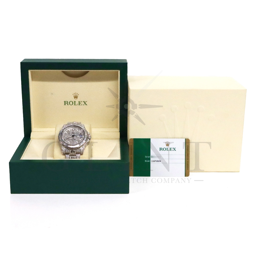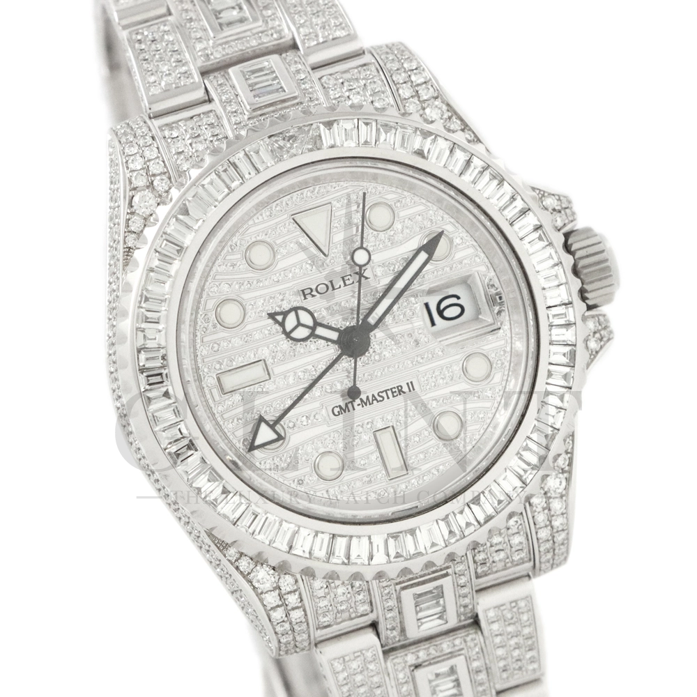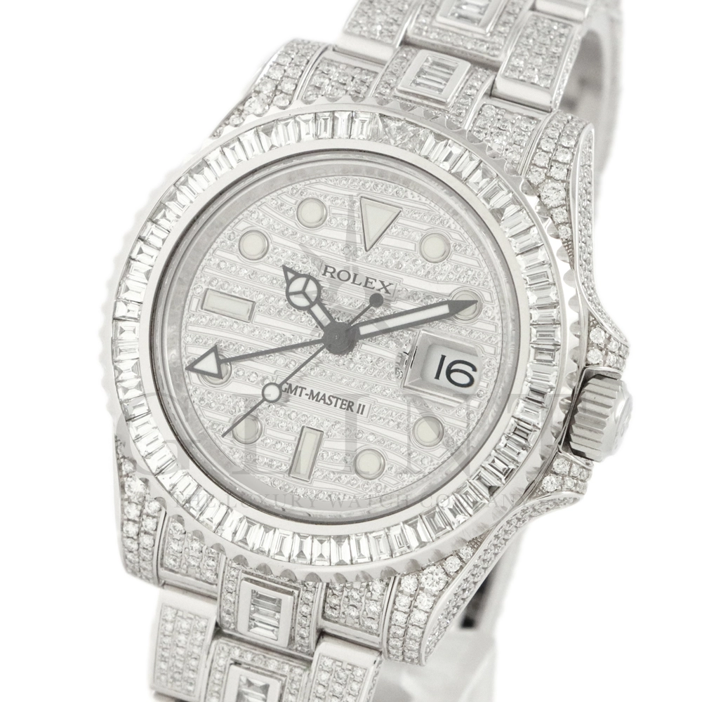 こちらはロレックス GMTマスターII 116710LNです。ベゼルとブレスレット中央に大粒のバゲットダイヤモンド、時計全体の至る所まで極上のパヴェダイヤモンドがセッティングされた116769TBR仕様の最上級モデル。他には類を見ない圧倒的な存在感でお客様の腕元を華やかに彩り、周囲の視線を一瞬にして独占してくれる事は間違いありません。搭載されているロレックスが独自に開発・製造したCal.3186は、衝撃と温度変化に対して優れた耐久性を発揮するパラクロム・ヘアスプリングを装備し、並外れた信頼性を実現しております。先ず他では見かける事の無い最上級のGMTマスターIIで自分だけの魅力を演出してみてはいかがでしょうか。