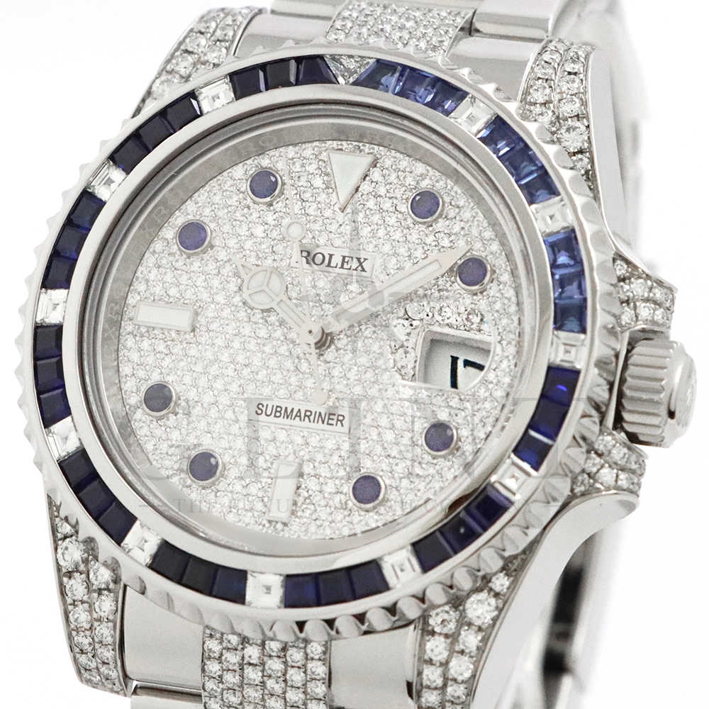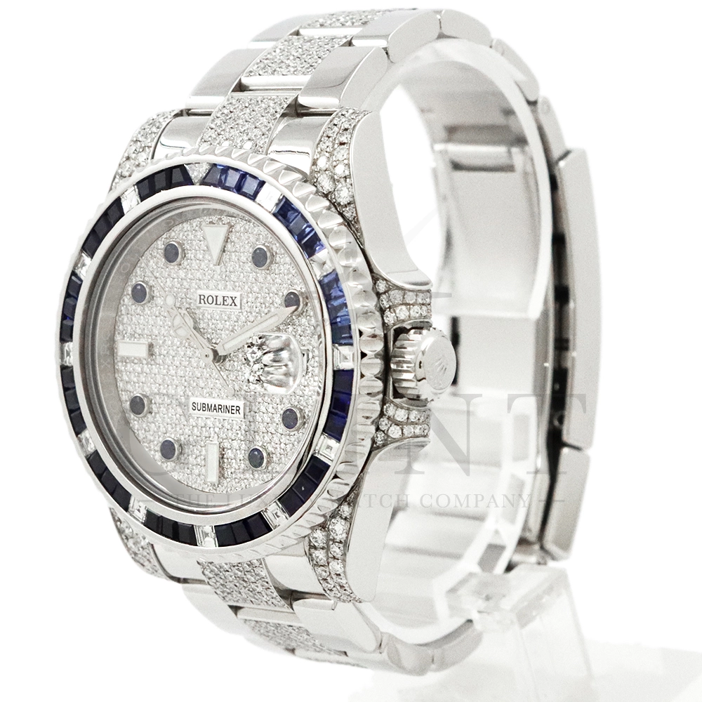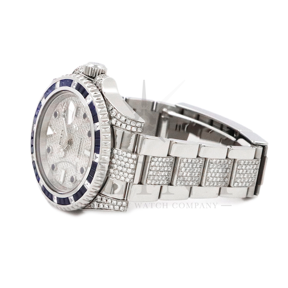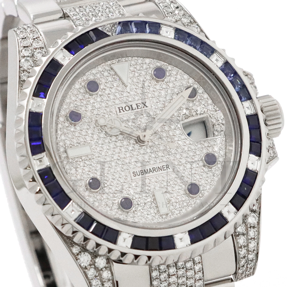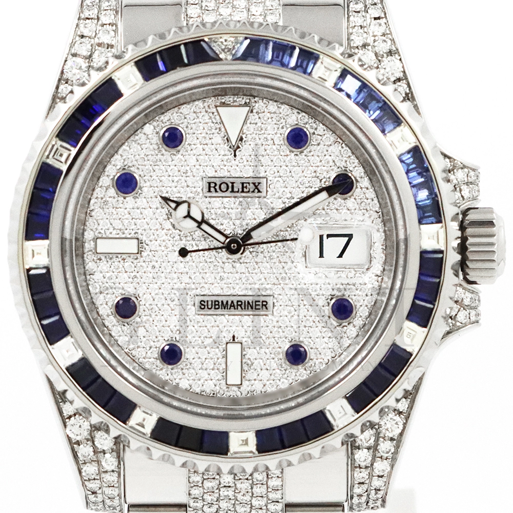 こちらはロレックス サブマリーナーデイトです。ロレックスのダイバーズウォッチの象徴的モデルとして高い人気を誇る116610LNをベースに、ラグジュアリーなダイヤモンドカスタムを施した特別仕様の一本です。文字盤およびブレスレットに贅沢にダイヤモンドをセッティングした圧倒的な存在感を放つモデルとなっています。ベースとなるサブマリーナーデイト116610LNは、ブラックセラクロムベゼルと40mmのステンレススチールケースを採用したプロフェッショナルダイバーズウォッチで、300m防水性能を誇る高い実用性を備えています。ムーブメントにはロレックス自社製キャリバー3135を搭載し、優れた精度と耐久性、そして約48時間のパワーリザーブを実現。本個体は、文字盤全面にダイヤモンドを敷き詰めたアフターダイヤ文字盤を採用し、光の角度によってきらびやかな輝きを放ちます。さらにブレスレットにもダイヤモンドセッティングが施されており、スポーツモデルの力強さとジュエリーウォッチの華やかさを融合させたラグジュアリーな仕上がりに。サブマリーナー本来の堅牢な作りと防水性能を保ちながら、ハイジュエリーのような存在感を楽しめる一本。人とは違う特別なロレックスをお探しの方や、インパクトのあるラグジュアリーウォッチをお求めの方におすすめのカスタムモデルです。