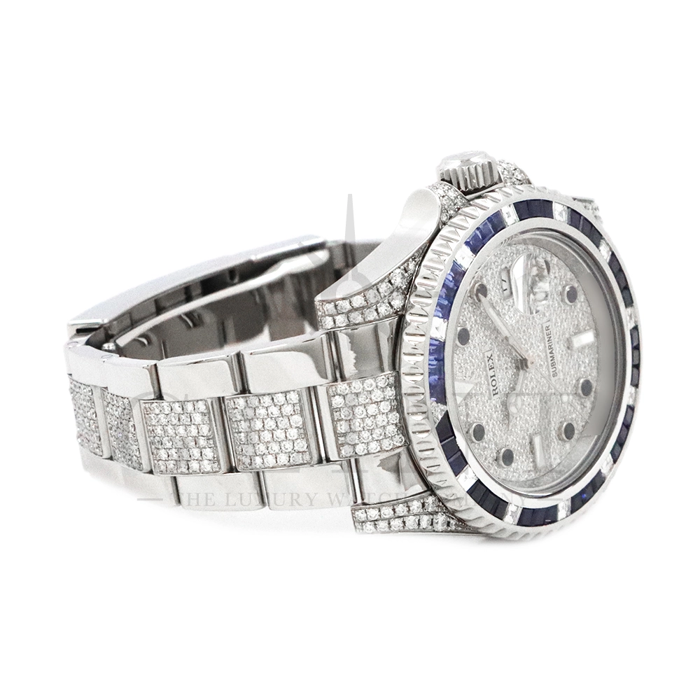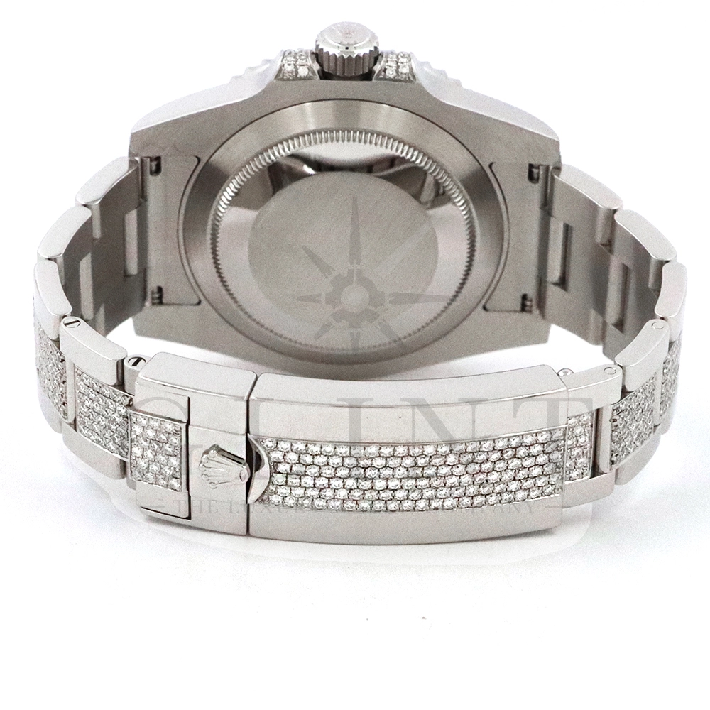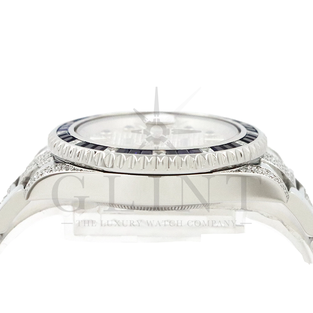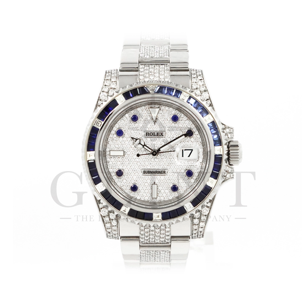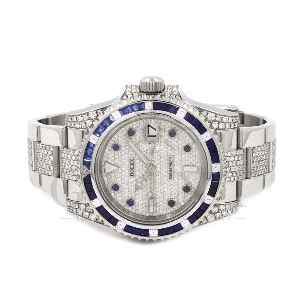 こちらはロレックス サブマリーナーデイトです。ロレックスのダイバーズウォッチの象徴的モデルとして高い人気を誇る116610LNをベースに、ラグジュアリーなダイヤモンドカスタムを施した特別仕様の一本です。文字盤およびブレスレットに贅沢にダイヤモンドをセッティングした圧倒的な存在感を放つモデルとなっています。ベースとなるサブマリーナーデイト116610LNは、ブラックセラクロムベゼルと40mmのステンレススチールケースを採用したプロフェッショナルダイバーズウォッチで、300m防水性能を誇る高い実用性を備えています。ムーブメントにはロレックス自社製キャリバー3135を搭載し、優れた精度と耐久性、そして約48時間のパワーリザーブを実現。本個体は、文字盤全面にダイヤモンドを敷き詰めたアフターダイヤ文字盤を採用し、光の角度によってきらびやかな輝きを放ちます。さらにブレスレットにもダイヤモンドセッティングが施されており、スポーツモデルの力強さとジュエリーウォッチの華やかさを融合させたラグジュアリーな仕上がりに。サブマリーナー本来の堅牢な作りと防水性能を保ちながら、ハイジュエリーのような存在感を楽しめる一本。人とは違う特別なロレックスをお探しの方や、インパクトのあるラグジュアリーウォッチをお求めの方におすすめのカスタムモデルです。