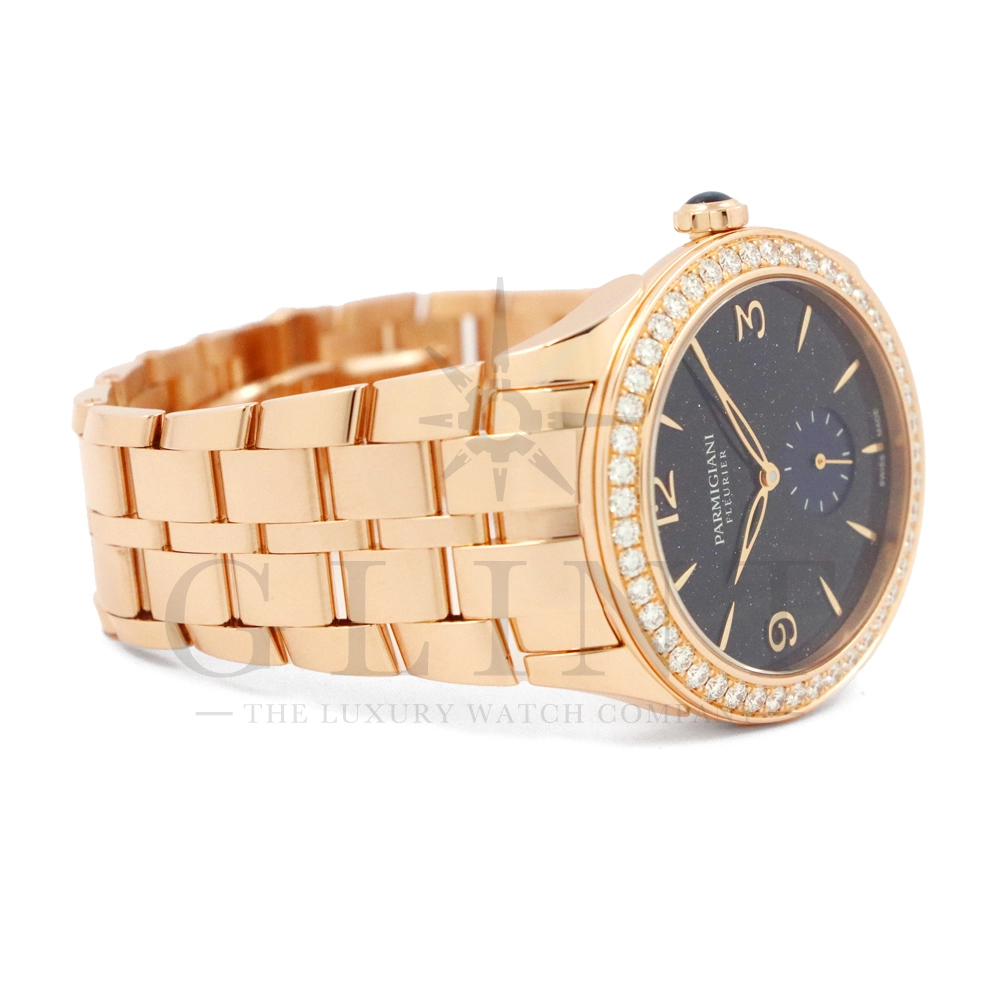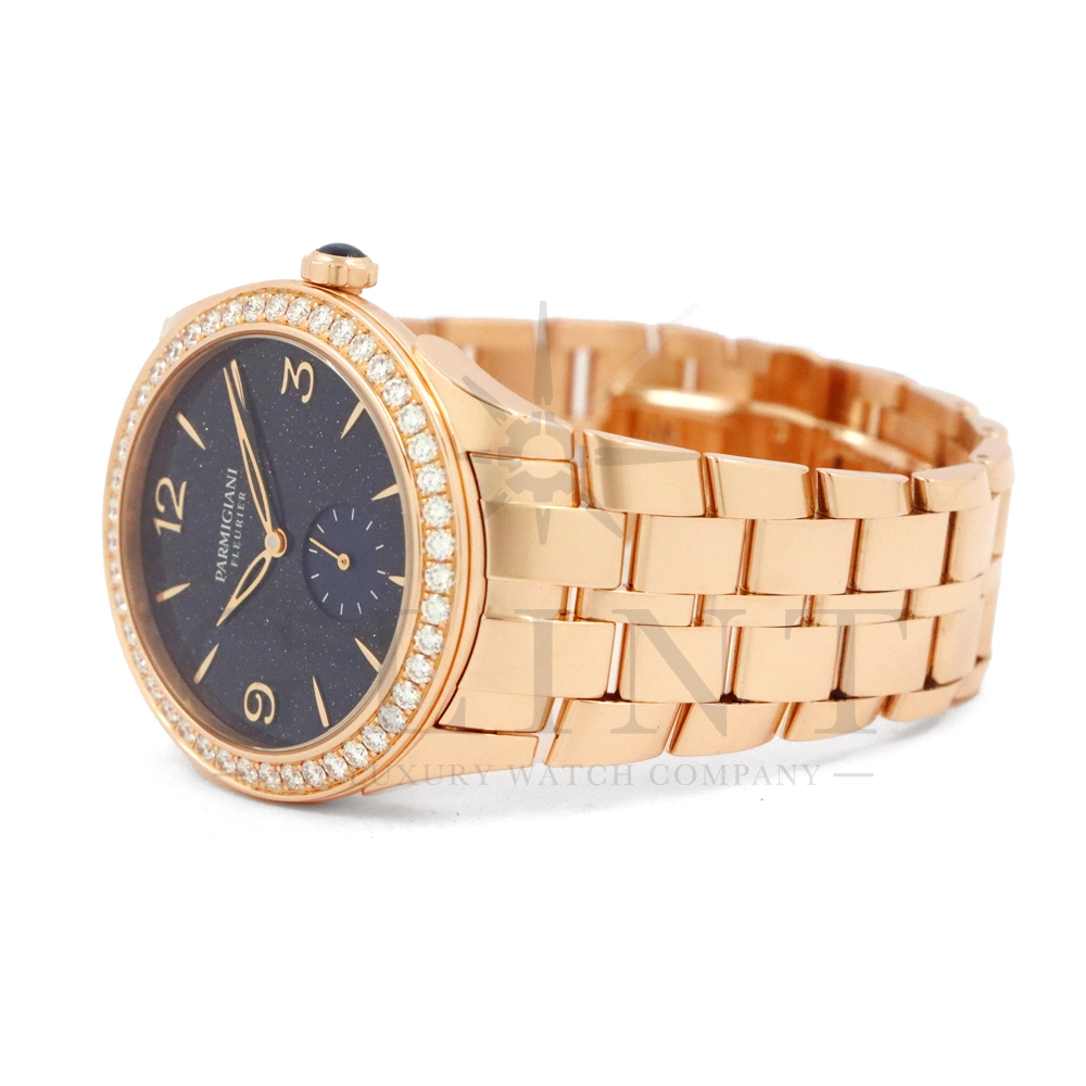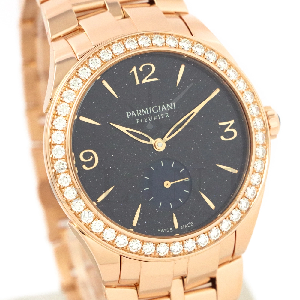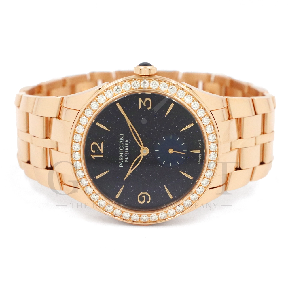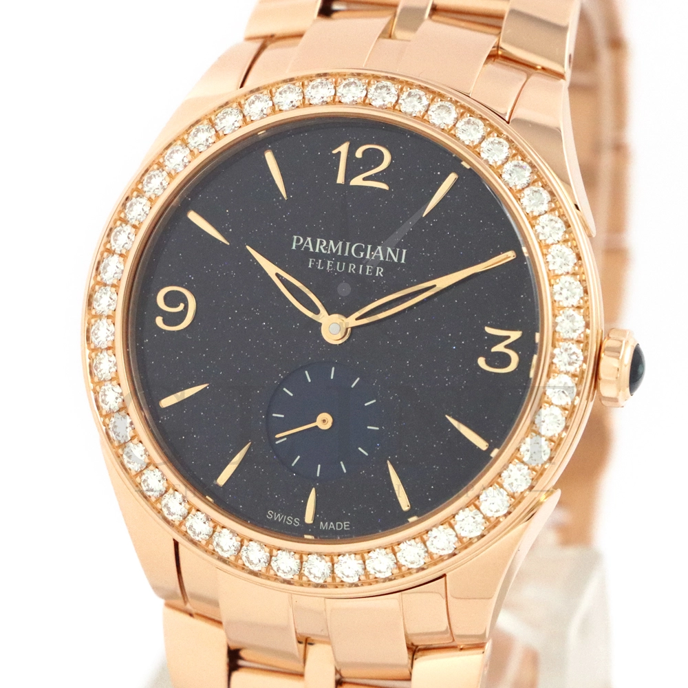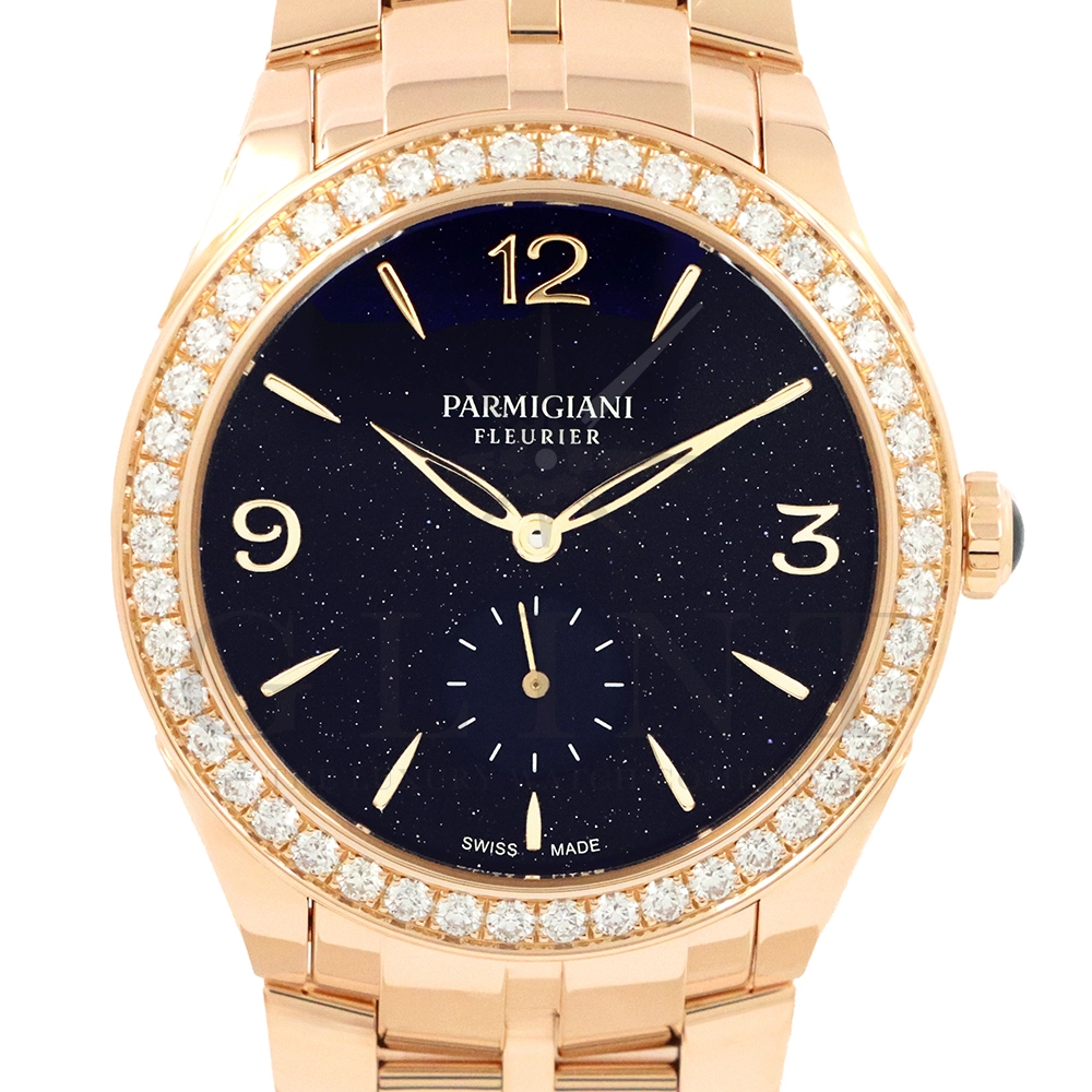 こちらはパルミジャーニ フルリエ トンダ メトロポリタンです。18Kローズゴールドの直径36mmのケースのベゼルには、46石のIFダイヤモンド(1.8 カラット)がセットされています。ダイヤモンドのクラリティスケールで “Internally Flawless” を意味するIFは、10倍ルーペで原石を見たときにインクルージョンがまったく確認されない高いクオリティ。ガラスに含有される銅のひとつひとつが星となって、アベンチュリンの澄み渡る夜空に輝きます。スケルトンの時針と分針は、セージの葉のフォルムを模していて、スモールセコンドは6時位置に配置。リューズを飾るのは、カボションカットのブルーサファイアです。ムーブメントにはゴールド製ローターが巻き上げる自社製自動巻きムーブメントPF310 を搭載。パルミジャーニフルリエの時計製造拠点での一貫製造体制で、その製造工程はいずれも、すべての製品のクオリティを高度なレベルに保てるように考案され、このキャリバーの精度と堅牢性には特に注意が払われており、それが高い信頼性をもたらしています。組み合わされるストラップはインディゴブルーのアリゲーターではなく、18Kローズゴールドブレスレットの特別仕様。より高級感を感じさせてくれる雰囲気となっております。