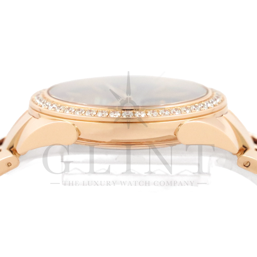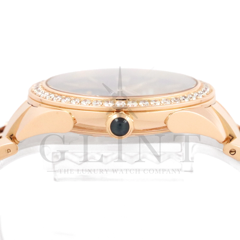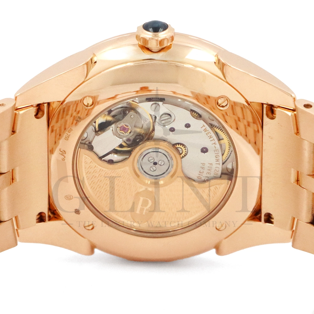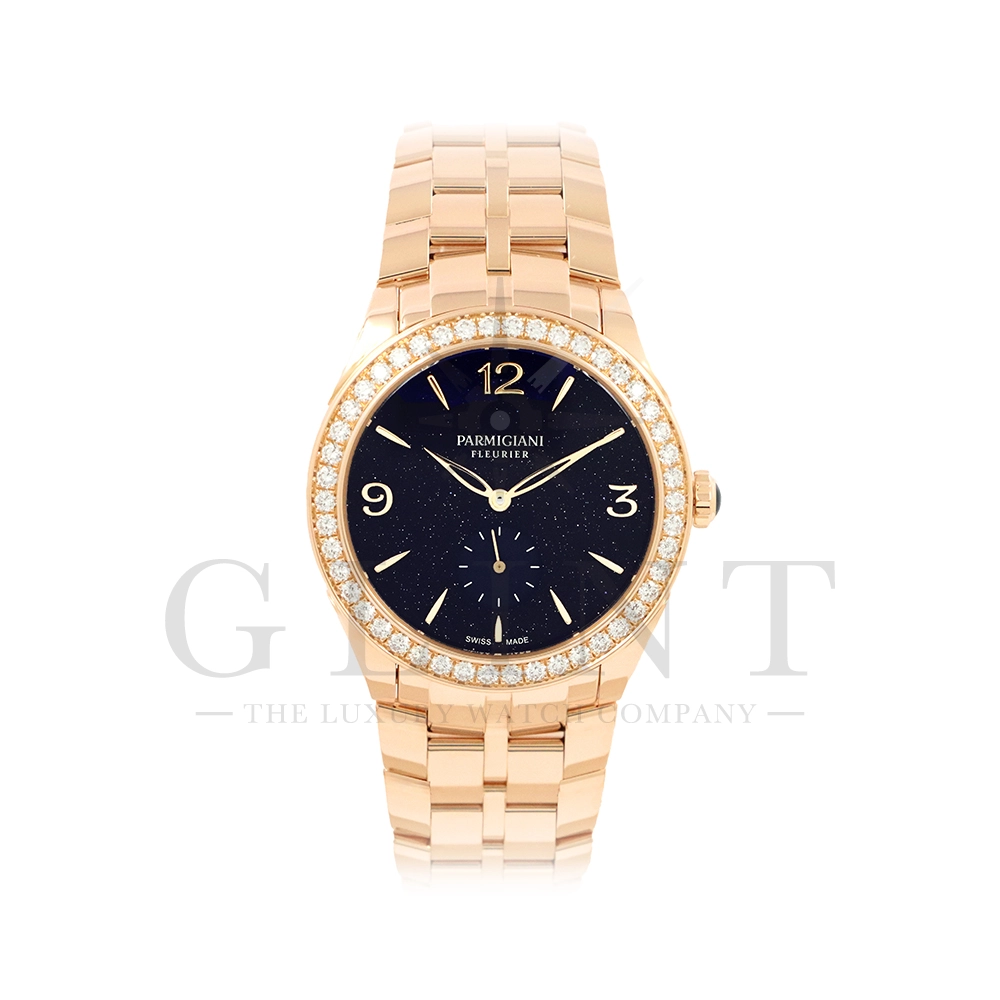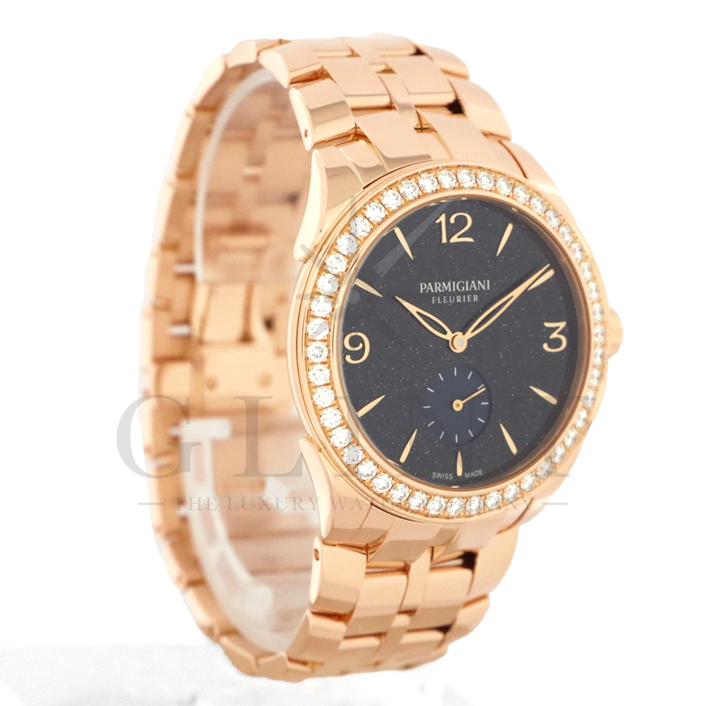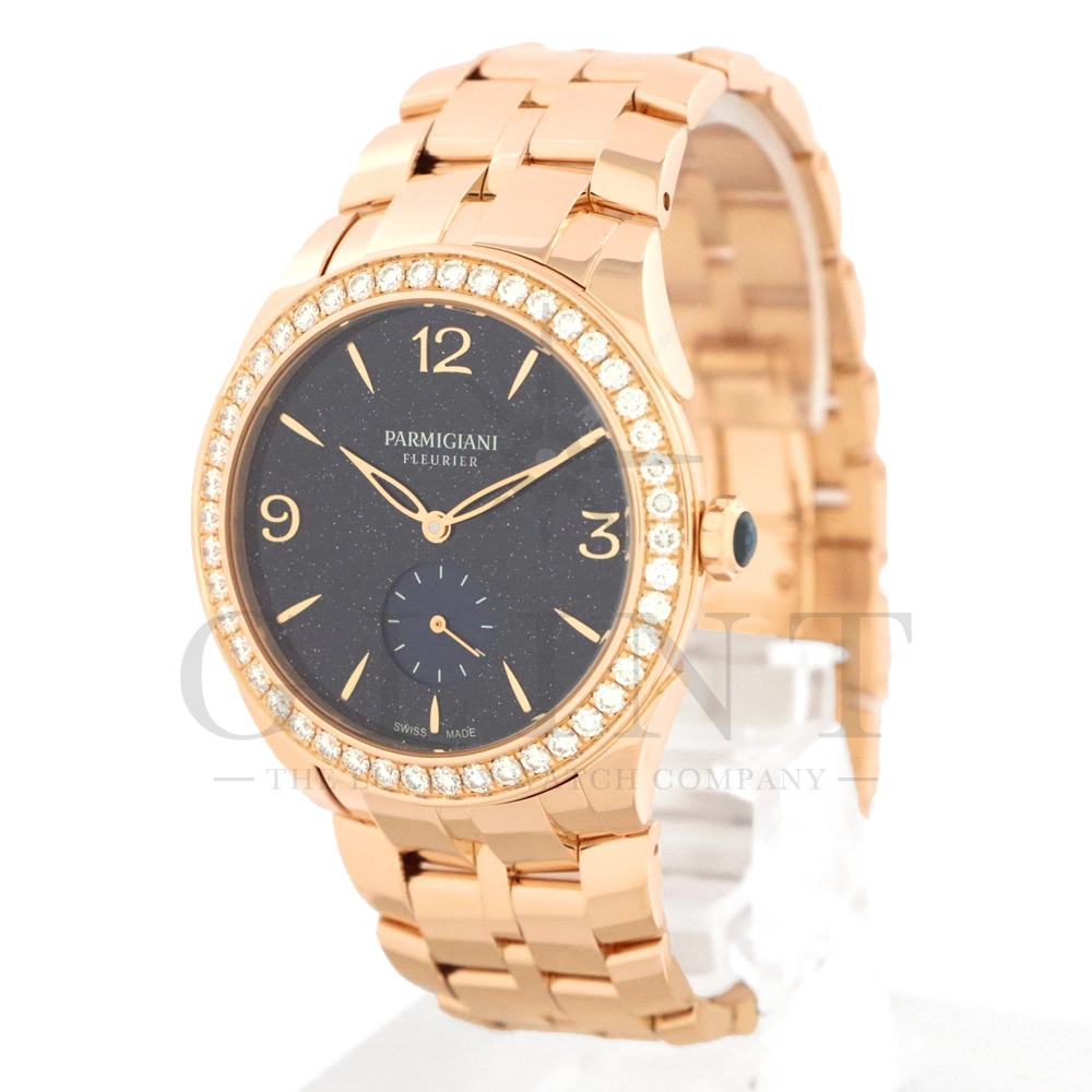 こちらはパルミジャーニ フルリエ トンダ メトロポリタンです。18Kローズゴールドの直径36mmのケースのベゼルには、46石のIFダイヤモンド(1.8 カラット)がセットされています。ダイヤモンドのクラリティスケールで “Internally Flawless” を意味するIFは、10倍ルーペで原石を見たときにインクルージョンがまったく確認されない高いクオリティ。ガラスに含有される銅のひとつひとつが星となって、アベンチュリンの澄み渡る夜空に輝きます。スケルトンの時針と分針は、セージの葉のフォルムを模していて、スモールセコンドは6時位置に配置。リューズを飾るのは、カボションカットのブルーサファイアです。ムーブメントにはゴールド製ローターが巻き上げる自社製自動巻きムーブメントPF310 を搭載。パルミジャーニフルリエの時計製造拠点での一貫製造体制で、その製造工程はいずれも、すべての製品のクオリティを高度なレベルに保てるように考案され、このキャリバーの精度と堅牢性には特に注意が払われており、それが高い信頼性をもたらしています。組み合わされるストラップはインディゴブルーのアリゲーターではなく、18Kローズゴールドブレスレットの特別仕様。より高級感を感じさせてくれる雰囲気となっております。