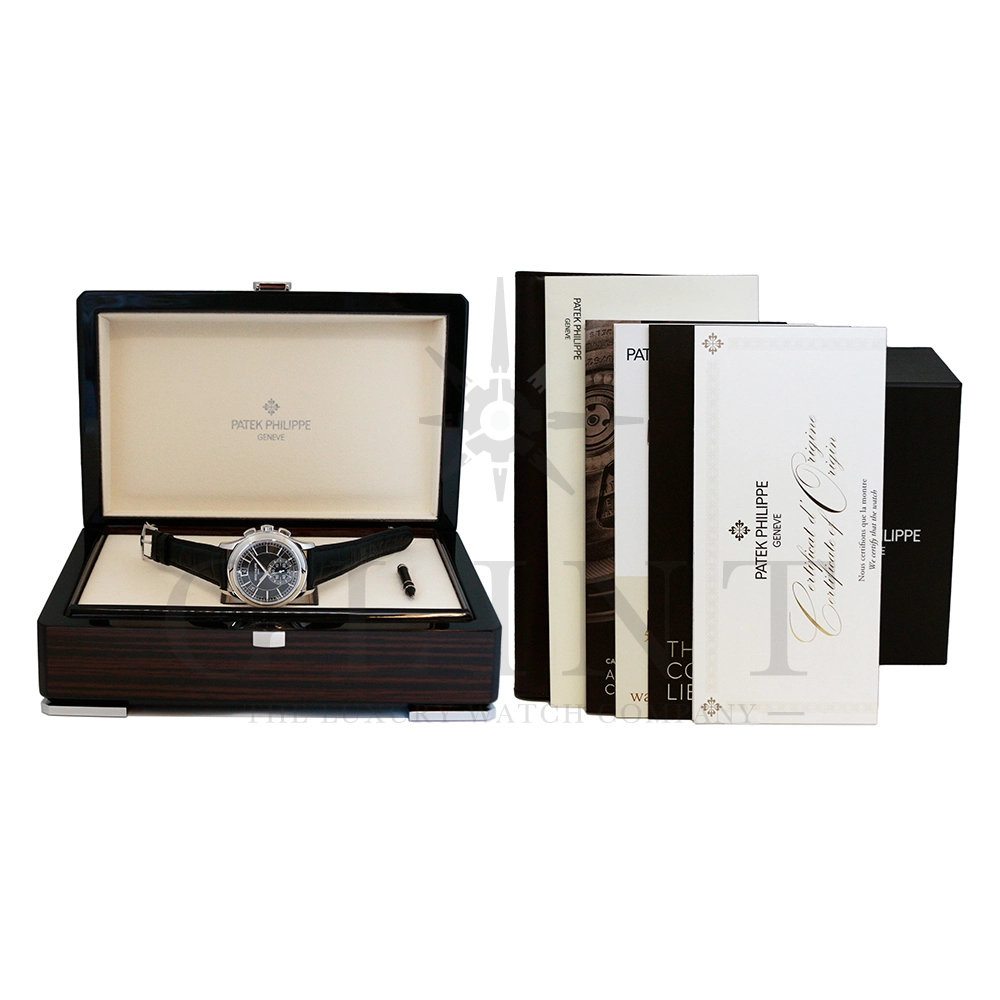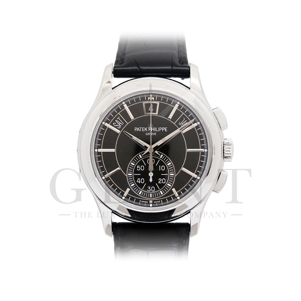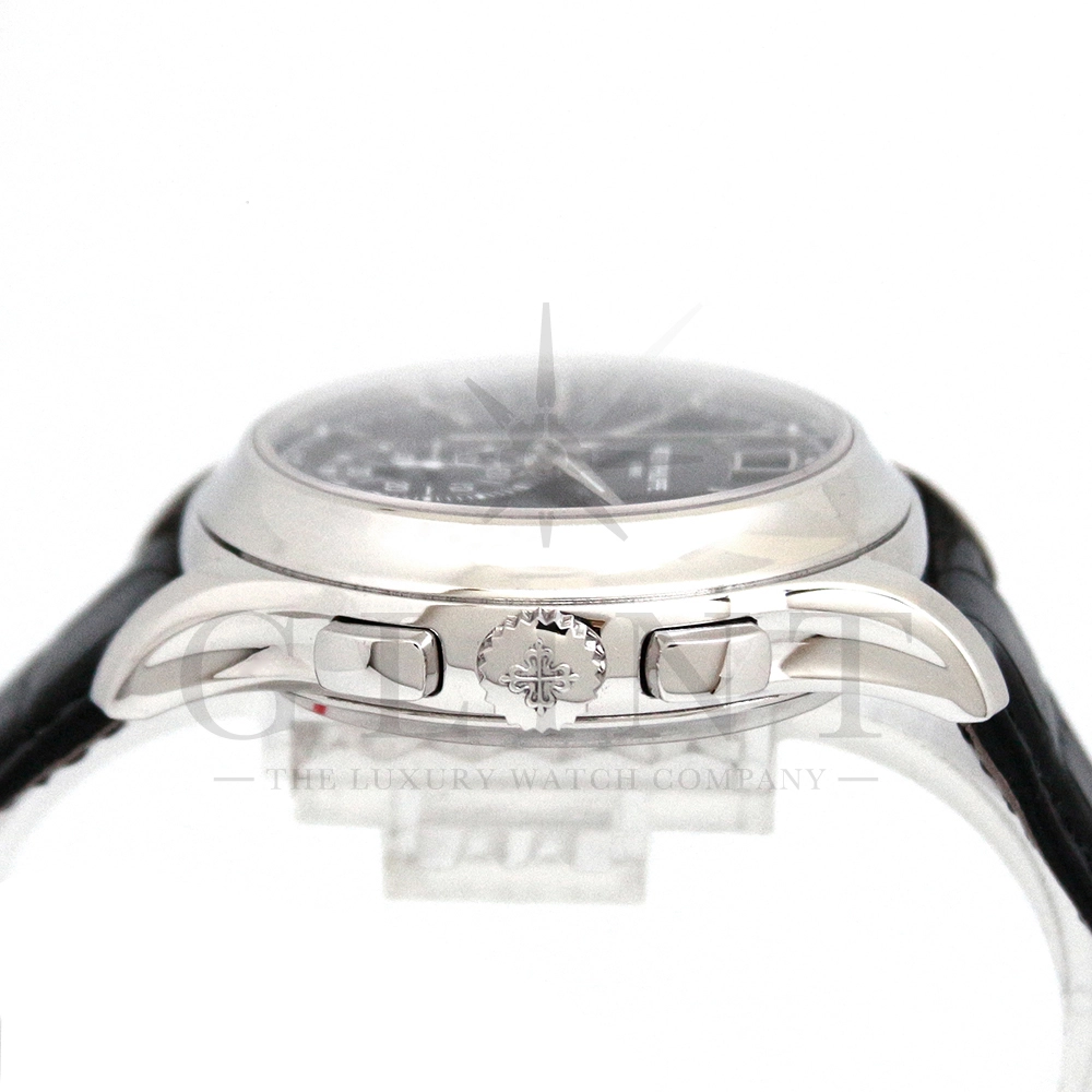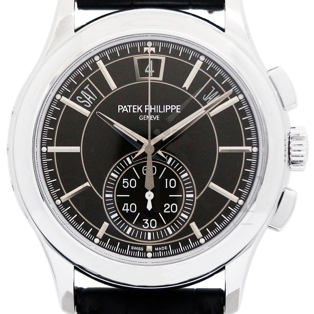 パテックフィリップ コンプリケーション アニュアルカレンダー クロノグラフ 5905P-010です。ケース素材にはプラチナを使用。搭載されている年次カレンダー(アニュアルカレンダー)はパテックフィリップが約4年もの月日を費やし、1996年に特許を取得した複雑機構。1年に1回(2月以外)調整するだけで、毎日の日付、曜日、月名を自動表示してくれます。シースルーバックからはそのムーブメントの動きを心ゆくまでお楽しみにになれるでしょう。全体的にブラックカラーで統一されたシックな雰囲気の中に洗練された高級感を与えてくれる仕上がりとなっております。世界最高の高級時計ブランドの技術が結集された逸品を是非この機会にご堪能下さい。