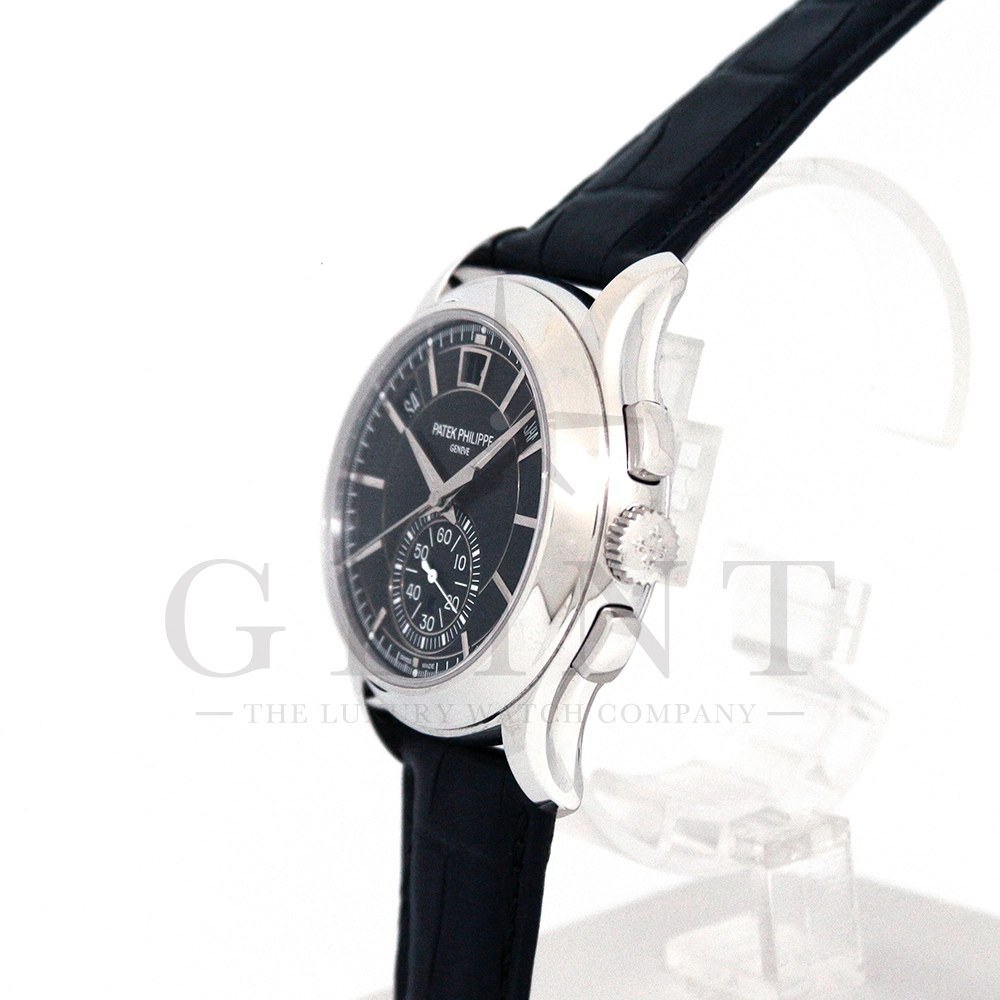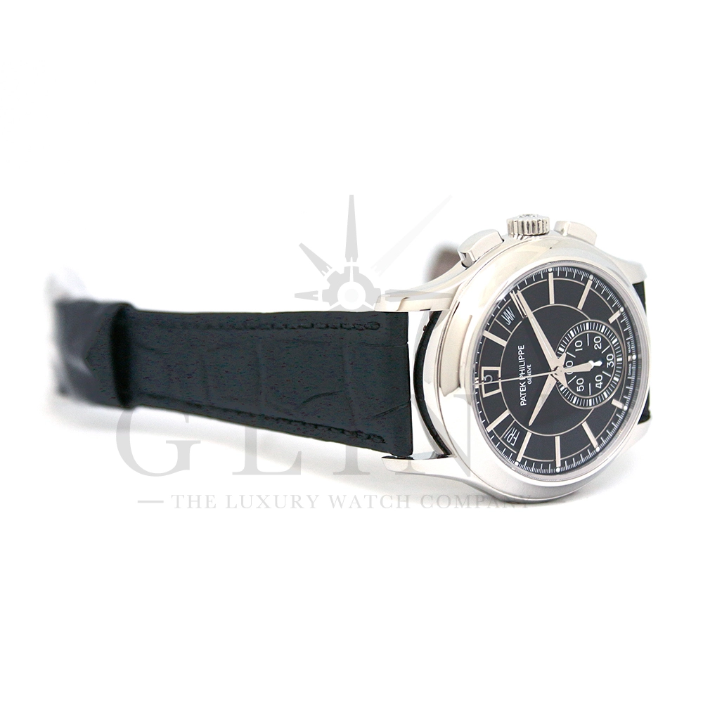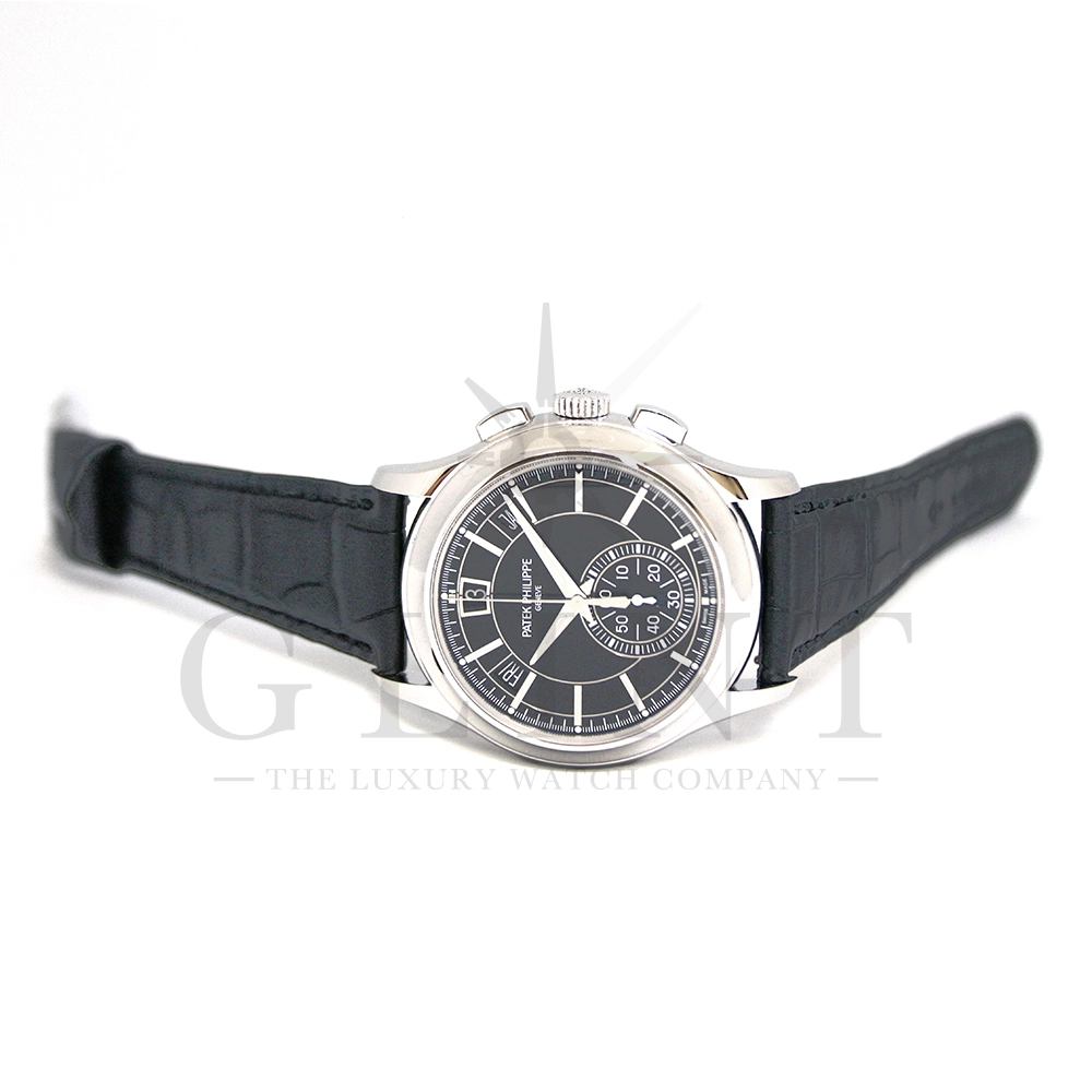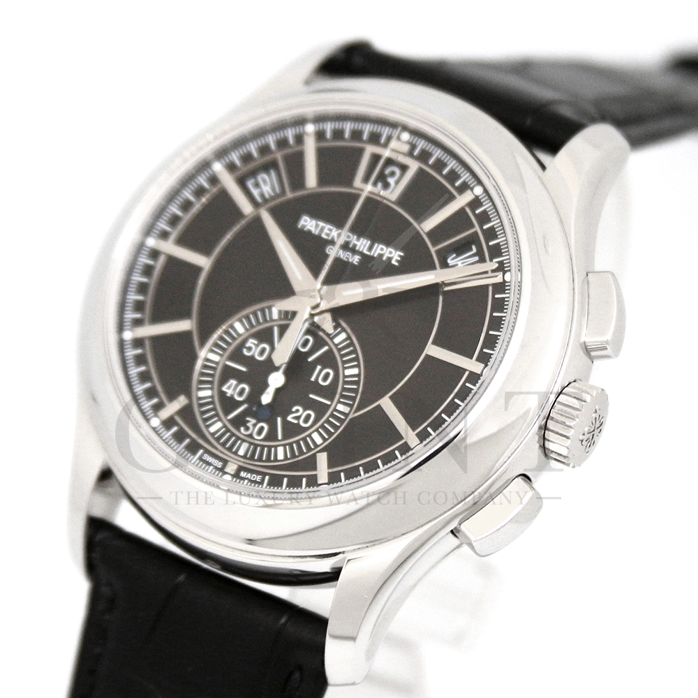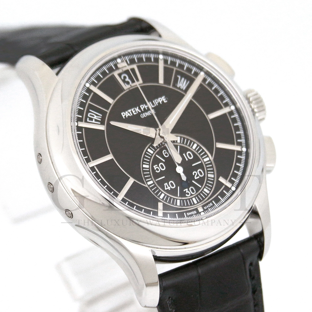 パテックフィリップ コンプリケーション アニュアルカレンダー クロノグラフ 5905P-010です。ケース素材にはプラチナを使用。搭載されている年次カレンダー(アニュアルカレンダー)はパテックフィリップが約4年もの月日を費やし、1996年に特許を取得した複雑機構。1年に1回(2月以外)調整するだけで、毎日の日付、曜日、月名を自動表示してくれます。シースルーバックからはそのムーブメントの動きを心ゆくまでお楽しみにになれるでしょう。全体的にブラックカラーで統一されたシックな雰囲気の中に洗練された高級感を与えてくれる仕上がりとなっております。世界最高の高級時計ブランドの技術が結集された逸品を是非この機会にご堪能下さい。