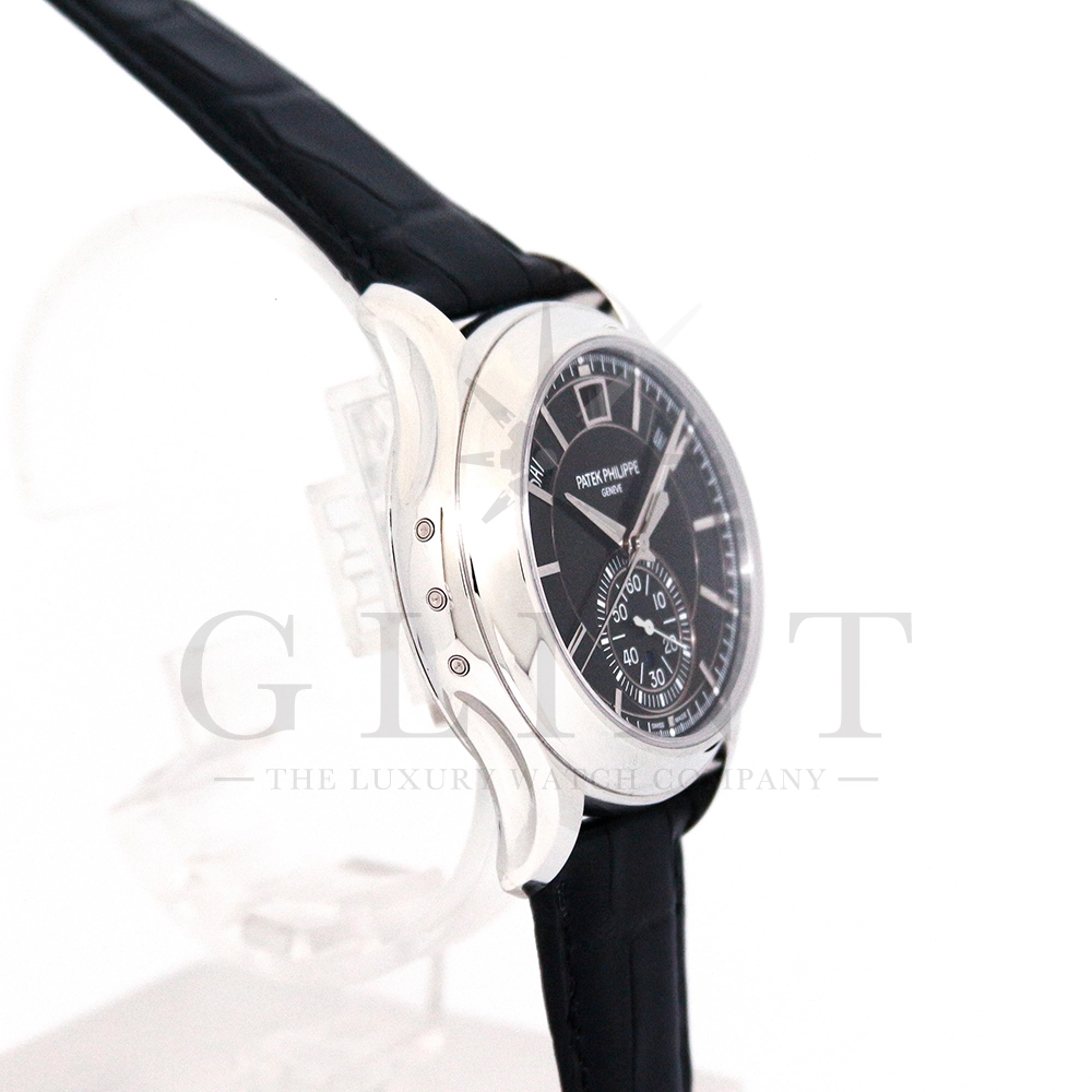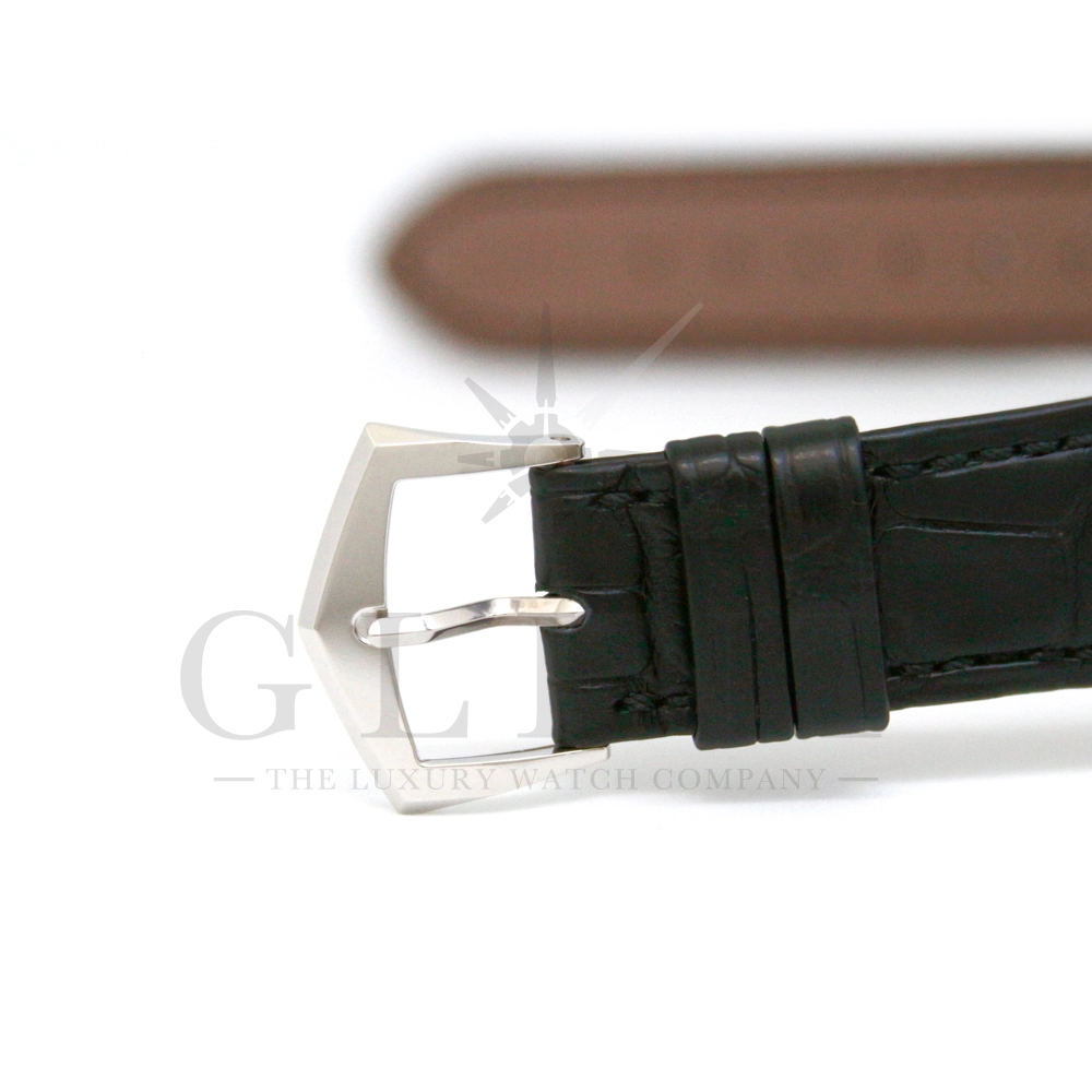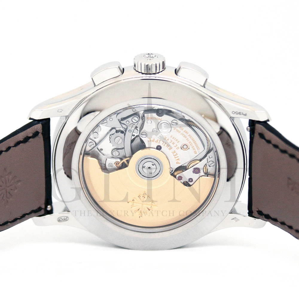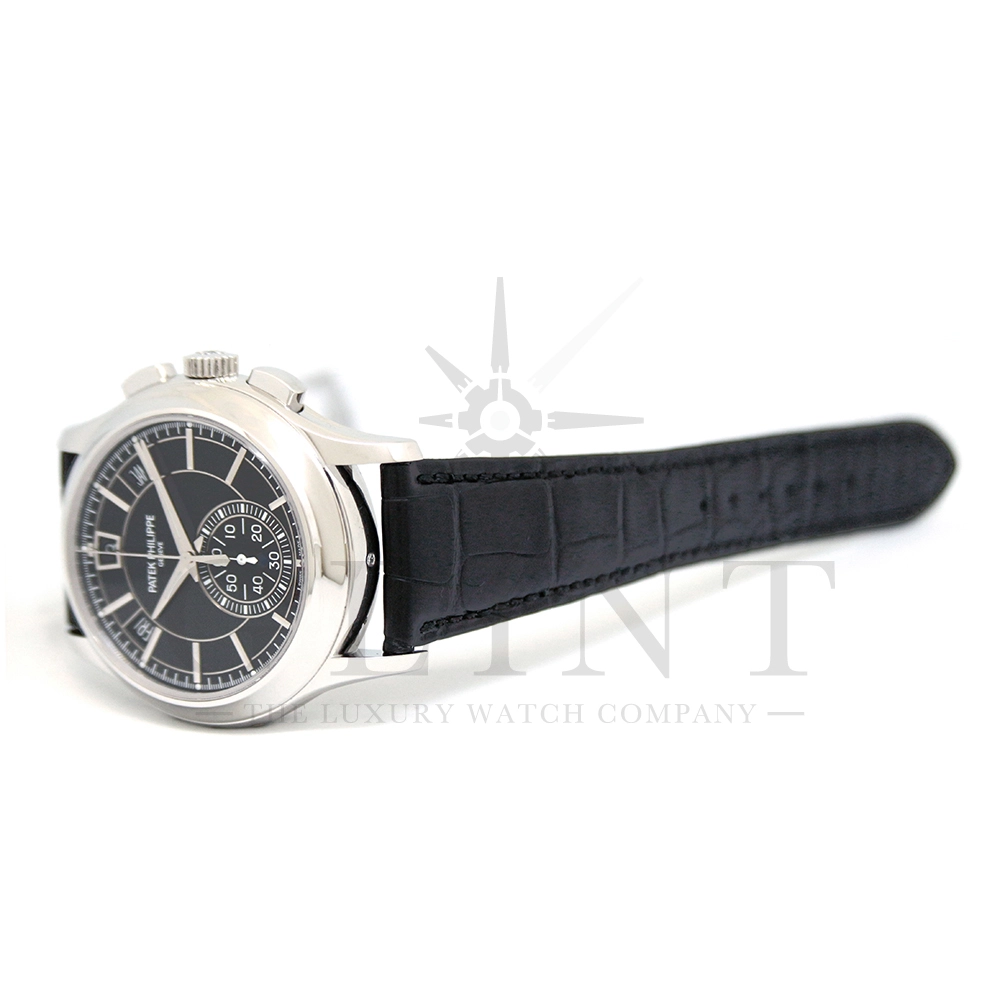 パテックフィリップ コンプリケーション アニュアルカレンダー クロノグラフ 5905P-010です。ケース素材にはプラチナを使用。搭載されている年次カレンダー(アニュアルカレンダー)はパテックフィリップが約4年もの月日を費やし、1996年に特許を取得した複雑機構。1年に1回(2月以外)調整するだけで、毎日の日付、曜日、月名を自動表示してくれます。シースルーバックからはそのムーブメントの動きを心ゆくまでお楽しみにになれるでしょう。全体的にブラックカラーで統一されたシックな雰囲気の中に洗練された高級感を与えてくれる仕上がりとなっております。世界最高の高級時計ブランドの技術が結集された逸品を是非この機会にご堪能下さい。
