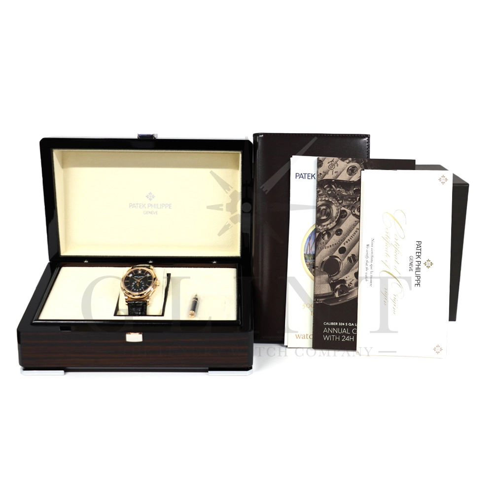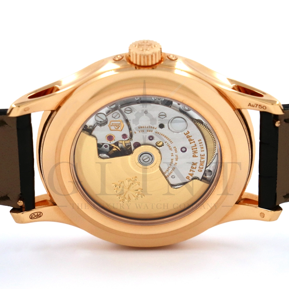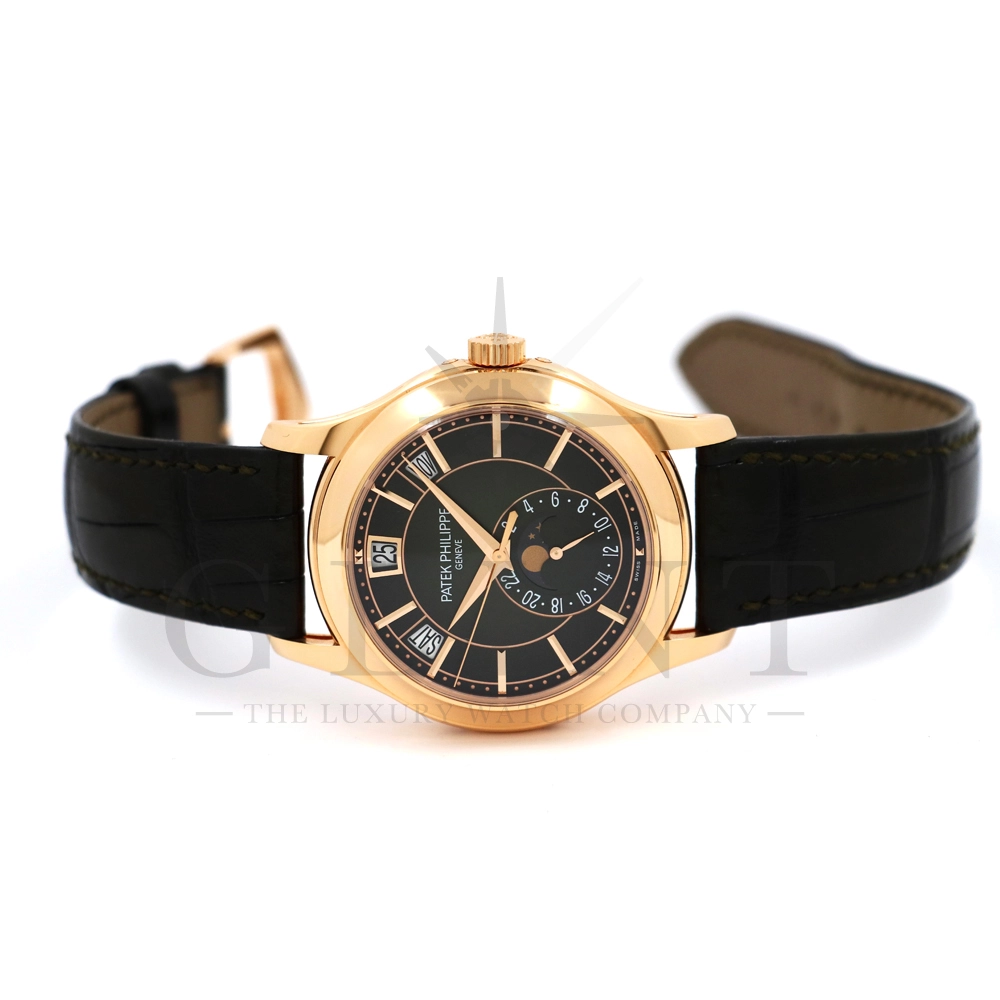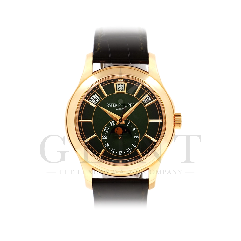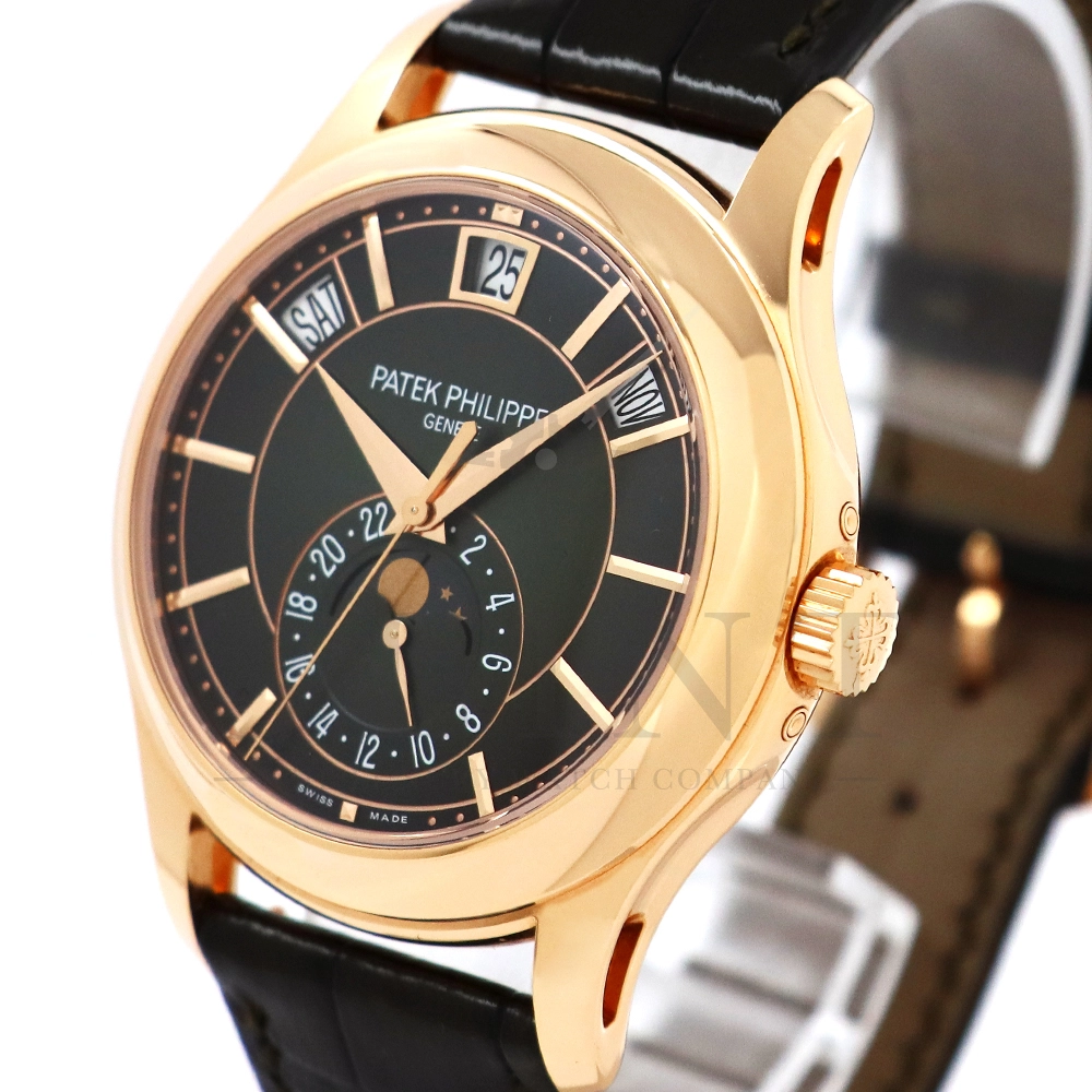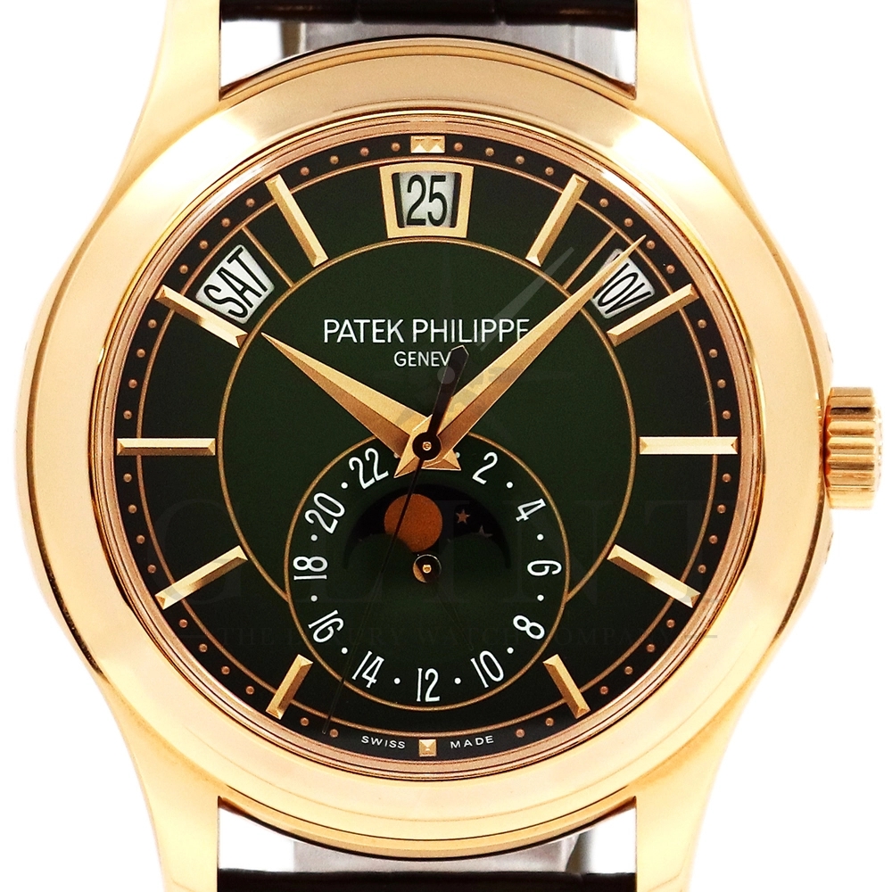 こちらは2022年に発表されたパテックフィリップ アニュアルカレンダー 5205R-011です。5205Rはパテックフィリップが世に送り出してきた従来の年次カレンダーモデルとは一線を画すスケルトン加工を施したラグが特徴的で月、日、曜日を文字盤上部に配置したデザインはRef.5960を踏襲したもの。そしてこちらのオリーブグリーンの文字盤には、ソレイユ仕上げと外周に向かって濃くなるブラック・グラデーションとなっており、時計に華やかさを添えています。世界最高の高級時計ブランドの技術が結集された逸品を是非ご堪能ください。