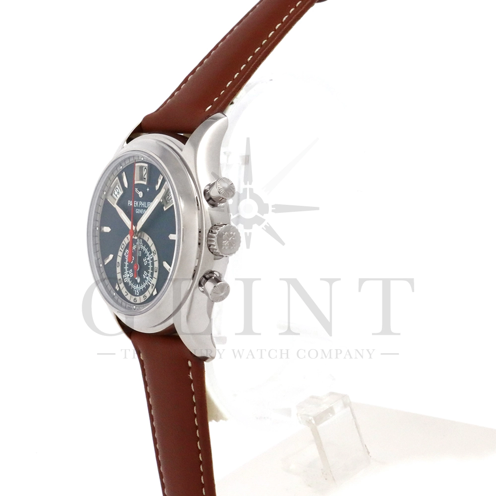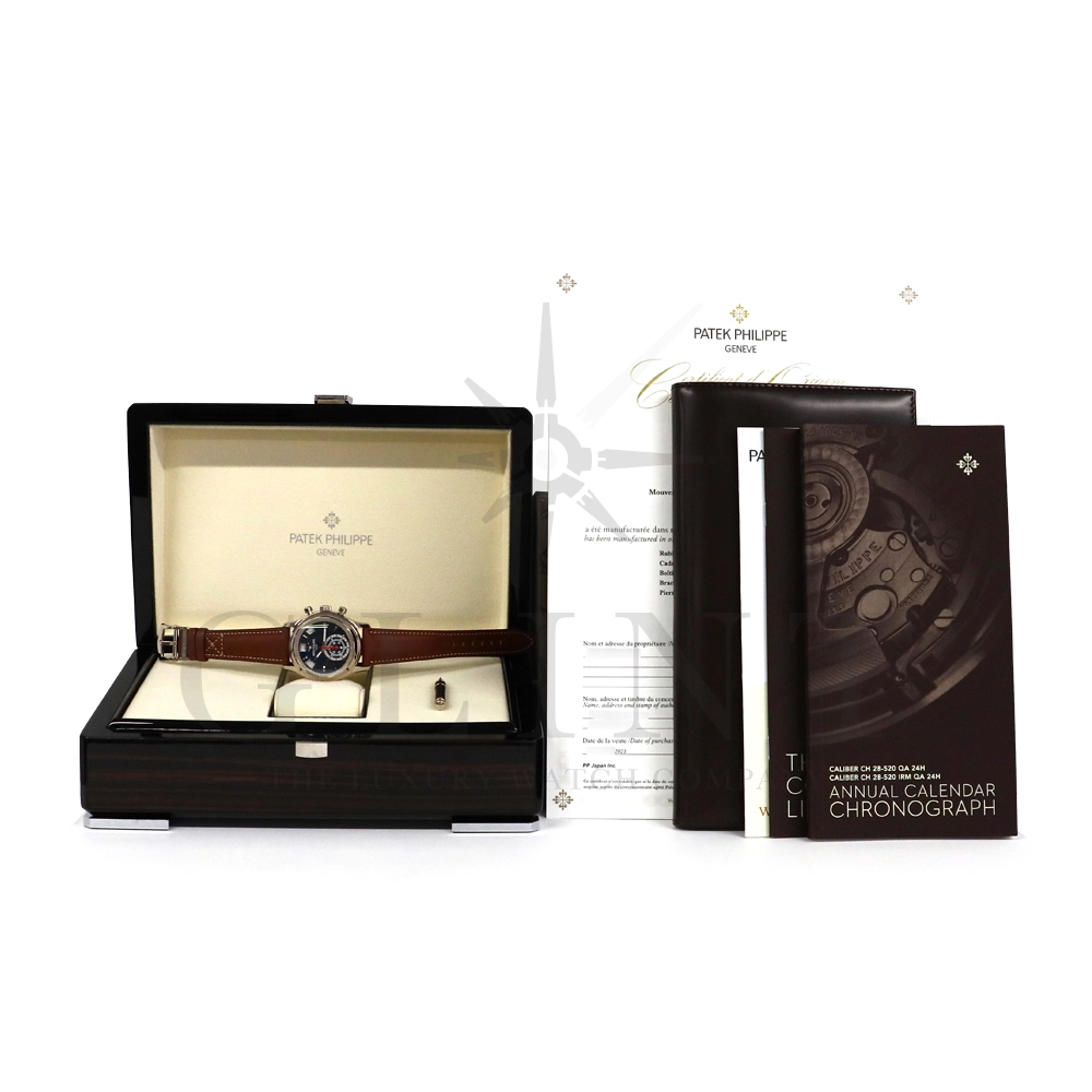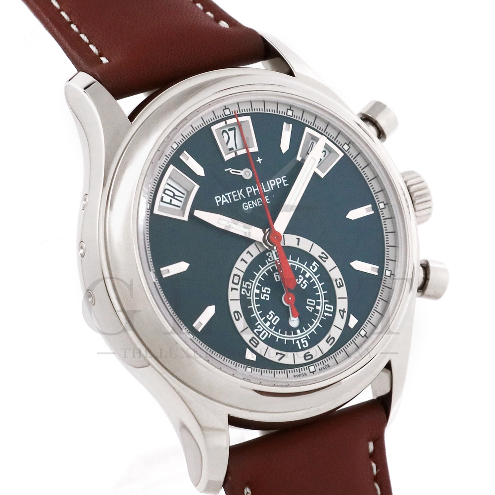 こちらはパテックフィリップ コンプリケーション アニュアルカレンダー フライバッククロノグラフ 5960/01G-001です。ケース素材には18Kホワイトゴールドを使用。搭載されている年次カレンダー(アニュアルカレンダー)はパテックフィリップが約4年もの月日を費やし、1996年に特許を取得した複雑機構。1年に1回(2月以外)調整するだけで、毎日の日付、曜日、月名を自動表示してくれます。6時位置には30分間と12時間の積算計が一体型となったサブダイヤルを備え、針の下にはデイ&ナイト表示を配置。12時位置にはパワーリザーブ表示も備えており、実用性抜群で、絶妙にシェイプされた貫禄のある美しいケースデザインも魅力です。世界最高の高級時計ブランドの技術が結集された逸品を是非この機会にご堪能下さい。