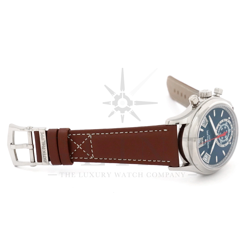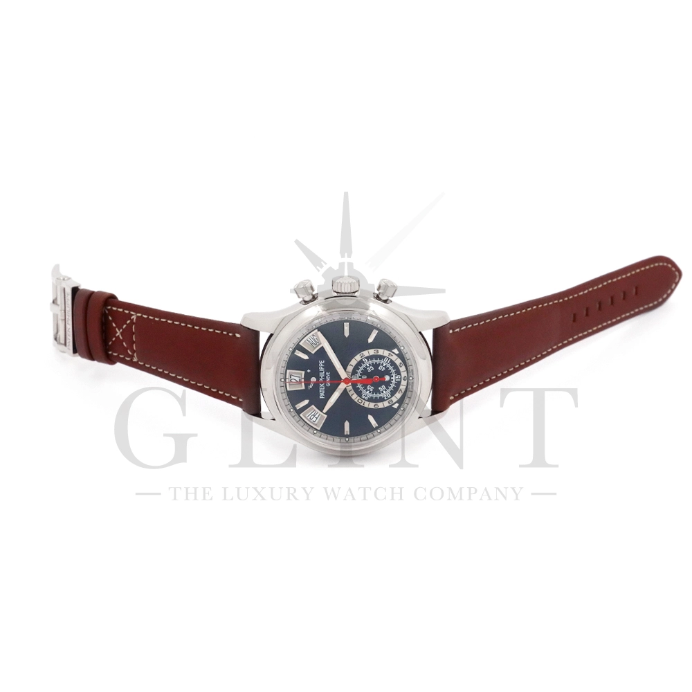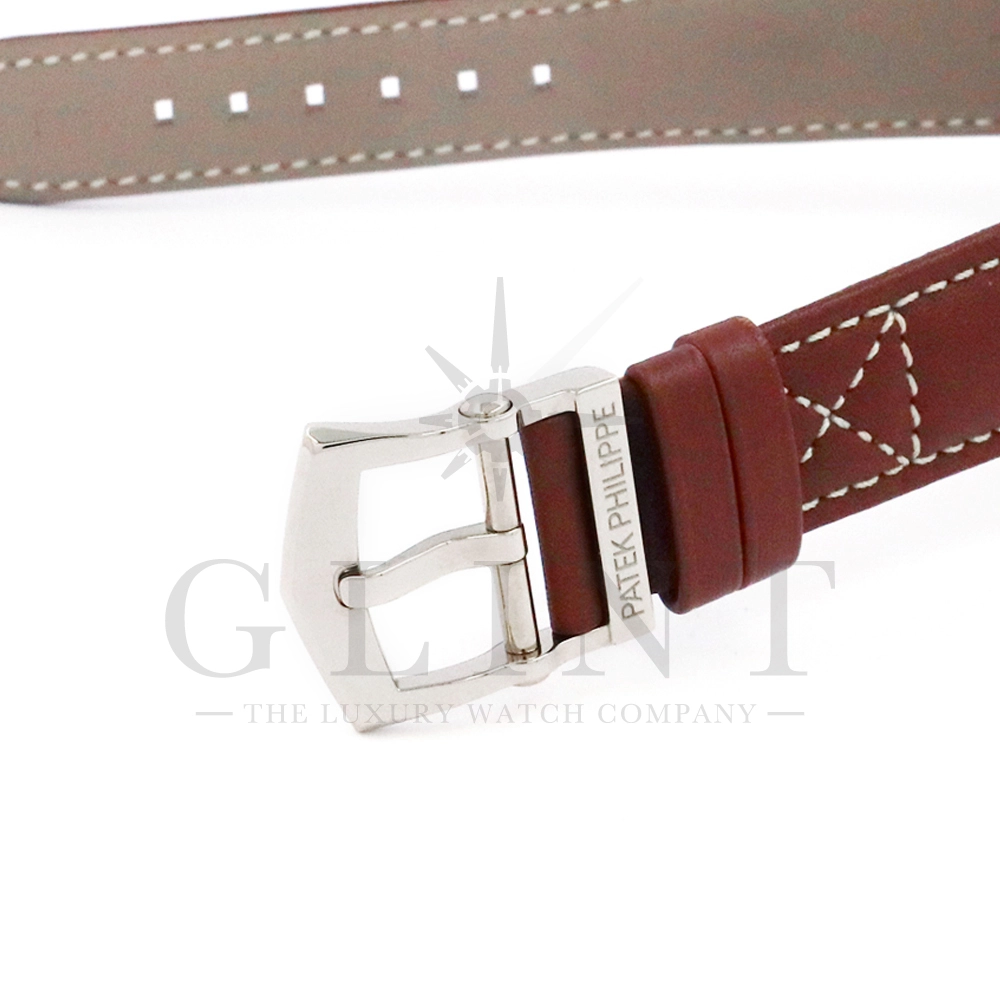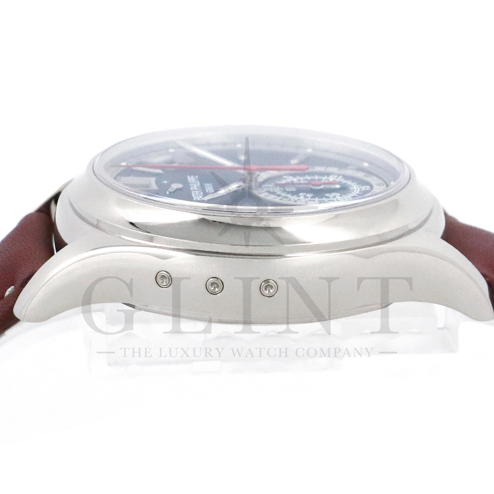 こちらはパテックフィリップ コンプリケーション アニュアルカレンダー フライバッククロノグラフ 5960/01G-001です。ケース素材には18Kホワイトゴールドを使用。搭載されている年次カレンダー(アニュアルカレンダー)はパテックフィリップが約4年もの月日を費やし、1996年に特許を取得した複雑機構。1年に1回(2月以外)調整するだけで、毎日の日付、曜日、月名を自動表示してくれます。6時位置には30分間と12時間の積算計が一体型となったサブダイヤルを備え、針の下にはデイ&ナイト表示を配置。12時位置にはパワーリザーブ表示も備えており、実用性抜群で、絶妙にシェイプされた貫禄のある美しいケースデザインも魅力です。世界最高の高級時計ブランドの技術が結集された逸品を是非この機会にご堪能下さい。