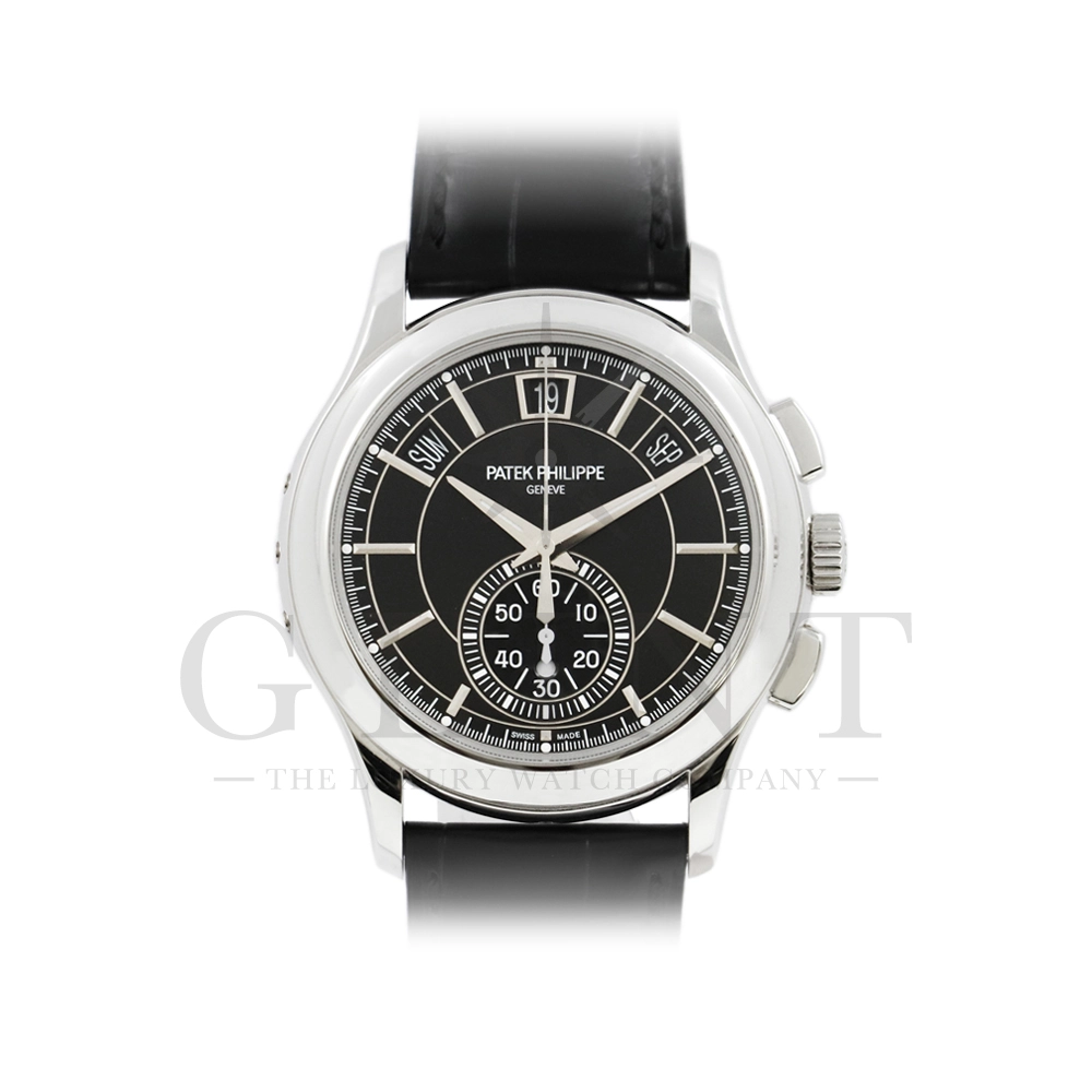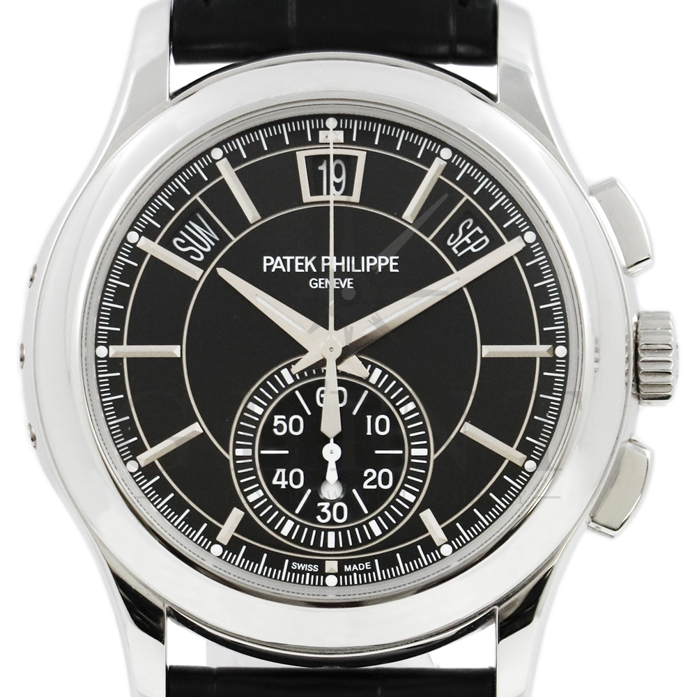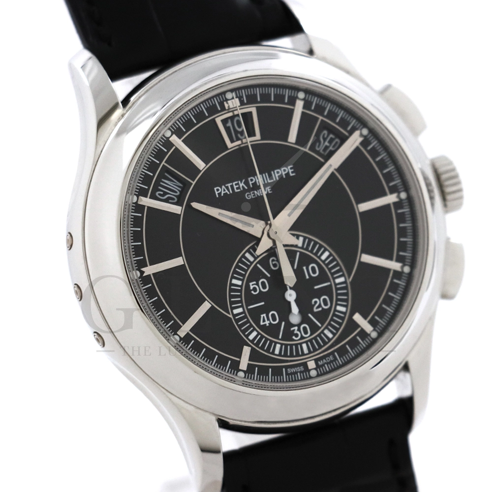 パテックフィリップ コンプリケーション アニュアルカレンダー クロノグラフ 5905P-010です。ケース素材にはプラチナを使用。搭載されている年次カレンダー(アニュアルカレンダー)はパテックフィリップが約4年もの月日を費やし、1996年に特許を取得した複雑機構。1年に1回(2月以外)調整するだけで、毎日の日付、曜日、月名を自動表示してくれます。シースルーバックからはそのムーブメントの動きを心ゆくまでお楽しみになれるでしょう。全体的にブラックカラーで統一されたシックな雰囲気の中に洗練された高級感を与えてくれる仕上がりとなっております。世界最高の高級時計ブランドの技術が結集された逸品を是非この機会にご堪能下さい。
