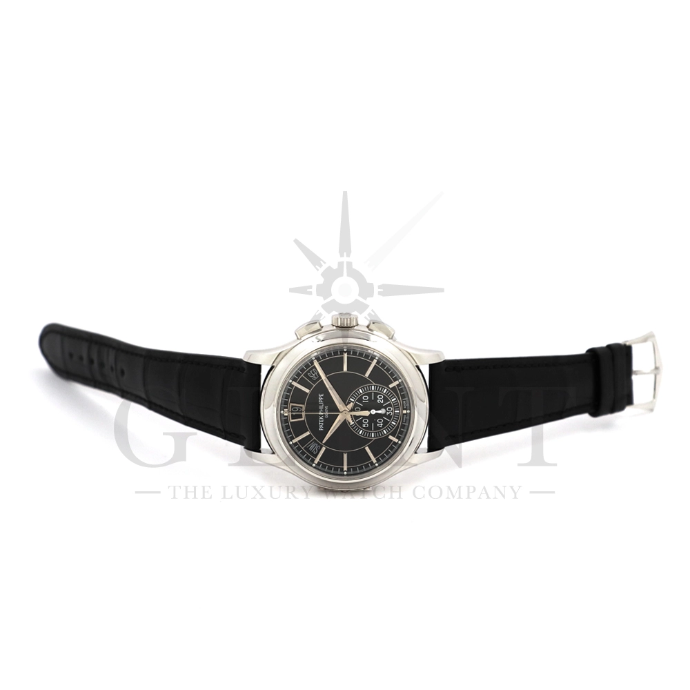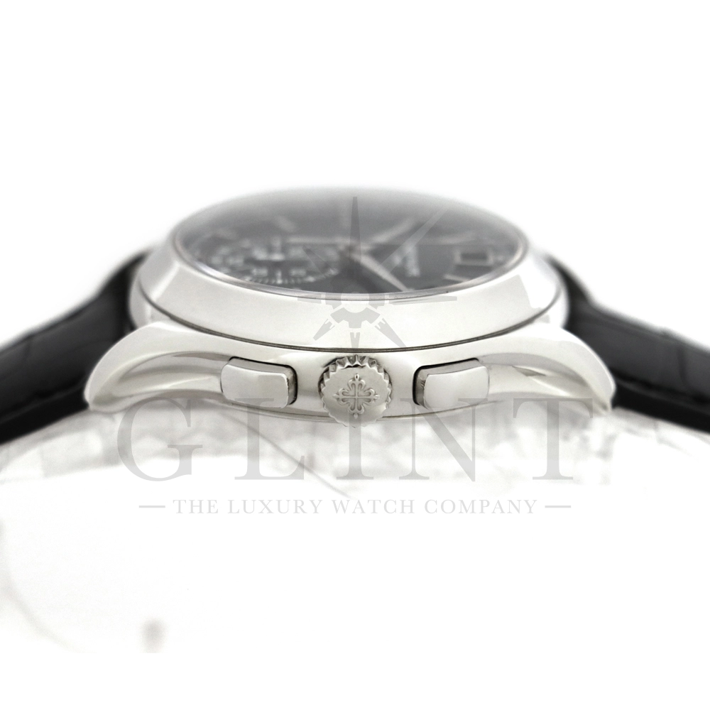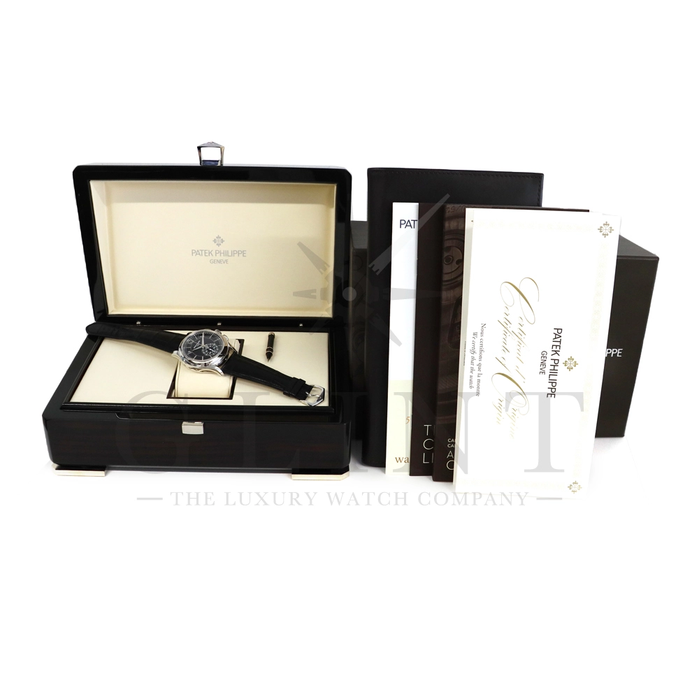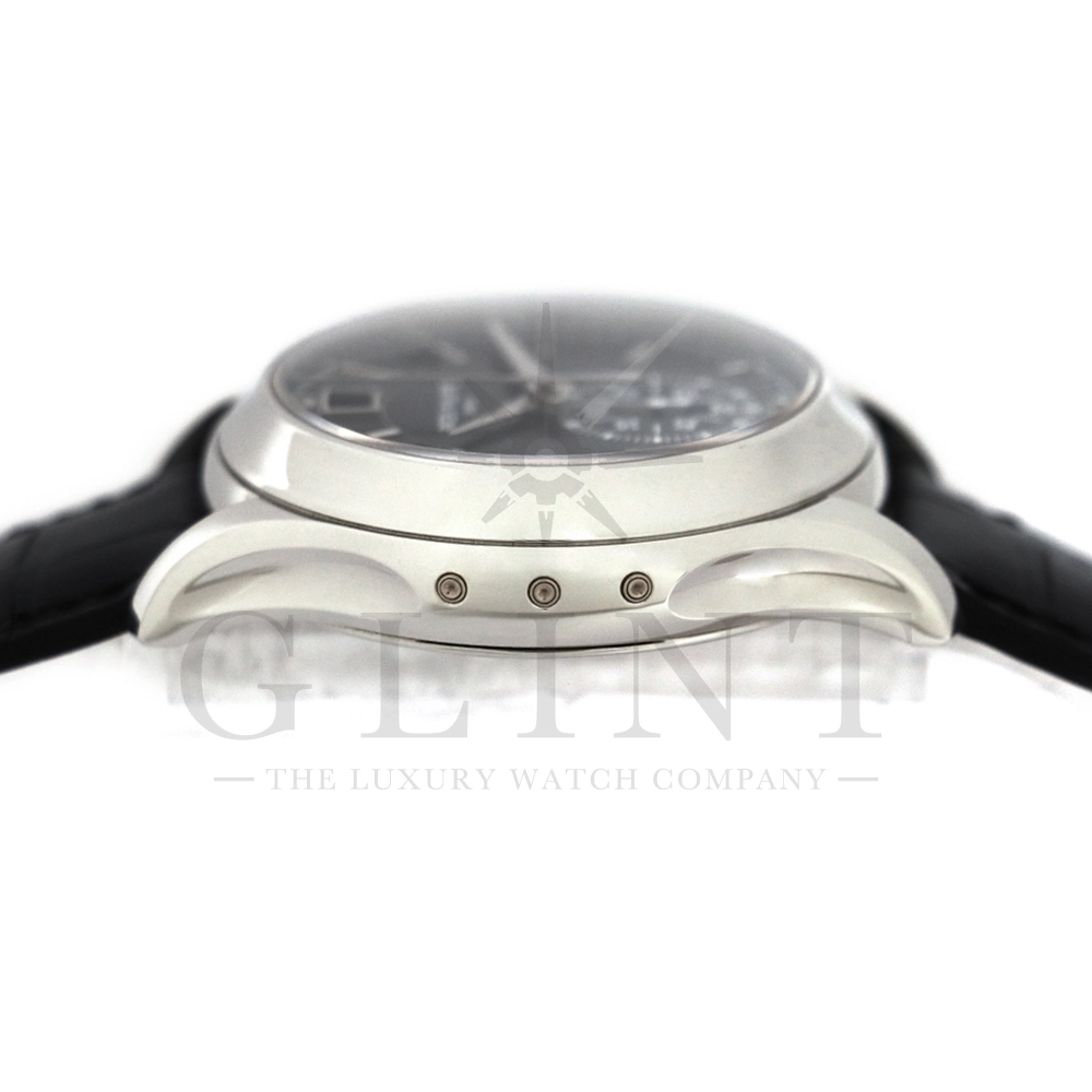 パテックフィリップ コンプリケーション アニュアルカレンダー クロノグラフ 5905P-010です。ケース素材にはプラチナを使用。搭載されている年次カレンダー(アニュアルカレンダー)はパテックフィリップが約4年もの月日を費やし、1996年に特許を取得した複雑機構。1年に1回(2月以外)調整するだけで、毎日の日付、曜日、月名を自動表示してくれます。シースルーバックからはそのムーブメントの動きを心ゆくまでお楽しみになれるでしょう。全体的にブラックカラーで統一されたシックな雰囲気の中に洗練された高級感を与えてくれる仕上がりとなっております。世界最高の高級時計ブランドの技術が結集された逸品を是非この機会にご堪能下さい。