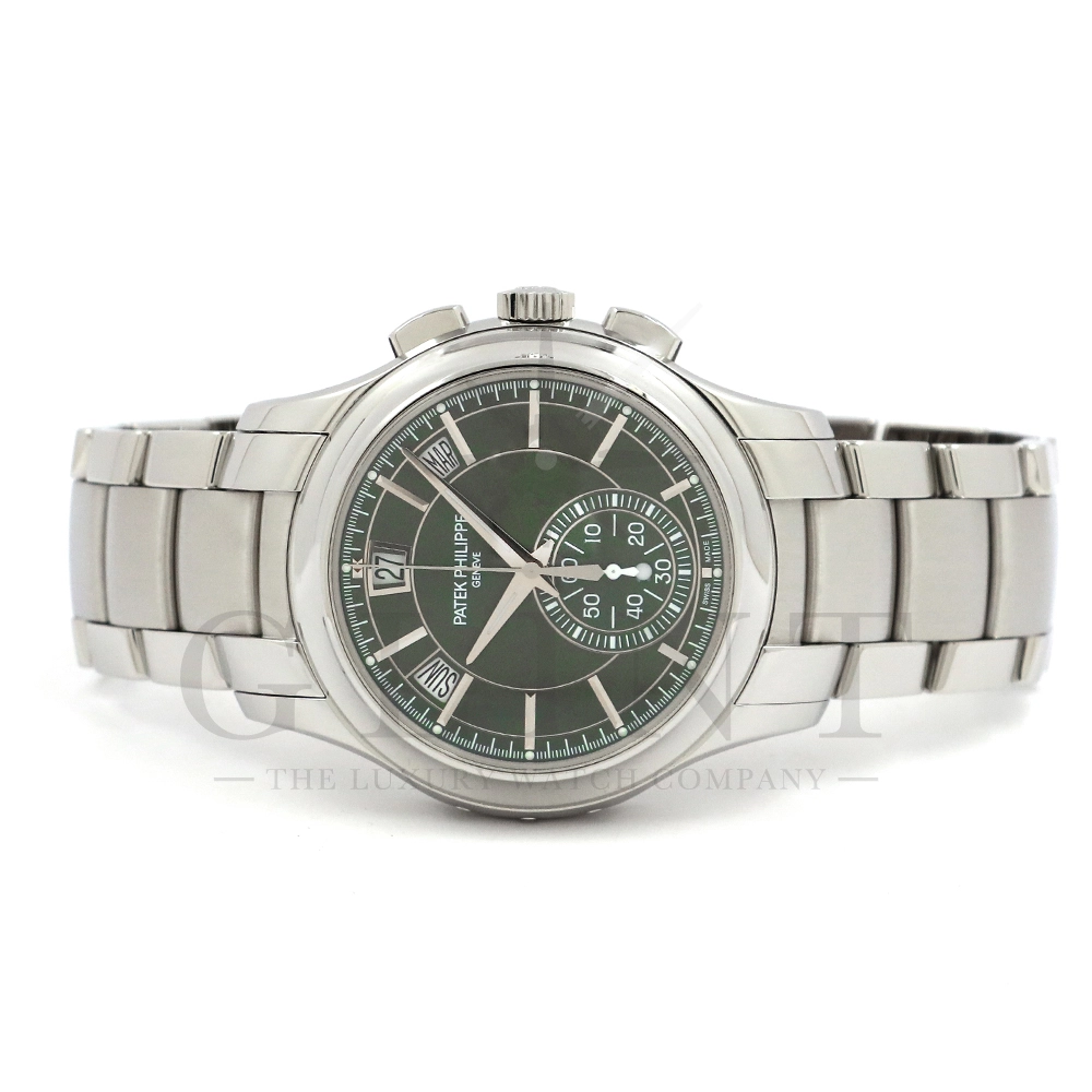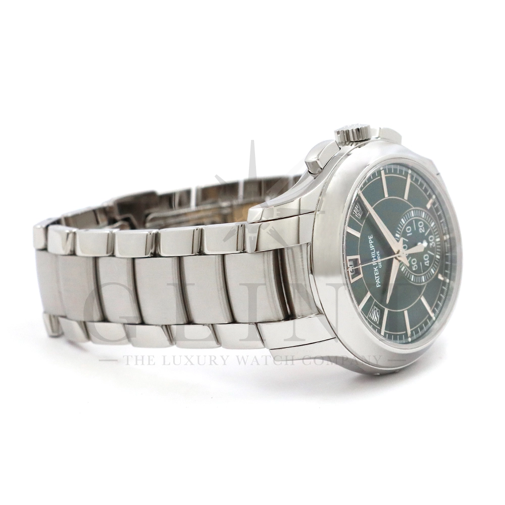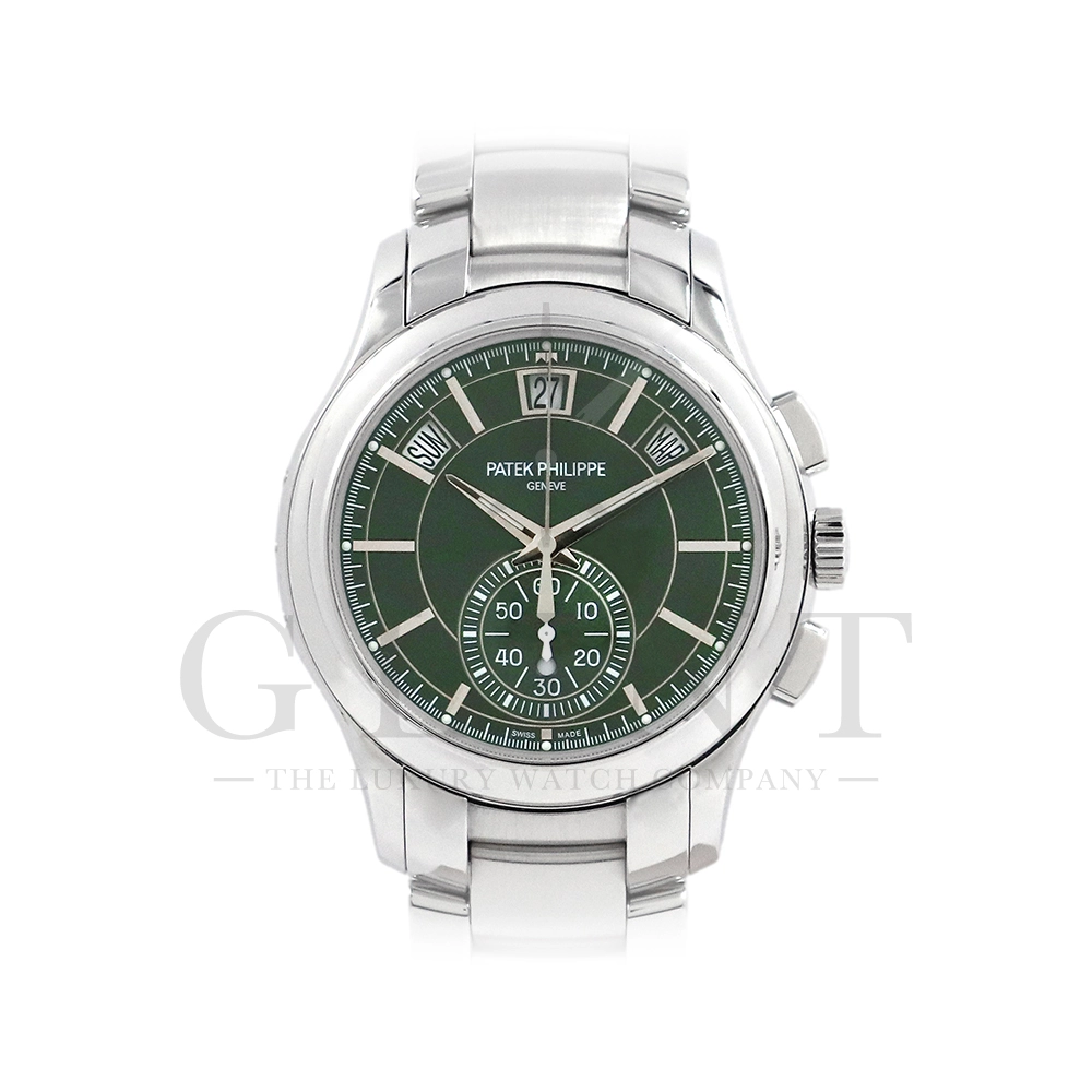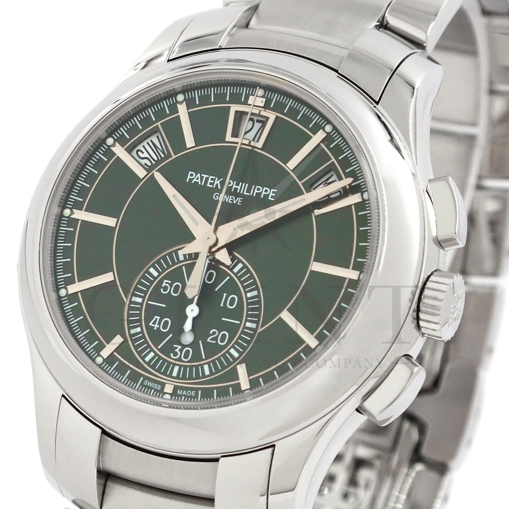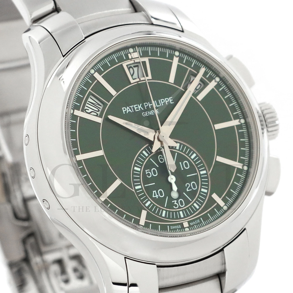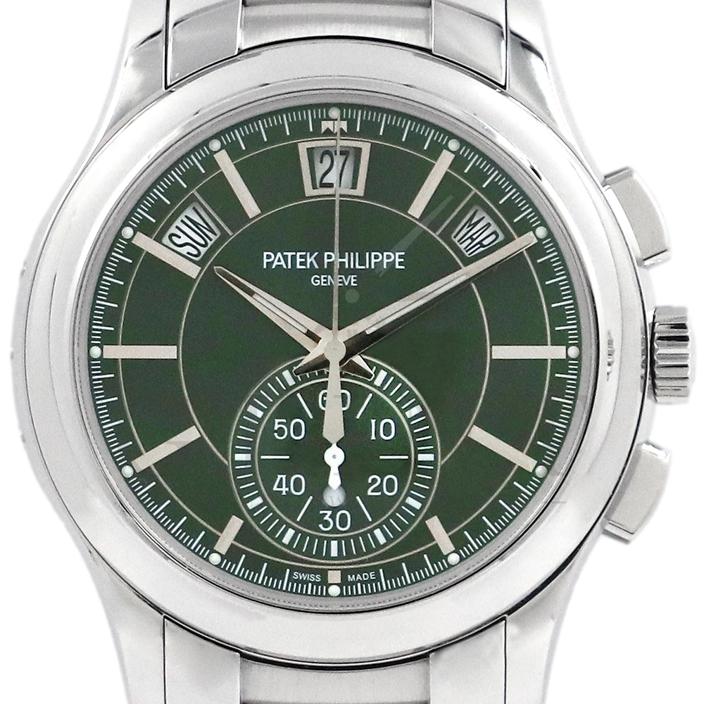 パテックフィリップ コンプリケーション アニュアルカレンダー フライバック・クロノグラフ 5905/1A-001です。ケース素材には同シリーズ初のステンレスを使用。搭載されている年次カレンダー(アニュアルカレンダー)はパテックフィリップが約4年もの月日を費やし、1996年に特許を取得した複雑機構。1年に1回(2月以外)調整するだけで、毎日の日付、曜日、月名を自動表示してくれます。シースルーバックからはそのムーブメントの動きを心ゆくまでお楽しみにになれるでしょう。深みのあるグリーンの文字盤により、ステンレスながらも洗練された高級感を与えてくれる仕上がりとなっております。世界最高の高級時計ブランドの技術が結集された逸品を是非この機会にご堪能下さい。