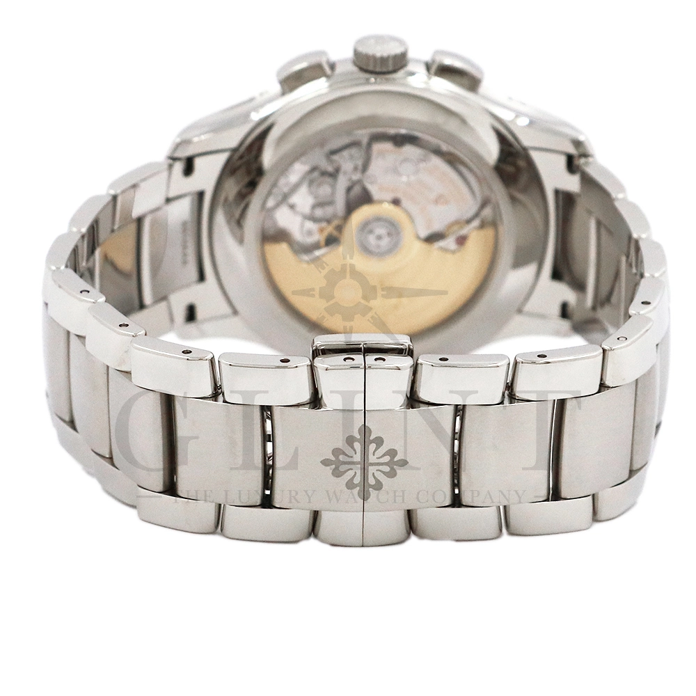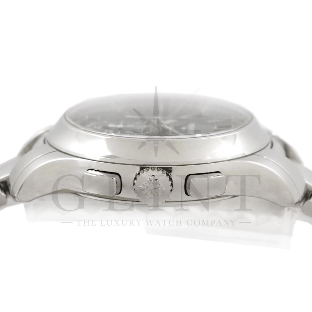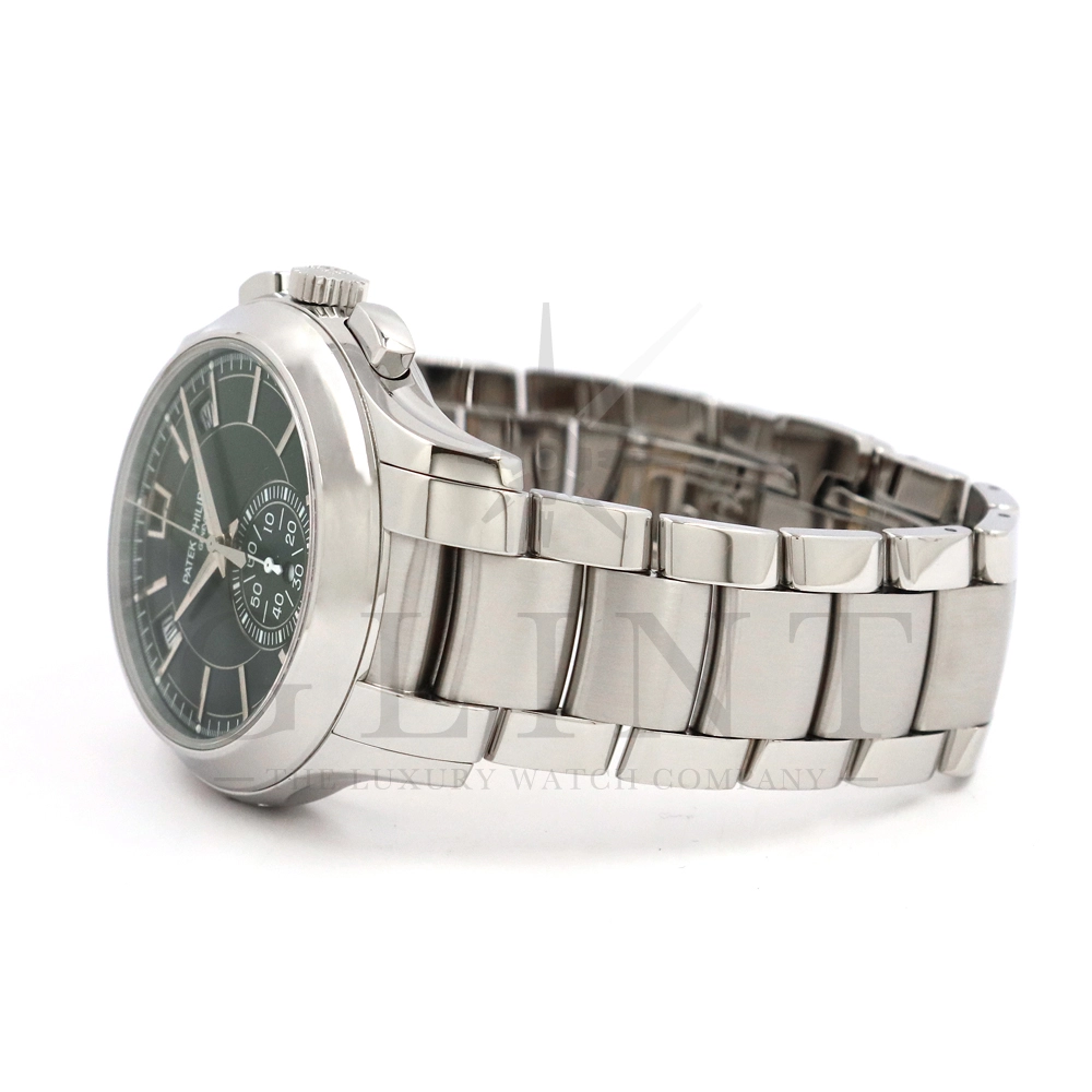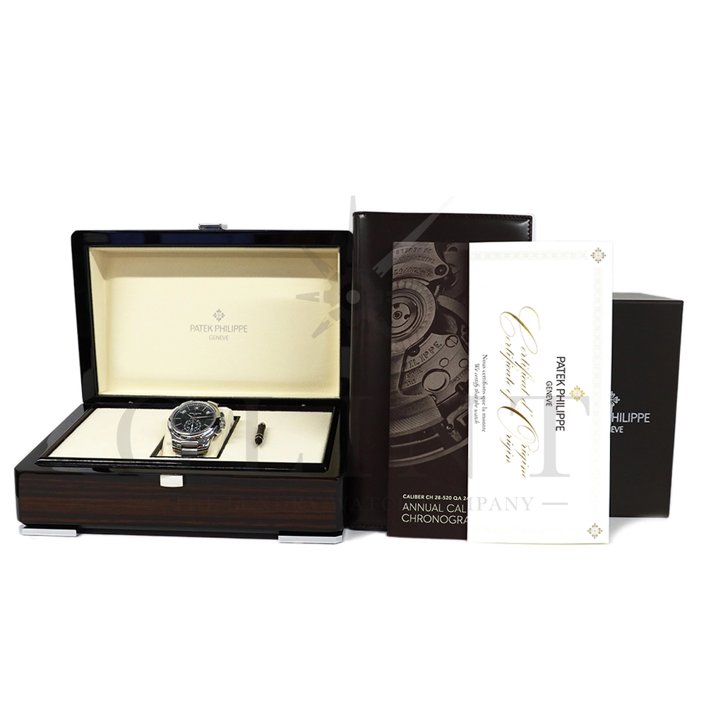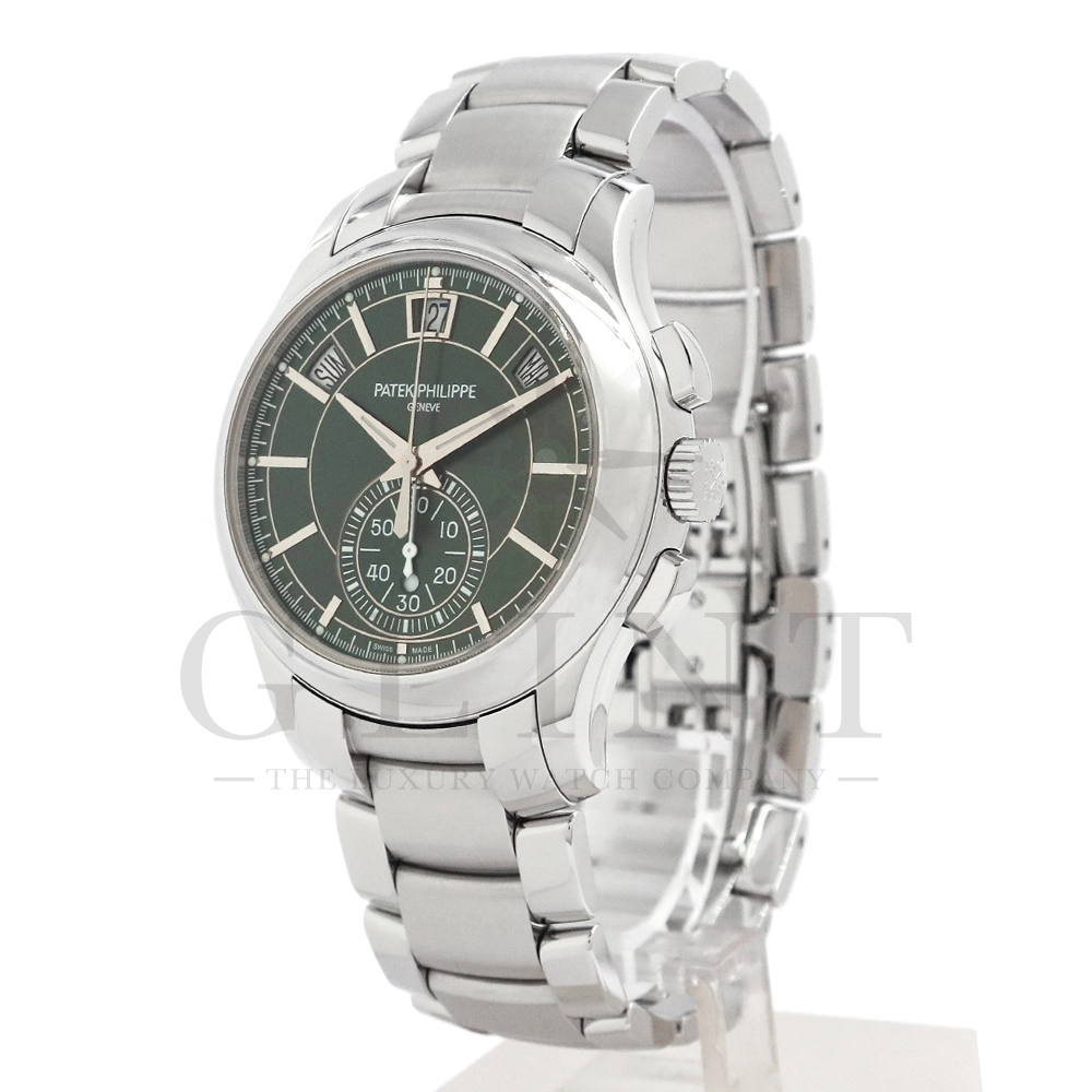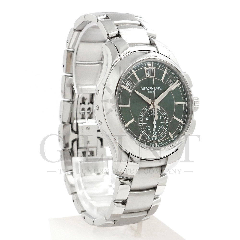 パテックフィリップ コンプリケーション アニュアルカレンダー フライバック・クロノグラフ 5905/1A-001です。ケース素材には同シリーズ初のステンレスを使用。搭載されている年次カレンダー(アニュアルカレンダー)はパテックフィリップが約4年もの月日を費やし、1996年に特許を取得した複雑機構。1年に1回(2月以外)調整するだけで、毎日の日付、曜日、月名を自動表示してくれます。シースルーバックからはそのムーブメントの動きを心ゆくまでお楽しみにになれるでしょう。深みのあるグリーンの文字盤により、ステンレスながらも洗練された高級感を与えてくれる仕上がりとなっております。世界最高の高級時計ブランドの技術が結集された逸品を是非この機会にご堪能下さい。