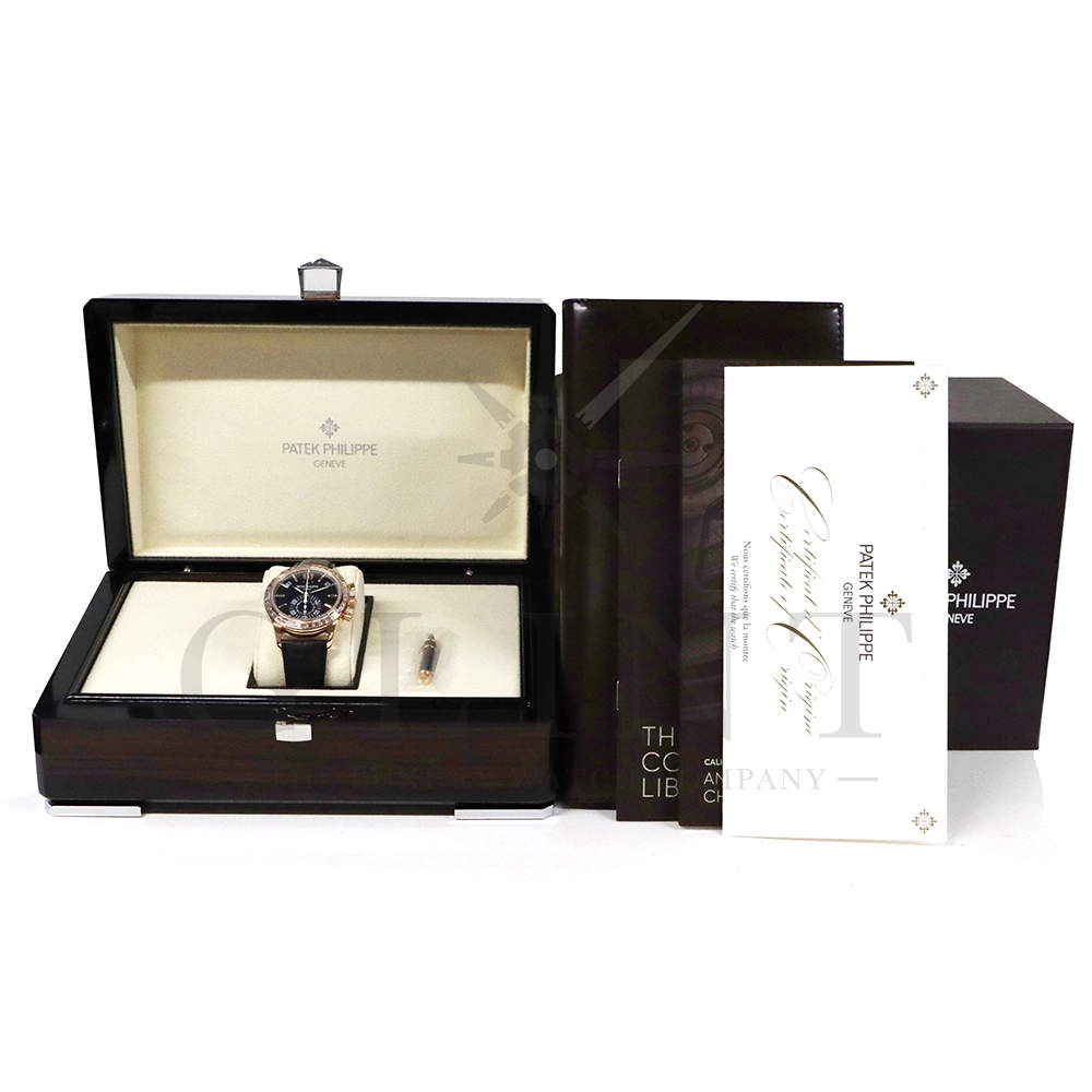 こちらはパテックフィリップ コンプリケーション アニュアルカレンダー クロノグラフです。ケース素材にはローズゴールドを使用。そしてベゼルにはIFクラスとなる36個のバゲットカットダイヤモンド、落ち着きのあるエボニーブラックの文字盤には8個のバゲットダイヤモンドがジェムセッティングされ、筆舌に尽くしがたい高級感を堪能できます。そして搭載されている年次カレンダー(アニュアルカレンダー)はパテックフィリップが約4年もの月日を費やし、1996年に特許を取得した複雑機構。1年に1回(2月以外)調整するだけで、毎日の日付、曜日、月名を自動表示してくれます。シースルーバックからはそのムーブメントの動きを心ゆくまでお楽しみになれるでしょう。全体的にブラックカラーで統一された落ち着いた雰囲気の中に美しく輝く極上のバゲットダイヤモンドが所有者を格別な思いに浸らせてくれる事は間違いありません。