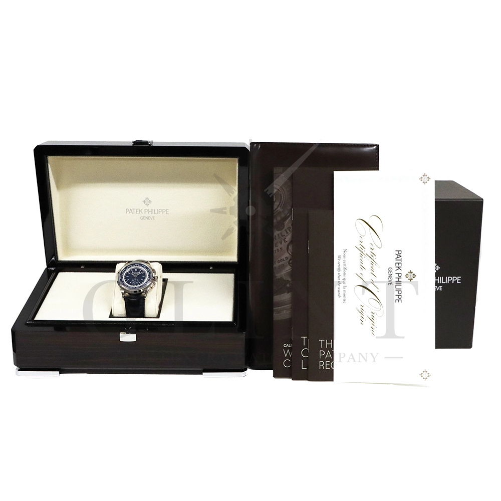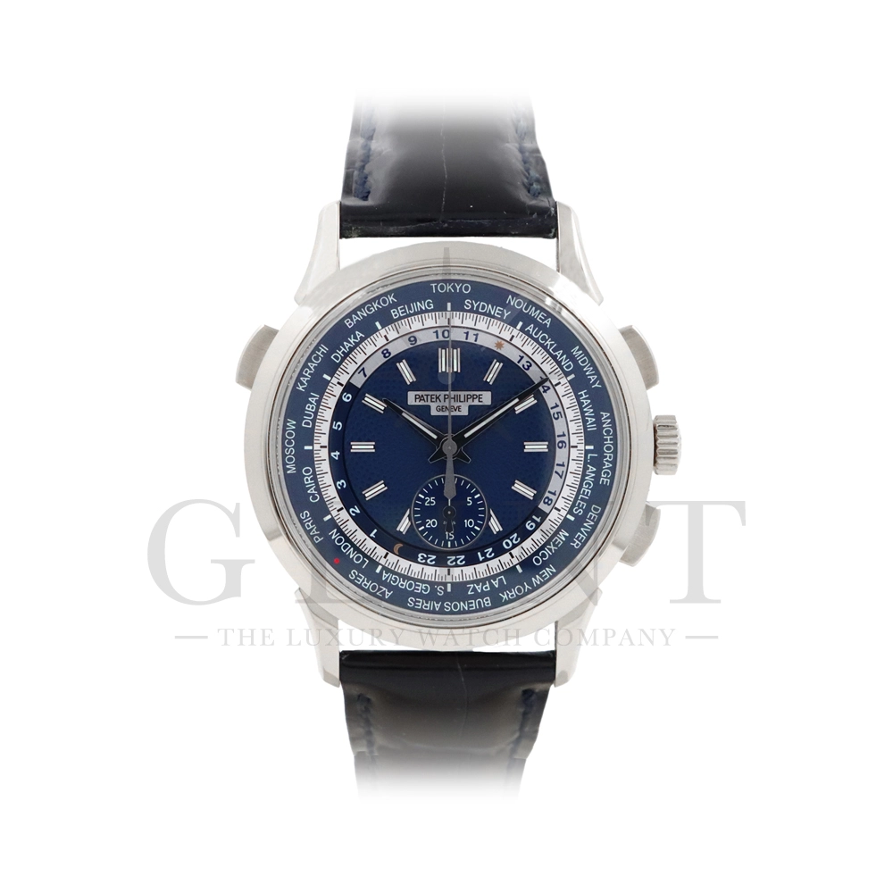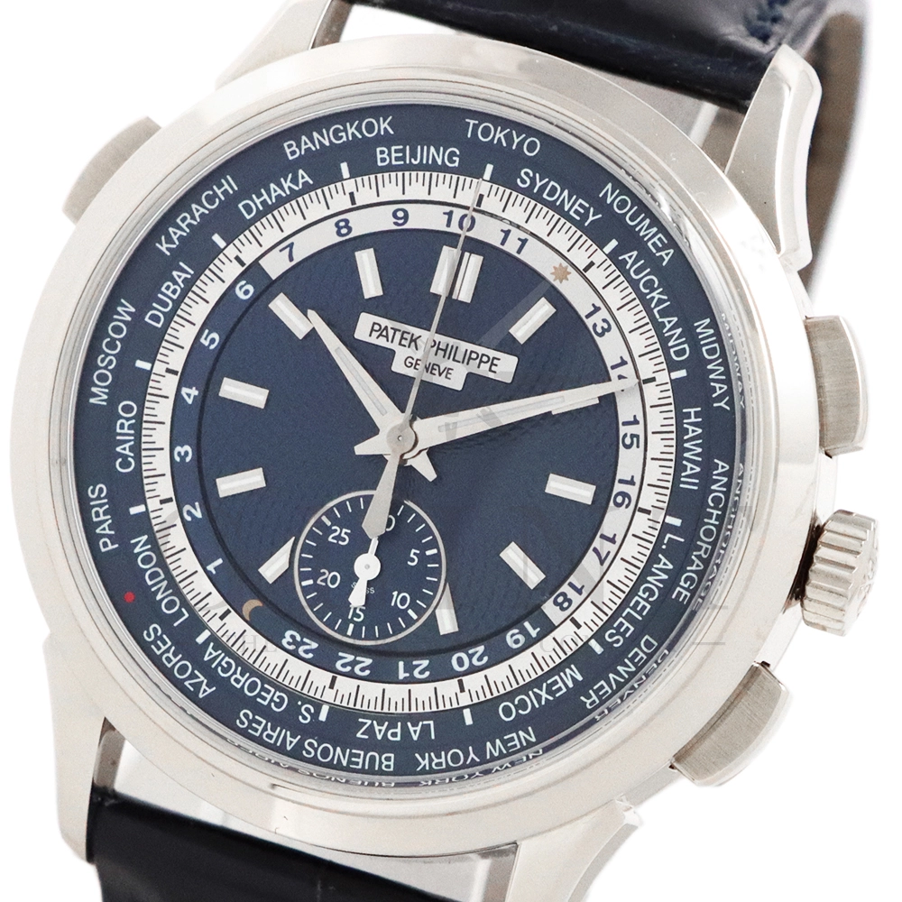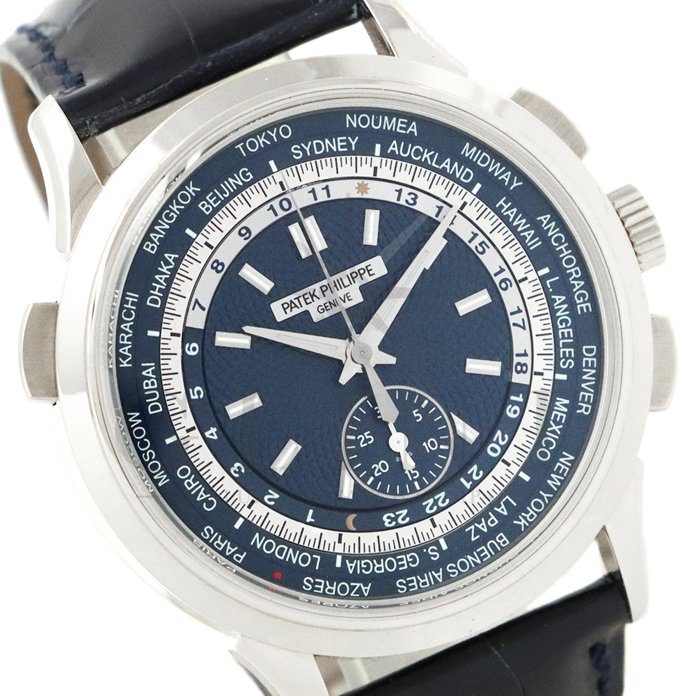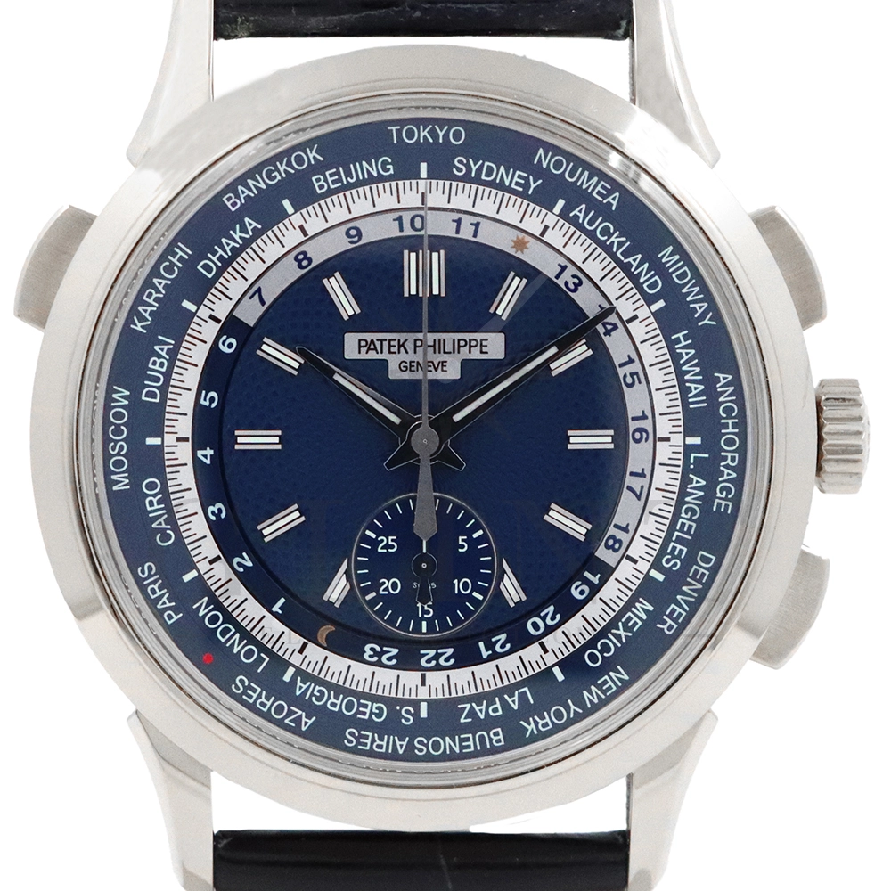 こちらはパテックフィリップ コンプリケーション ワールドタイム・クロノグラフです。パテックフィリップ史上初となるクロノグラフが搭載されたワールドタイム。2つの機能をこれまでにない新しい方法で統合したムーブメント「Cal.CH 28-520 HU」を搭載しています。垂直クラッチ搭載のフライバック付きで、クロノグラフの秒針を通常の秒針としての使用する事が可能です。文字盤にはブルー・オパーリンを採用し、ダイアルセンターにはギョーシェ装飾が施されております。センターダイアルの周囲に、二重の回転リングをもち、10時位置のプッシュボタン操作と同期すること(カップリング機構)で、世界24都市の現地時間が一目で読み取れるようにな。外周リングには、「24の都市名」が記載され、内周リングには「24時間表示の時間目盛」が記載され、視認性の高い仕上がりです。唯一無二の高級感を演出してくれる至極の一本です。