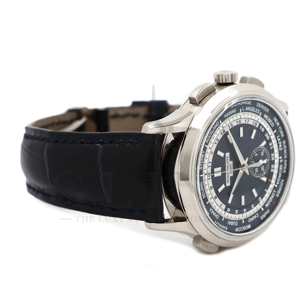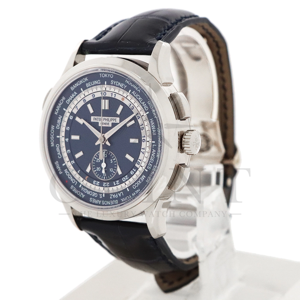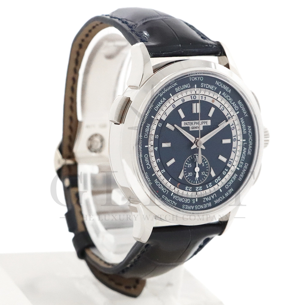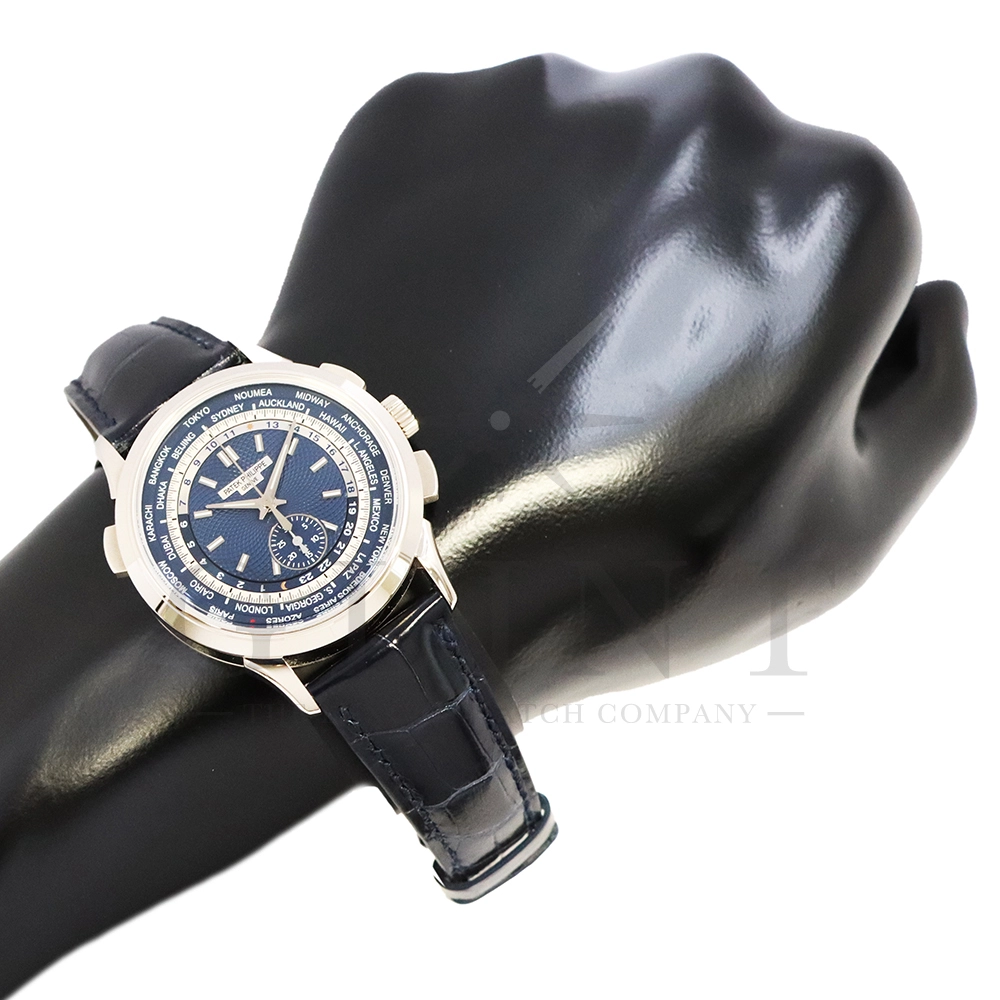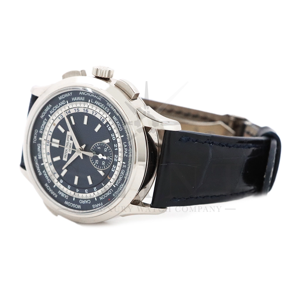 こちらはパテックフィリップ コンプリケーション ワールドタイム・クロノグラフです。パテックフィリップ史上初となるクロノグラフが搭載されたワールドタイム。2つの機能をこれまでにない新しい方法で統合したムーブメント「Cal.CH 28-520 HU」を搭載しています。垂直クラッチ搭載のフライバック付きで、クロノグラフの秒針を通常の秒針としての使用する事が可能です。文字盤にはブルー・オパーリンを採用し、ダイアルセンターにはギョーシェ装飾が施されております。センターダイアルの周囲に、二重の回転リングをもち、10時位置のプッシュボタン操作と同期すること(カップリング機構)で、世界24都市の現地時間が一目で読み取れるようにな。外周リングには、「24の都市名」が記載され、内周リングには「24時間表示の時間目盛」が記載され、視認性の高い仕上がりです。唯一無二の高級感を演出してくれる至極の一本です。